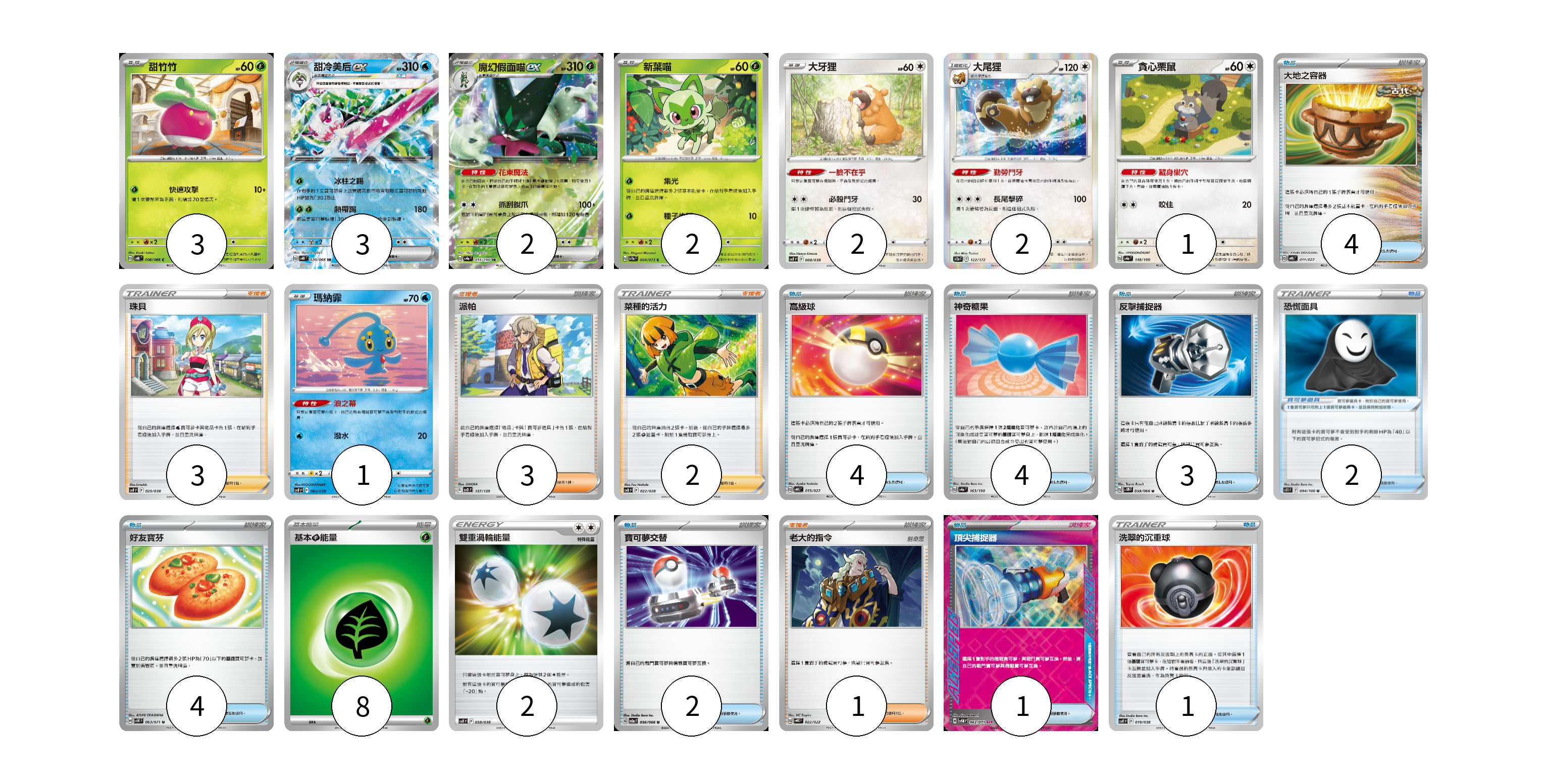 牌組構築方案 以此牌組為基礎新構築牌組 顯示卡面 顯示列表 寶可夢卡(16) 3 3 2 2 2 2 1 1 寶可夢道具(2) 2 物品卡(23) 4 4 4 3 4 2 1 1 支援者卡(9) 3 3 2 1 能量卡(10) 8 2 寶可夢卡(16) 卡牌名稱 張數 卡牌名稱 張數 甜竹竹 SV4K 006/066 03 甜冷美后ex SV4K 020/066 03 魔幻假面喵ex SV4a 014/190 02 新葉喵 SV1a 004/073 02 大牙狸 SVF 008/038 02 大尾狸 S12a 122/172 02 貪心栗鼠 SV4a 148/190 01 瑪納霏 SVF 003/038 01 寶可夢道具(2) 卡牌名稱 張數 卡牌名稱 張數 恐慌面具 S11 094/100 02 物品卡(23) 卡牌名稱 張數 卡牌名稱 張數 大地之容器 SVHK 011/022 04 高級球 SVHK 013/022 04 神奇糖果 SV4a 163/190 04 反擊捕捉器 SV4M 059/066 03 好友寶芬 SV5K 063/071 04 寶可夢交替 SV5a 056/066 02 頂尖捕捉器 SV5M 062/071 01 洗翠的沉重球 SVF 019/038 01 支援者卡(9) 卡牌名稱 張數 卡牌名稱 張數 珠貝 SVF 025/038 03 派帕 SVD 137/139 03 菜種的活力 SVB 022/028 02 老大的指令 SVHK 022/022 01 能量卡(10) 卡牌名稱 張數 卡牌名稱 張數 基本【草】能量 SVF GRA 08 雙重渦輪能量 SVF 038/038 02 以此牌組為基礎新構築牌組 牌組編碼 IwJKtf-XjjoIp-EoeLYF copy 列印牌組單 牌組編碼已複製 分享至SNS