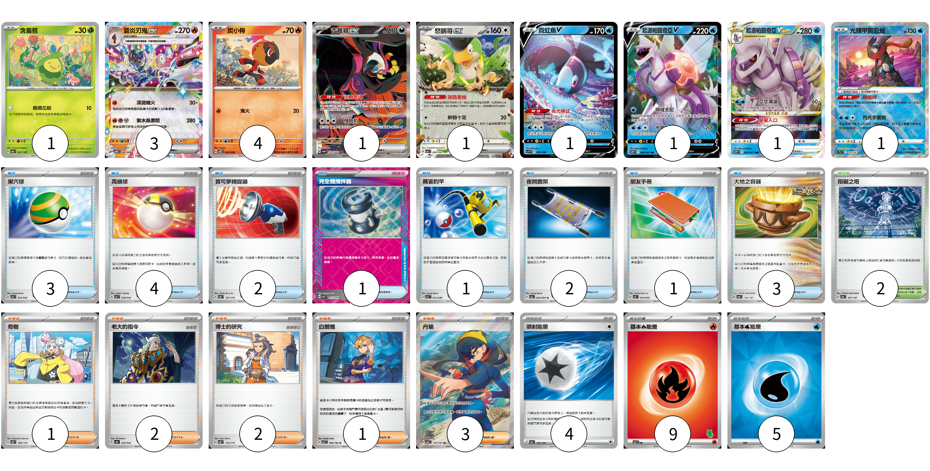 牌組構築方案 以此牌組為基礎新構築牌組 顯示卡面 顯示列表 寶可夢卡(14) 1 3 4 1 1 1 1 1 1 物品卡(17) 3 4 2 1 1 2 1 3 支援者卡(9) 1 2 2 1 3 競技場卡(2) 2 能量卡(18) 4 9 5 寶可夢卡(14) 卡牌名稱 張數 卡牌名稱 張數 含羞苞 SV8a 001/187 01 蒼炎刃鬼ex SVPS 006/008 03 炭小侍 SVPS 005/008 04 吉雉雞ex SV6a 089/064 01 怒鸚哥ex SVK 006/042 01 霓虹魚V SVF 002/038 01 起源帕路奇亞V S10P 022/067 01 起源帕路奇亞VSTAR S10P 023/067 01 光輝甲賀忍蛙 S9a 026/067 01 物品卡(17) 卡牌名稱 張數 卡牌名稱 張數 巢穴球 SVK 016/042 03 高級球 SVK 018/042 04 寶可夢捕捉器 SVM 137/175 02 完全體攪拌器 SVK 017/042 01 厲害釣竿 SVF 013/038 01 夜間擔架 SV6a 056/064 02 朋友手冊 SVK 014/042 01 大地之容器 SV8a 143/187 03 支援者卡(9) 卡牌名稱 張數 卡牌名稱 張數 奇樹 SVM 160/175 01 老大的指令 SVHK 022/022 02 博士的研究 SVM 170/175 02 白蕾雅 SV7 100/102 01 丹瑜 SV6 123/101 03 競技場卡(2) 卡牌名稱 張數 卡牌名稱 張數 阻礙之塔 SV8a 181/187 02 能量卡(18) 卡牌名稱 張數 卡牌名稱 張數 噴射能量 SV8a 185/187 04 基本【火】能量 SVI FIR 09 基本【水】能量 SVK WAT 05 以此牌組為基礎新構築牌組 牌組編碼 JCGnwx-lGCeIH-oeyeSo copy 列印牌組單 牌組編碼已複製 分享至SNS