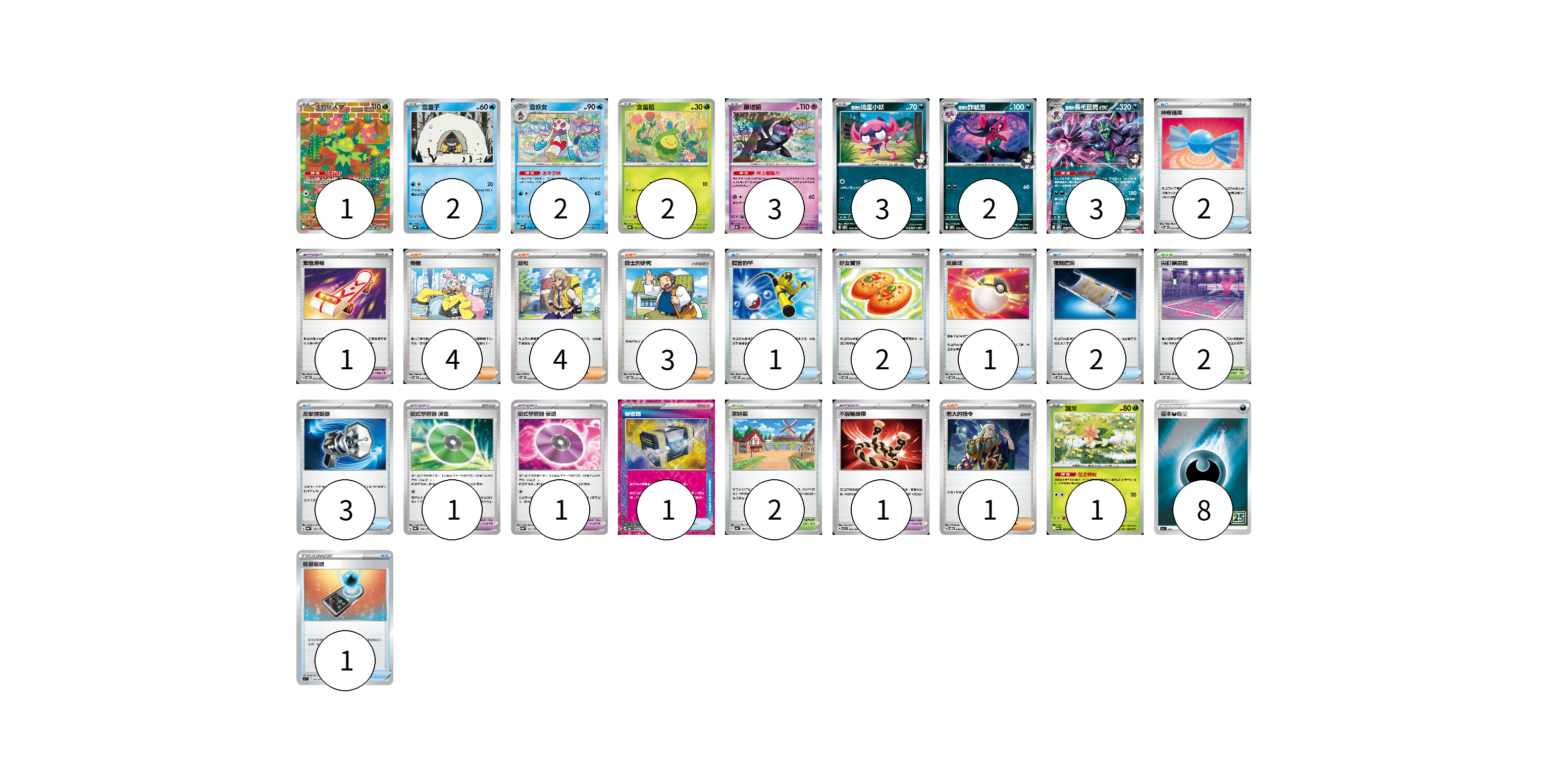 牌組構築方案 以此牌組為基礎新構築牌組 顯示卡面 顯示列表 寶可夢卡(19) 1 2 2 2 3 3 2 3 1 寶可夢道具(4) 1 1 1 1 物品卡(13) 2 1 2 1 2 3 1 1 支援者卡(12) 4 4 3 1 競技場卡(4) 2 2 能量卡(8) 8 寶可夢卡(19) 卡牌名稱 張數 卡牌名稱 張數 沙鈴仙人掌 SV9 101/100 01 雪童子 SV8a 037/187 02 雪妖女 SV8a 038/187 02 含羞苞 SV8a 001/187 02 願增猿 SV8a 075/187 03 <瑪俐的>搗蛋小妖 SVOM 005/021 03 <瑪俐的>詐唬魔 SVOM 006/021 02 <瑪俐的>長毛巨魔ex SVOM 007/021 03 謝米 SV9a 006/063 01 寶可夢道具(4) 卡牌名稱 張數 卡牌名稱 張數 緊急滑板 SVOD 015/020 01 招式學習器 演進 SV8a 160/187 01 招式學習器 衰退 SV8a 161/187 01 不服輸頭帶 SVTL 016/021 01 物品卡(13) 卡牌名稱 張數 卡牌名稱 張數 神奇糖果 SVOD 013/020 02 厲害釣竿 SVOM 011/021 01 好友寶芬 SVOM 012/021 02 高級球 SVOM 013/021 01 夜間擔架 SVOM 016/021 02 反擊捕捉器 SV8a 139/187 03 秘密箱 SV6 092/101 01 能量輸送 SI 367/414 01 支援者卡(12) 卡牌名稱 張數 卡牌名稱 張數 奇樹 SVOD 016/020 04 派帕 SVOD 018/020 04 博士的研究 SVOD 017/020 03 老大的指令 SVOD 019/020 01 競技場卡(4) 卡牌名稱 張數 卡牌名稱 張數 尖釘鎮道館 SVOM 021/021 02 深缽鎮 SV4a 185/190 02 能量卡(8) 卡牌名稱 張數 卡牌名稱 張數 基本惡能量 S8a DAR 08 以此牌組為基礎新構築牌組 牌組編碼 JFyFIh-tdOPnt-lzcSGW copy 列印牌組單 牌組編碼已複製 分享至SNS