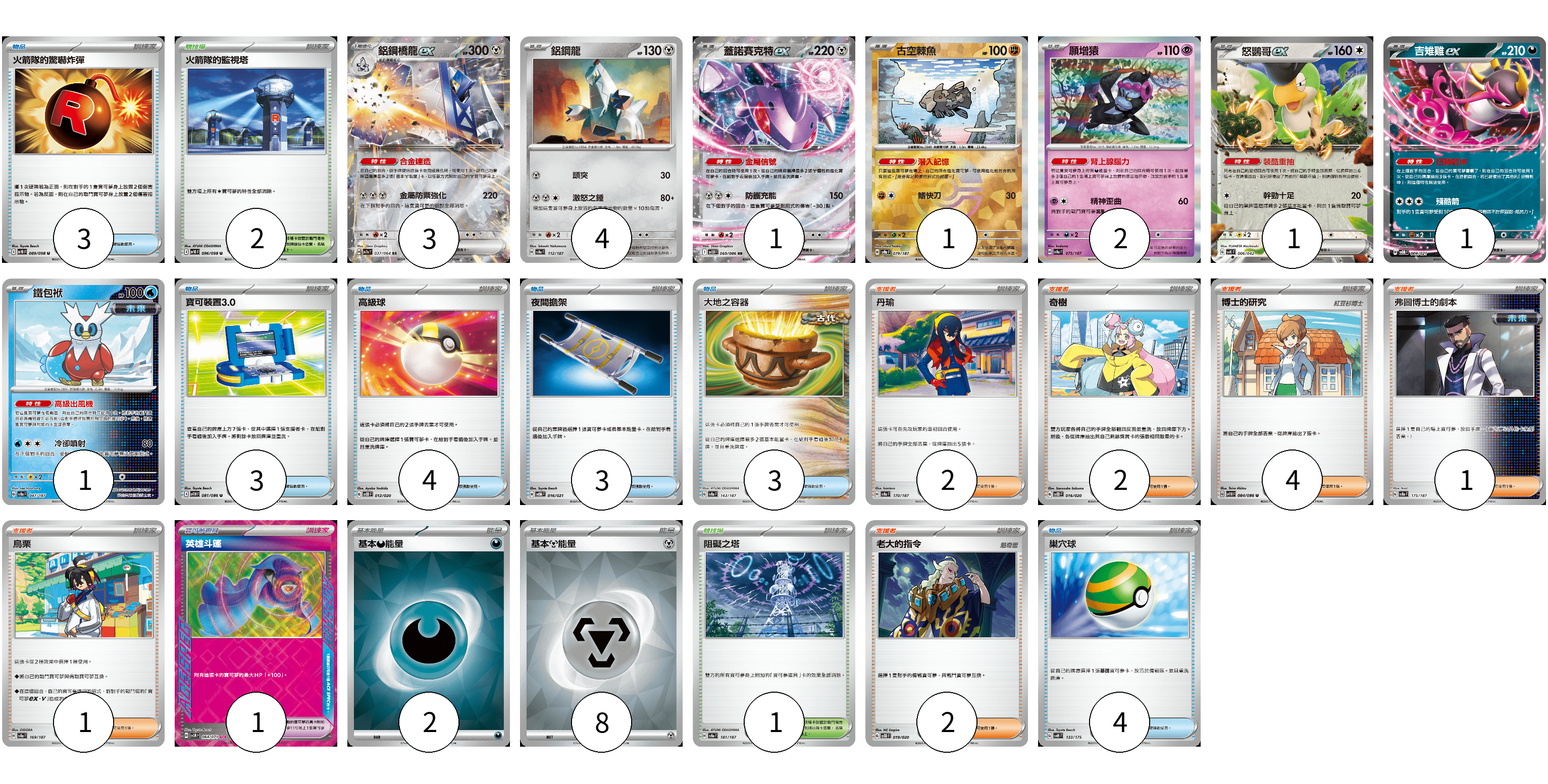 牌組構築方案 以此牌組為基礎新構築牌組 顯示卡面 顯示列表 寶可夢卡(14) 3 4 1 1 2 1 1 1 寶可夢道具(1) 1 物品卡(20) 3 3 4 3 3 4 支援者卡(12) 2 2 4 1 1 2 競技場卡(3) 2 1 能量卡(10) 2 8 寶可夢卡(14) 卡牌名稱 張數 卡牌名稱 張數 鋁鋼橋龍ex SV7a 037/064 03 鋁鋼龍 SV8a 112/187 04 蓋諾賽克特ex SV11B 069/086 01 古空棘魚 SV8a 079/187 01 願增猿 SV8a 075/187 02 怒鸚哥ex SVK 006/042 01 吉雉雞ex SVOM 009/021 01 鐵包袱 SV8a 047/187 01 寶可夢道具(1) 卡牌名稱 張數 卡牌名稱 張數 英雄斗篷 SV5M 064/071 01 物品卡(20) 卡牌名稱 張數 卡牌名稱 張數 火箭隊的驚嚇炸彈 SV10 089/098 03 寶可裝置3.0 SV11B 081/086 03 高級球 SVOD 012/020 04 夜間擔架 SVOM 016/021 03 大地之容器 SV8a 143/187 03 巢穴球 SVM 133/175 04 支援者卡(12) 卡牌名稱 張數 卡牌名稱 張數 丹瑜 SV8a 170/187 02 奇樹 SVOD 016/020 02 博士的研究 SV11B 084/086 04 弗圖博士的劇本 SV8a 175/187 01 烏栗 SV8a 169/187 01 老大的指令 SVOD 019/020 02 競技場卡(3) 卡牌名稱 張數 卡牌名稱 張數 火箭隊的監視塔 SV10 096/098 02 阻礙之塔 SV8a 181/187 01 能量卡(10) 卡牌名稱 張數 卡牌名稱 張數 基本【惡】能量 SVOM DAR 02 基本【鋼】能量 SVOD MET 08 以此牌組為基礎新構築牌組 牌組編碼 JGhXQA-vdtrzT-TbleeK copy 列印牌組單 牌組編碼已複製 分享至SNS