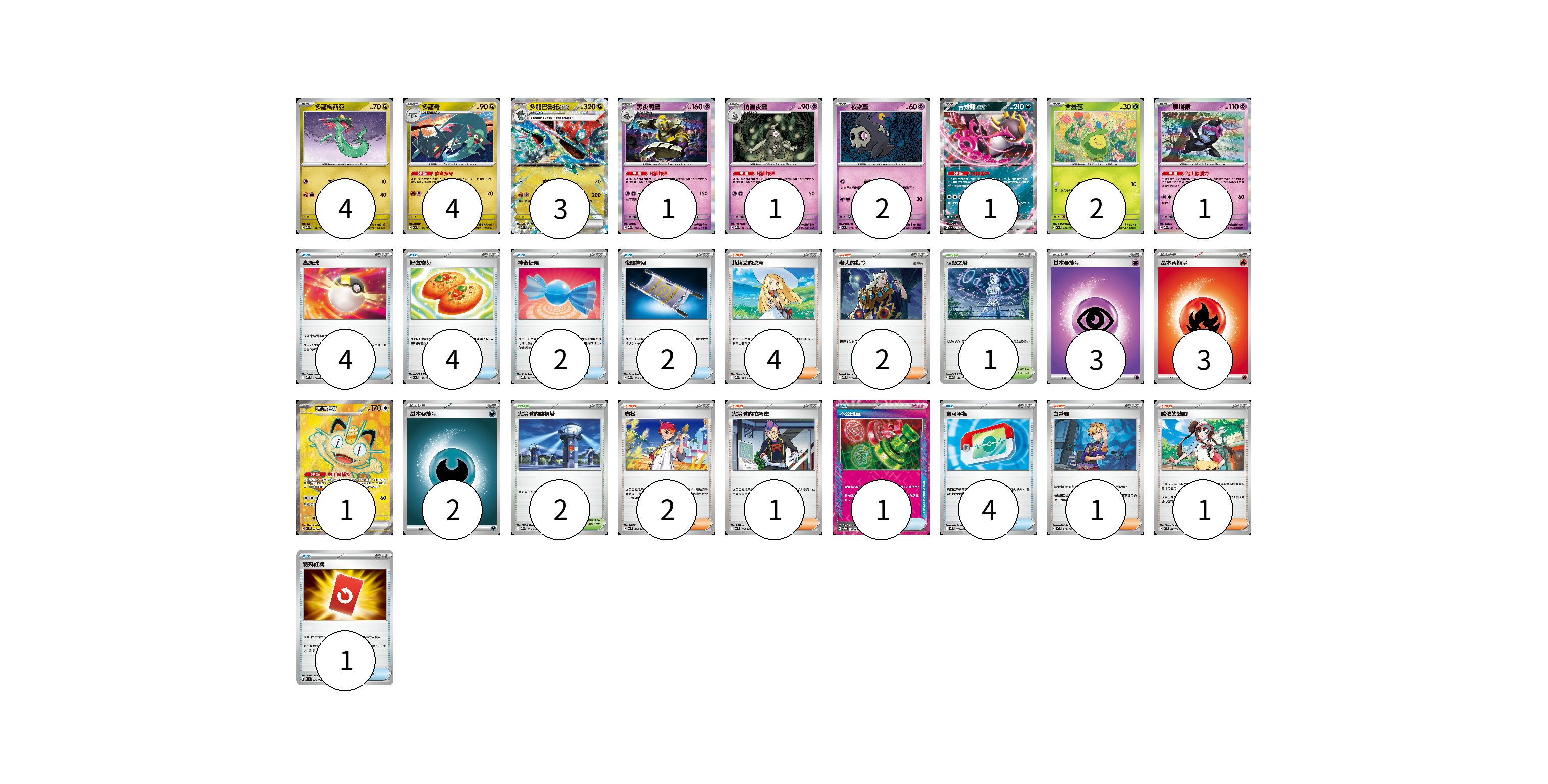 牌組構築方案 以此牌組為基礎新構築牌組 顯示卡面 顯示列表 寶可夢卡(20) 4 4 3 1 1 2 1 2 1 1 物品卡(18) 4 4 2 2 1 4 1 支援者卡(11) 4 2 2 1 1 1 競技場卡(3) 1 2 能量卡(8) 3 3 2 寶可夢卡(20) 卡牌名稱 張數 卡牌名稱 張數 多龍梅西亞 M2a 132/193 04 多龍奇 M2a 133/193 04 多龍巴魯托ex M2a 134/193 03 黑夜魔靈 M2a 074/193 01 彷徨夜靈 M2a 073/193 01 夜巡靈 M2a 072/193 02 吉雉雞ex M2a 114/193 01 含羞苞 M2a 011/193 02 願增猿 M2a 081/193 01 喵喵ex M3 100/080 01 物品卡(18) 卡牌名稱 張數 卡牌名稱 張數 高級球 MBD 014/022 04 好友寶芬 M2a 153/193 04 神奇糖果 MBG 013/022 02 夜間擔架 M2a 159/193 02 不公印章 SV5a 053/066 01 寶可平板 M3 070/080 04 特殊紅牌 M4 072/083 01 支援者卡(11) 卡牌名稱 張數 卡牌名稱 張數 莉莉艾的決意 M2a 175/193 04 老大的指令 MBD 020/022 02 赤松 MC 696/742 02 火箭隊的拉姆達 MC 734/742 01 白蕾雅 MC 722/742 01 鳴依的勉勵 M3 075/080 01 競技場卡(3) 卡牌名稱 張數 卡牌名稱 張數 阻礙之塔 SV8a 181/187 01 火箭隊的監視塔 M2a 189/193 02 能量卡(8) 卡牌名稱 張數 卡牌名稱 張數 基本【超】能量 MBD PSY 03 基本【火】能量 M-P FIR 03 基本【惡】能量 MC DAR 02 以此牌組為基礎新構築牌組 牌組編碼 JHkeSn-dcPteI-fEHByb copy 列印牌組單 牌組編碼已複製 分享至SNS