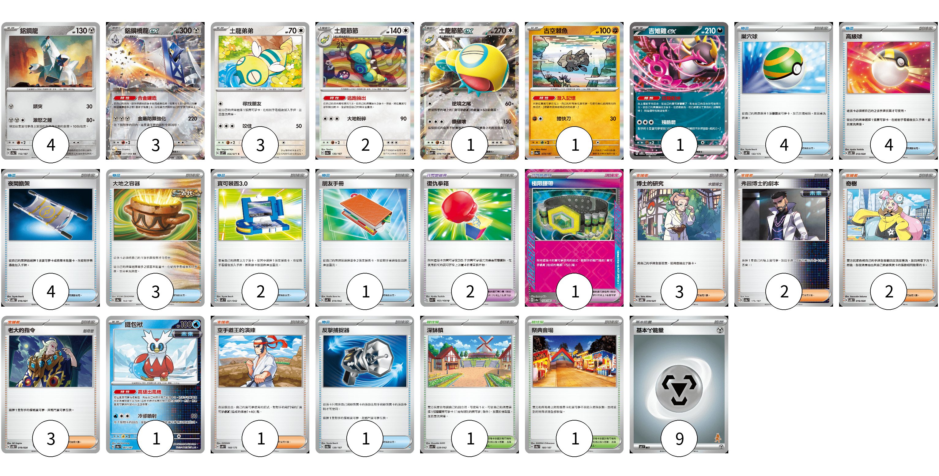 牌組構築方案 以此牌組為基礎新構築牌組 顯示卡面 顯示列表 寶可夢卡(16) 4 3 3 2 1 1 1 1 寶可夢道具(3) 2 1 物品卡(19) 4 4 4 3 2 1 1 支援者卡(11) 3 2 2 3 1 競技場卡(2) 1 1 能量卡(9) 9 寶可夢卡(16) 卡牌名稱 張數 卡牌名稱 張數 鋁鋼龍 SV8a 112/187 04 鋁鋼橋龍ex SV7a 037/064 03 土龍弟弟 SV2P 056/071 03 土龍節節 SV8a 130/187 02 土龍節節ex SV9 079/100 01 古空棘魚 SV8a 079/187 01 吉雉雞ex SVOD 004/020 01 鐵包袱 SV8a 047/187 01 寶可夢道具(3) 卡牌名稱 張數 卡牌名稱 張數 復仇拳箱 SV3 102/108 02 極限腰帶 SV8a 159/187 01 物品卡(19) 卡牌名稱 張數 卡牌名稱 張數 巢穴球 SVM 133/175 04 高級球 SVOD 012/020 04 夜間擔架 SVOM 016/021 04 大地之容器 SV8a 143/187 03 寶可裝置3.0 SVK 021/042 02 朋友手冊 SVK 014/042 01 反擊捕捉器 SV8a 139/187 01 支援者卡(11) 卡牌名稱 張數 卡牌名稱 張數 博士的研究 SVOM 019/021 03 弗圖博士的劇本 SV8a 175/187 02 奇樹 SVOD 016/020 02 老大的指令 SVOD 019/020 03 空手道王的演練 SVM 148/175 01 競技場卡(2) 卡牌名稱 張數 卡牌名稱 張數 深缽鎮 SVK 039/042 01 祭典會場 SV8a 180/187 01 能量卡(9) 卡牌名稱 張數 卡牌名稱 張數 基本【鋼】能量 SVI MET 09 以此牌組為基礎新構築牌組 牌組編碼 JIAJxZ-fFNFrw-KJjEBv copy 列印牌組單 牌組編碼已複製 分享至SNS