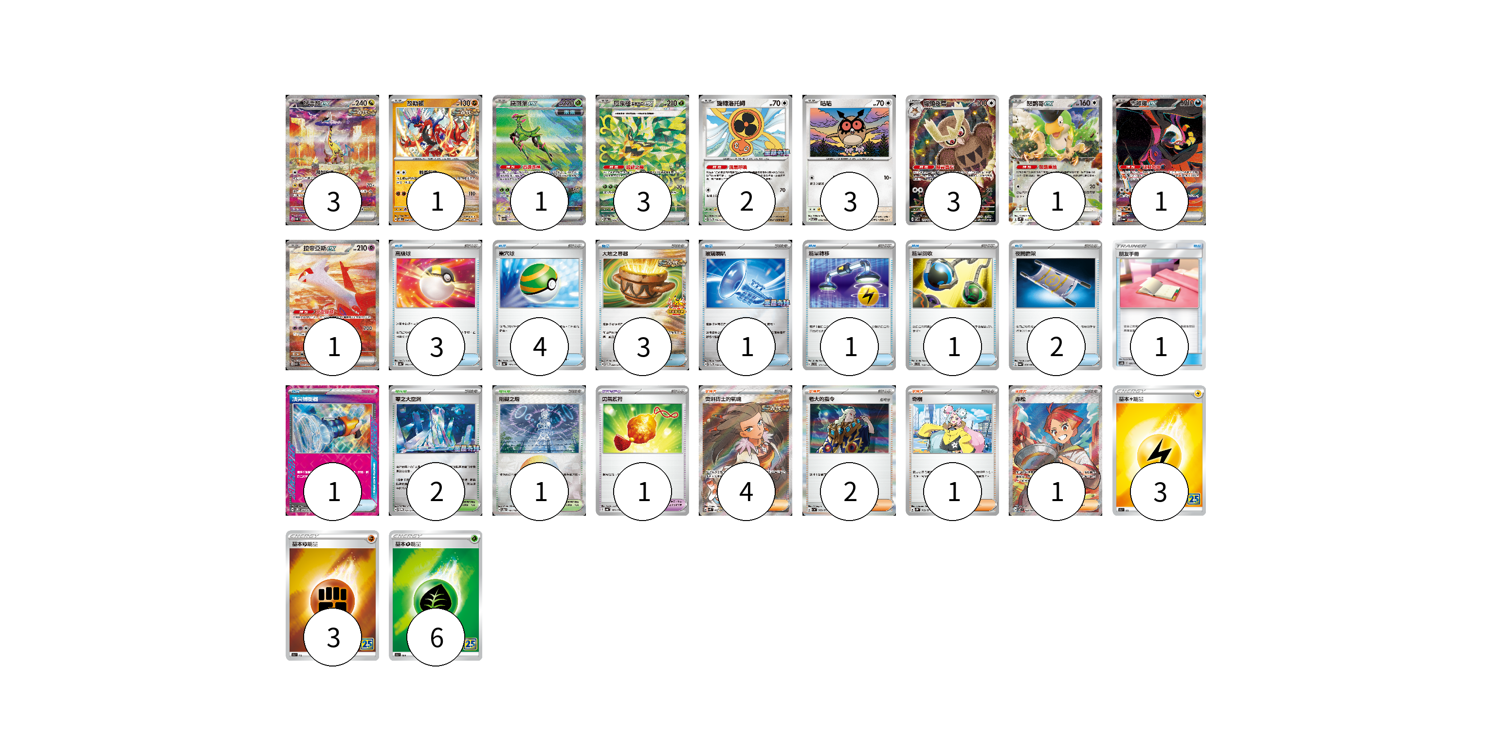 牌組構築方案 以此牌組為基礎新構築牌組 顯示卡面 顯示列表 寶可夢卡(19) 3 1 1 3 2 3 3 1 1 1 寶可夢道具(1) 1 物品卡(17) 3 4 3 1 1 1 2 1 1 支援者卡(8) 4 2 1 1 競技場卡(3) 2 1 能量卡(12) 3 3 6 寶可夢卡(19) 卡牌名稱 張數 卡牌名稱 張數 猛雷鼓ex SV5K 095/071 03 故勒頓 SV8 069/106 01 鐵斑葉ex SV5M 093/071 01 厄鬼椪 碧草面具ex SV6 125/101 03 旋轉洛托姆 SV-P 146/SV-P 02 咕咕 SV7 076/102 03 貓頭夜鷹 SV7 114/102 03 怒鸚哥ex SV2P 065/071 01 吉雉雞ex SV6a 089/064 01 拉帝亞斯ex SV7a 087/064 01 寶可夢道具(1) 卡牌名稱 張數 卡牌名稱 張數 勇氣護符 SV4a 169/190 01 物品卡(17) 卡牌名稱 張數 卡牌名稱 張數 高級球 SV4a 161/190 03 巢穴球 SV4a 159/190 04 大地之容器 SV-P 084/SV-P 03 玻璃喇叭 SV-P 149/SV-P 01 能量轉移 SVD 111/139 01 能量回收 SVD 110/139 01 夜間擔架 SV6a 056/064 02 朋友手冊 AS6b 188/194 01 頂尖捕捉器 SV5M 062/071 01 支援者卡(8) 卡牌名稱 張數 卡牌名稱 張數 奧琳博士的氣魄 SV4K 085/066 04 老大的指令 SV1a 069/073 02 奇樹 SV2D 069/071 01 赤松 SV7 123/102 01 競技場卡(3) 卡牌名稱 張數 卡牌名稱 張數 零之大空洞 SV-P 151/SV-P 02 阻礙之塔 SV8a 181/187 01 能量卡(12) 卡牌名稱 張數 卡牌名稱 張數 基本雷能量 S8a LIG 03 基本鬥能量 S8a FIG 03 基本草能量 S8a GRA 06 以此牌組為基礎新構築牌組 牌組編碼 JIcOQV-FkHoVG-ElexYy copy 列印牌組單 牌組編碼已複製 分享至SNS
