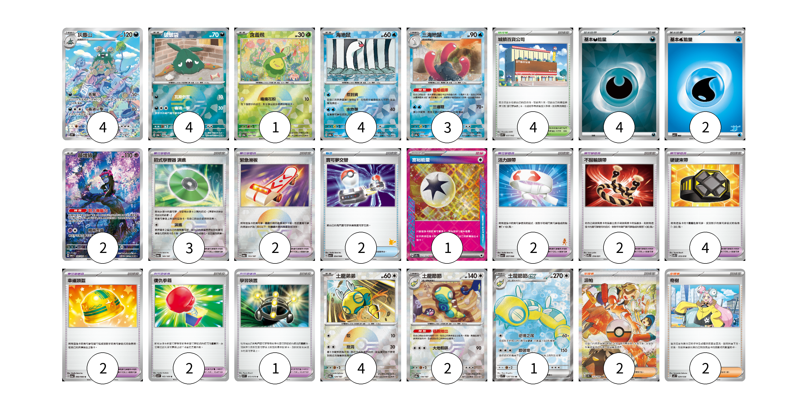 牌組構築方案 以此牌組為基礎新構築牌組 顯示卡面 顯示列表 寶可夢卡(25) 4 4 1 4 3 2 4 2 1 寶可夢道具(18) 3 2 2 2 4 2 2 1 物品卡(2) 2 支援者卡(4) 2 2 競技場卡(4) 4 能量卡(7) 4 2 1 寶可夢卡(25) 卡牌名稱 張數 卡牌名稱 張數 灰塵山 SV4K 075/066 04 破破袋 SV8a 094/187 04 含羞苞 SV8a 001/187 01 海地鼠 SV8a 042/187 04 三海地鼠 SV8a 043/187 03 願增猿 SV6 107/101 02 土龍弟弟 SV8a 129/187 04 土龍節節 SV8a 130/187 02 土龍節節ex SV9 120/100 01 寶可夢道具(18) 卡牌名稱 張數 卡牌名稱 張數 招式學習器 演進 SV8a 160/187 03 緊急滑板 SV8a 153/187 02 活力頭帶 SVI 057/066 02 不服輸頭帶 SVTL 016/021 02 硬硬束帶 SVTH 013/018 04 幸運頭盔 SV5a 060/066 02 復仇拳箱 SV3 102/108 02 學習裝置 SV1S 072/078 01 物品卡(2) 卡牌名稱 張數 卡牌名稱 張數 寶可夢交替 SVI 054/066 02 支援者卡(4) 卡牌名稱 張數 卡牌名稱 張數 派帕 SV4a 353/190 02 奇樹 SVF 029/038 02 競技場卡(4) 卡牌名稱 張數 卡牌名稱 張數 城鎮百貨公司 SVK 037/042 04 能量卡(7) 卡牌名稱 張數 卡牌名稱 張數 基本【惡】能量 SVOM DAR 04 基本【水】能量 SVI WAT 02 富裕能量 SV7a 064/064 01 以此牌組為基礎新構築牌組 牌組編碼 JIeJGB-YYIZhV-BGKinO copy 列印牌組單 牌組編碼已複製 分享至SNS