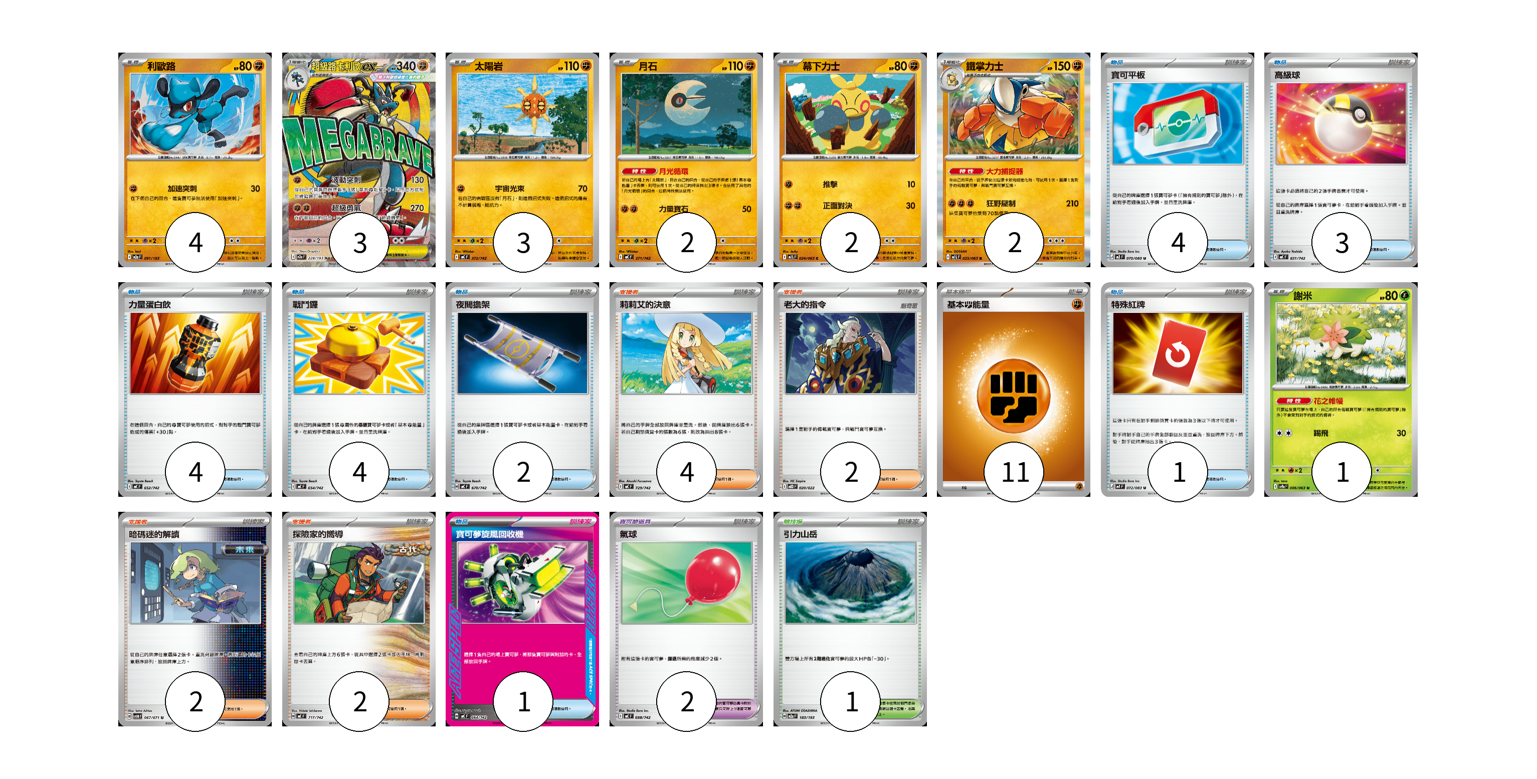 牌組構築方案 以此牌組為基礎新構築牌組 顯示卡面 顯示列表 寶可夢卡(17) 4 3 3 2 2 2 1 寶可夢道具(2) 2 物品卡(19) 4 3 4 4 2 1 1 支援者卡(10) 4 2 2 2 競技場卡(1) 1 能量卡(11) 11 寶可夢卡(17) 卡牌名稱 張數 卡牌名稱 張數 利歐路 M2a 091/193 04 超級路卡利歐ex M2a 228/193 03 太陽岩 MC 372/742 03 月石 MC 371/742 02 幕下力士 M1L 024/063 02 鐵掌力士 M1L 025/063 02 謝米 SV9a 006/063 01 寶可夢道具(2) 卡牌名稱 張數 卡牌名稱 張數 氣球 MC 688/742 02 物品卡(19) 卡牌名稱 張數 卡牌名稱 張數 寶可平板 M3 070/080 04 高級球 MC 651/742 03 力量蛋白飲 MC 652/742 04 戰鬥鑼 MC 654/742 04 夜間擔架 MC 670/742 02 特殊紅牌 M4 072/083 01 寶可夢旋風回收機 MC 664/742 01 支援者卡(10) 卡牌名稱 張數 卡牌名稱 張數 莉莉艾的決意 MC 729/742 04 老大的指令 MBD 020/022 02 暗碼迷的解讀 SV5M 067/071 02 探險家的嚮導 MC 717/742 02 競技場卡(1) 卡牌名稱 張數 卡牌名稱 張數 引力山岳 M2a 183/193 01 能量卡(11) 卡牌名稱 張數 卡牌名稱 張數 基本【鬥】能量 MC FIG 11 以此牌組為基礎新構築牌組 牌組編碼 JKehqa-zGAWNh-JCuHEz copy 列印牌組單 牌組編碼已複製 分享至SNS