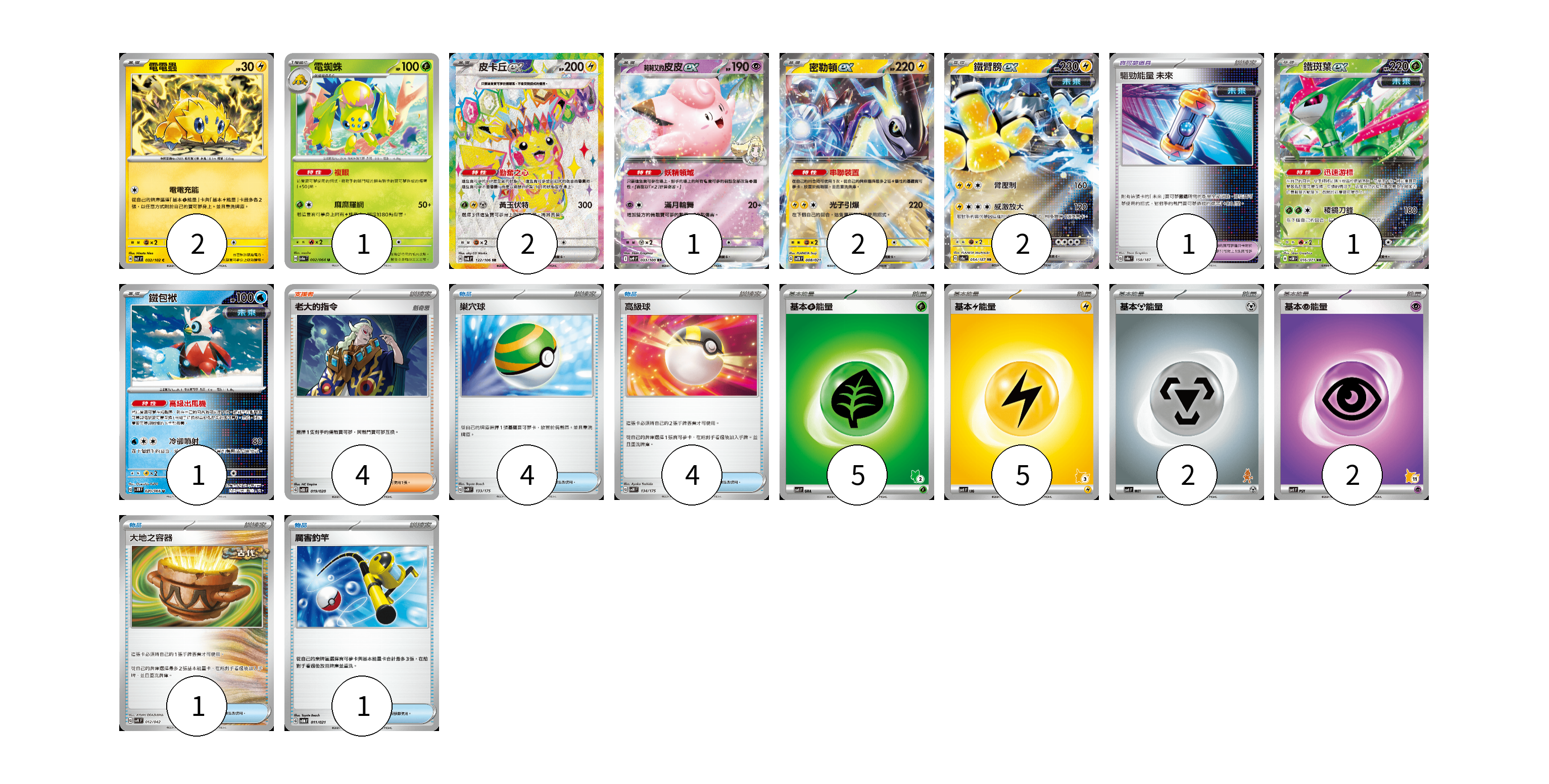 牌組構築方案 以此牌組為基礎新構築牌組 顯示卡面 顯示列表 寶可夢卡(12) 2 1 2 1 2 2 1 1 寶可夢道具(1) 1 物品卡(10) 4 4 1 1 支援者卡(4) 4 能量卡(14) 5 5 2 2 寶可夢卡(12) 卡牌名稱 張數 卡牌名稱 張數 電電蟲 SV7 032/102 02 電蜘蛛 SV6a 002/064 01 皮卡丘ex SV8 122/106 02 莉莉艾的皮皮ex SV9 033/100 01 密勒頓ex SVTR 008/021 02 鐵臂膀ex SV8a 054/187 02 鐵斑葉ex SV5M 016/071 01 鐵包袱 SV4M 020/066 01 寶可夢道具(1) 卡牌名稱 張數 卡牌名稱 張數 驅勁能量 未來 SV8a 158/187 01 物品卡(10) 卡牌名稱 張數 卡牌名稱 張數 巢穴球 SVM 133/175 04 高級球 SVM 134/175 04 大地之容器 SVK 012/042 01 厲害釣竿 SVOM 011/021 01 支援者卡(4) 卡牌名稱 張數 卡牌名稱 張數 老大的指令 SVOD 019/020 04 能量卡(14) 卡牌名稱 張數 卡牌名稱 張數 基本【草】能量 SVI GRA 05 基本【雷】能量 SVI LIG 05 基本【鋼】能量 SVI MET 02 基本【超】能量 SVI PSY 02 以此牌組為基礎新構築牌組 牌組編碼 JLnOLh-bFLEih-fNaHPe copy 列印牌組單 牌組編碼已複製 分享至SNS