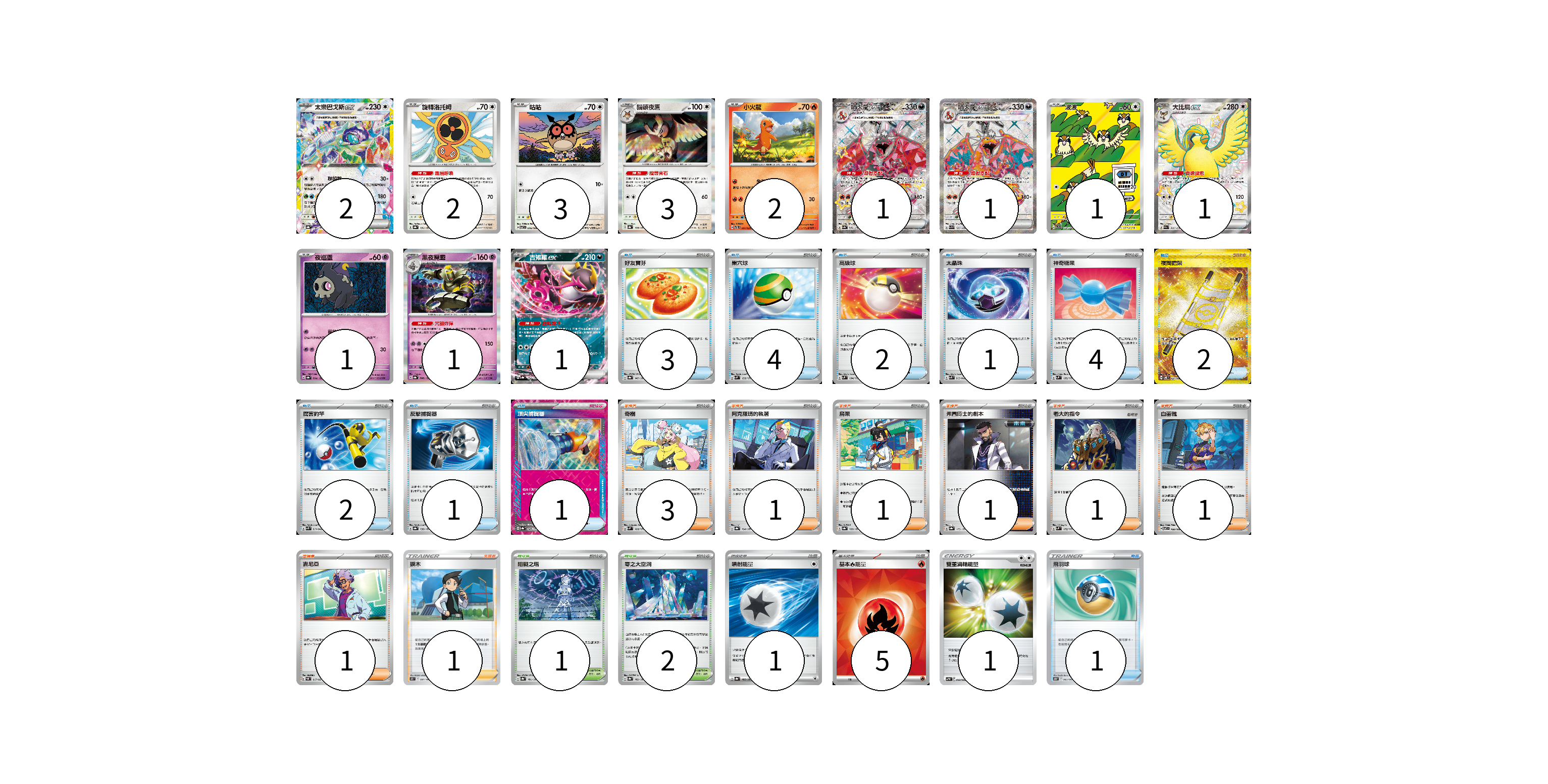 牌組構築方案 以此牌組為基礎新構築牌組 顯示卡面 顯示列表 寶可夢卡(19) 2 2 3 3 2 1 1 1 1 1 1 1 物品卡(21) 3 4 2 1 4 2 2 1 1 1 支援者卡(10) 3 1 1 1 1 1 1 1 競技場卡(3) 1 2 能量卡(7) 1 5 1 寶可夢卡(19) 卡牌名稱 張數 卡牌名稱 張數 太樂巴戈斯ex SV8a 136/187 02 旋轉洛托姆 SV8a 131/187 02 咕咕 SV7 076/102 03 貓頭夜鷹 SV8a 128/187 03 小火龍 SVTL 001/021 02 噴火龍ex SV4a 331/190 01 噴火龍ex SV3 125/108 01 波波 SV3 118/108 01 大比鳥ex SV4a 335/190 01 夜巡靈 SV8a 064/187 01 黑夜魔靈 SV8a 066/187 01 吉雉雞ex SV8a 104/187 01 物品卡(21) 卡牌名稱 張數 卡牌名稱 張數 好友寶芬 SV8a 147/187 03 巢穴球 SVM 133/175 04 高級球 SVM 134/175 02 太晶珠 SVK 013/042 01 神奇糖果 SVM 135/175 04 夜間擔架 SV8 137/106 02 厲害釣竿 SVK 011/042 02 反擊捕捉器 SV8a 139/187 01 頂尖捕捉器 SV8a 148/187 01 飛羽球 S10D 063/067 01 支援者卡(10) 卡牌名稱 張數 卡牌名稱 張數 奇樹 SVM 160/175 03 阿克羅瑪的執著 SV8a 164/187 01 烏栗 SV8a 169/187 01 弗圖博士的劇本 SV8a 175/187 01 老大的指令 SVM 172/175 01 白蕾雅 SV7 100/102 01 吉尼亞 SVAL 017/021 01 捩木 S11 097/100 01 競技場卡(3) 卡牌名稱 張數 卡牌名稱 張數 阻礙之塔 SV8a 181/187 01 零之大空洞 SV8a 182/187 02 能量卡(7) 卡牌名稱 張數 卡牌名稱 張數 噴射能量 SV8a 185/187 01 基本【火】能量 SVK FIR 05 雙重渦輪能量 SVTM 022/022 01 以此牌組為基礎新構築牌組 牌組編碼 JMUOKd-ofdEjf-LvywQN copy 列印牌組單 牌組編碼已複製 分享至SNS