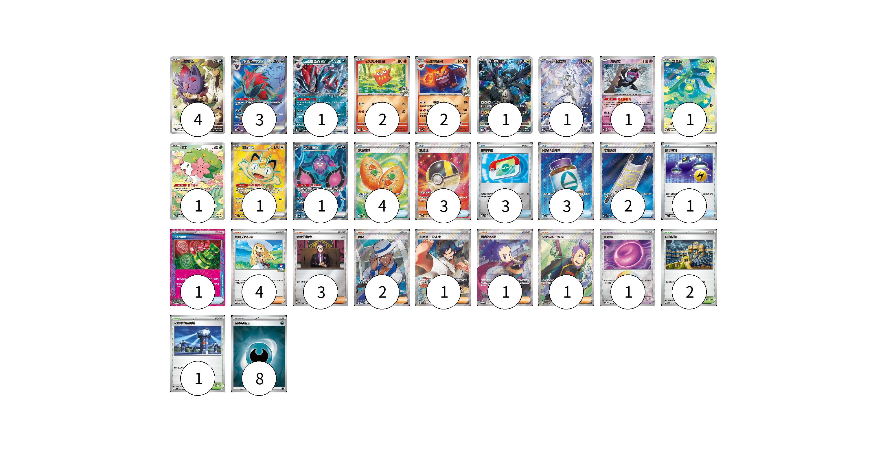 牌組構築方案 以此牌組為基礎新構築牌組 顯示卡面 顯示列表 寶可夢卡(19) 4 3 1 2 2 1 1 1 1 1 1 1 寶可夢道具(1) 1 物品卡(17) 4 3 3 3 2 1 1 支援者卡(12) 4 3 2 1 1 1 競技場卡(3) 2 1 能量卡(8) 8 寶可夢卡(19) 卡牌名稱 張數 卡牌名稱 張數 N的索羅亞 SV9 108/100 04 N的索羅亞克ex SV9 117/100 03 N的索羅亞克ex SV9 061/100 01 N的火紅不倒翁 M2a 027/193 02 N的達摩狒狒 M2a 028/193 02 N的捷克羅姆 M2a 210/193 01 N的萊希拉姆 SV9 109/100 01 願增猿 SV8a 075/187 01 含羞苞 M2a 196/193 01 謝米 SV9a 066/063 01 喵喵ex M3 100/080 01 桃歹郎ex SV6a 082/064 01 寶可夢道具(1) 卡牌名稱 張數 卡牌名稱 張數 鎖鏈糬 SV8a 154/187 01 物品卡(17) 卡牌名稱 張數 卡牌名稱 張數 好友寶芬 M1S 081/063 04 高級球 M2a 216/193 03 寶可平板 MC 662/742 03 N的PP提升劑 M2a 214/193 03 夜間擔架 M1L 083/063 02 能量轉移 MC 638/742 01 不公印章 SV5a 053/066 01 支援者卡(12) 卡牌名稱 張數 卡牌名稱 張數 莉莉艾的決意 M-P 018/M-P 04 老大的指令 MC 724/742 03 席藍 SV8 127/106 02 空手道王的演練 M2a 220/193 01 阿杏的秘招 SV6a 084/064 01 火箭隊的拉姆達 SV10 122/098 01 競技場卡(3) 卡牌名稱 張數 卡牌名稱 張數 N的城堡 M2a 181/193 02 火箭隊的監視塔 SV10 096/098 01 能量卡(8) 卡牌名稱 張數 卡牌名稱 張數 基本【惡】能量 SVM DAR 08 以此牌組為基礎新構築牌組 牌組編碼 JMWkUz-tKBkYf-TpGDRa copy 列印牌組單 牌組編碼已複製 分享至SNS