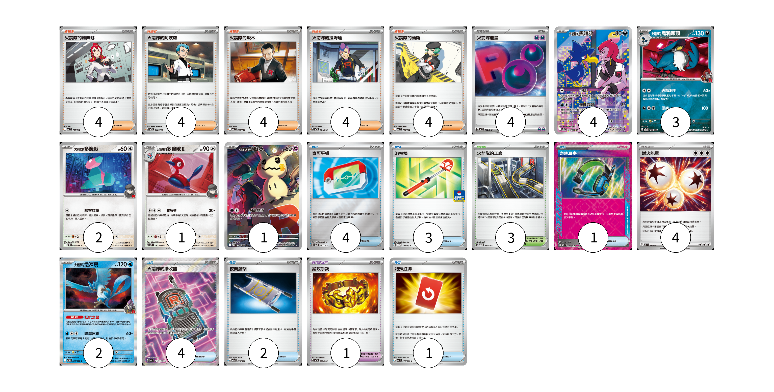 牌組構築方案 以此牌組為基礎新構築牌組 顯示卡面 顯示列表 寶可夢卡(13) 4 3 2 1 1 2 寶可夢道具(1) 1 物品卡(15) 4 3 1 4 2 1 支援者卡(20) 4 4 4 4 4 競技場卡(3) 3 能量卡(8) 4 4 寶可夢卡(13) 卡牌名稱 張數 卡牌名稱 張數 <火箭隊的>黑暗鴉 SV10 106/098 04 火箭隊的烏鴉頭頭 M2a 103/193 03 <火箭隊的>多邊獸 SV10 081/098 02 <火箭隊的>多邊獸Ⅱ SV10 082/098 01 <火箭隊的>謎擬Q M2a 205/193 01 <火箭隊的>急凍鳥 SV10 022/098 02 寶可夢道具(1) 卡牌名稱 張數 卡牌名稱 張數 猛攻手鐲 MC 689/742 01 物品卡(15) 卡牌名稱 張數 卡牌名稱 張數 寶可平板 MC 662/742 04 洛拍棒 SV-P 105/SV-P 03 奇跡耳麥 SV8 097/106 01 火箭隊的接收器 M2a 217/193 04 夜間擔架 MBD 016/022 02 特殊紅牌 M4 072/083 01 支援者卡(20) 卡牌名稱 張數 卡牌名稱 張數 火箭隊的雅典娜 MC 731/742 04 火箭隊的阿波羅 MC 732/742 04 火箭隊的坂木 MC 733/742 04 火箭隊的拉姆達 MC 734/742 04 火箭隊的蘭斯 MC 735/742 04 競技場卡(3) 卡牌名稱 張數 卡牌名稱 張數 火箭隊的工廠 M2a 190/193 03 能量卡(8) 卡牌名稱 張數 卡牌名稱 張數 火箭隊能量 MC 742/742 04 燃火能量 MC 736/742 04 以此牌組為基礎新構築牌組 牌組編碼 JMqOeV-WpqnrS-EPUwAE copy 列印牌組單 牌組編碼已複製 分享至SNS