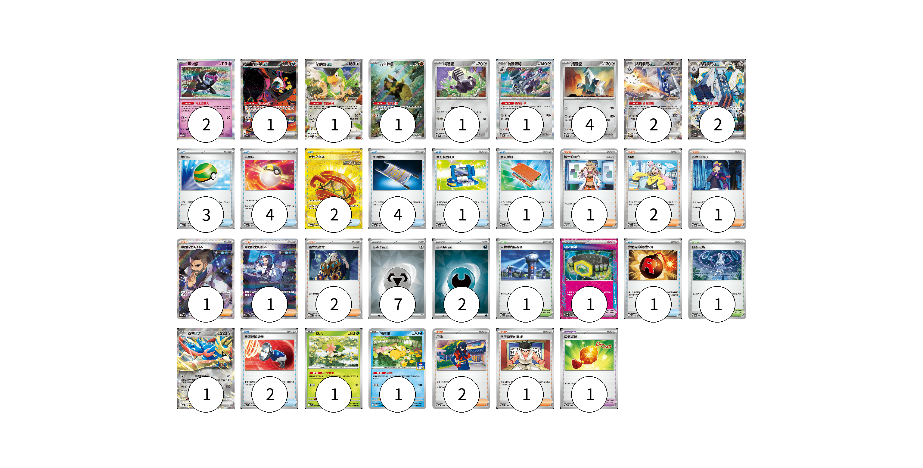 牌組構築方案 以此牌組為基礎新構築牌組 顯示卡面 顯示列表 寶可夢卡(18) 2 1 1 1 1 1 4 2 2 1 1 1 寶可夢道具(2) 1 1 物品卡(18) 3 4 2 4 1 1 1 2 支援者卡(11) 1 2 1 1 1 2 2 1 競技場卡(2) 1 1 能量卡(9) 7 2 寶可夢卡(18) 卡牌名稱 張數 卡牌名稱 張數 願增猿 SV8a 075/187 02 吉雉雞ex SV6a 089/064 01 怒鸚哥ex SV4a 154/190 01 古空棘魚 SV5K 077/071 01 噗隆隆 SV8a 114/187 01 普隆隆姆 SV8a 115/187 01 鋁鋼龍 SV8a 112/187 04 鋁鋼橋龍ex SV7a 037/064 02 鋁鋼橋龍ex SV7a 088/064 02 蒼響ex SVM 089/175 01 謝米 SV9a 006/063 01 可達鴨 SV-P 220/SV-P 01 寶可夢道具(2) 卡牌名稱 張數 卡牌名稱 張數 極限腰帶 SV8a 159/187 01 勇氣護符 SVM 142/175 01 物品卡(18) 卡牌名稱 張數 卡牌名稱 張數 巢穴球 SVM 133/175 03 高級球 SVM 134/175 04 大地之容器 SV6a 093/064 02 夜間擔架 SV8a 151/187 04 寶可裝置3.0 SVK 021/042 01 朋友手冊 SVK 014/042 01 火箭隊的驚嚇炸彈 SV10 089/098 01 寶可夢捕捉器 SV9a 059/063 02 支援者卡(11) 卡牌名稱 張數 卡牌名稱 張數 博士的研究 SVF 030/038 01 奇樹 SVM 160/175 02 松葉的信心 SV8a 178/187 01 弗圖博士的劇本 SV4M 086/066 01 弗圖博士的劇本 SV4M 091/066 01 老大的指令 SVM 172/175 02 丹瑜 SV8a 170/187 02 空手道王的演練 SVM 143/175 01 競技場卡(2) 卡牌名稱 張數 卡牌名稱 張數 火箭隊的監視塔 SV10 096/098 01 阻礙之塔 SV8a 181/187 01 能量卡(9) 卡牌名稱 張數 卡牌名稱 張數 基本【鋼】能量 SVK MET 07 基本【惡】能量 SVK DAR 02 以此牌組為基礎新構築牌組 牌組編碼 JPXbYJ-CLwubW-HDqkIl copy 列印牌組單 牌組編碼已複製 分享至SNS
