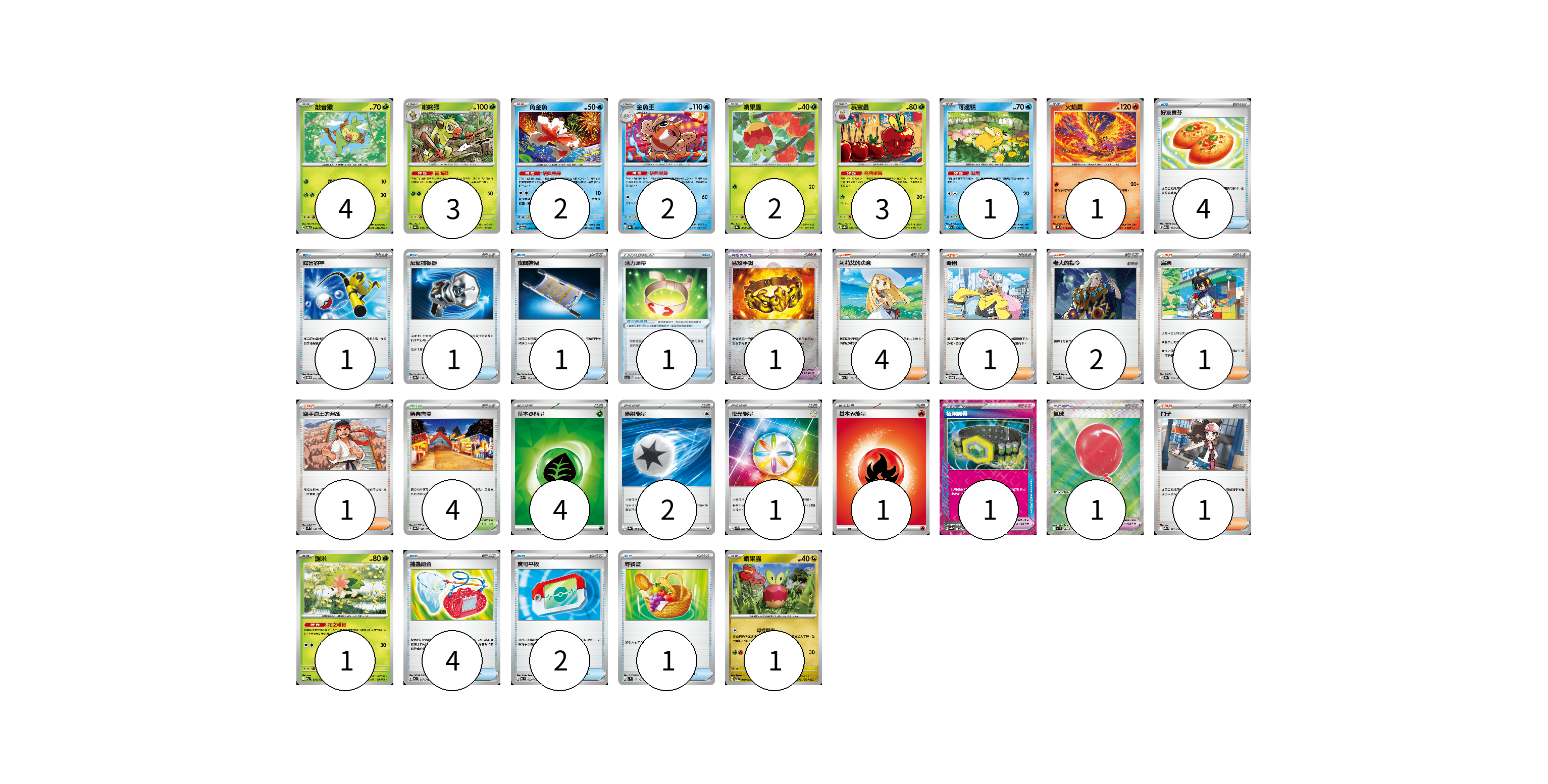 牌組構築方案 以此牌組為基礎新構築牌組 顯示卡面 顯示列表 寶可夢卡(20) 4 3 2 2 2 3 1 1 1 1 寶可夢道具(4) 1 1 1 1 物品卡(14) 4 1 1 1 4 2 1 支援者卡(10) 4 1 2 1 1 1 競技場卡(4) 4 能量卡(8) 4 2 1 1 寶可夢卡(20) 卡牌名稱 張數 卡牌名稱 張數 敲音猴 SV6 008/101 04 啪咚猴 SV8a 007/187 03 角金魚 SV6 026/101 02 金魚王 SV8a 029/187 02 啃果蟲 SV8a 008/187 02 裹蜜蟲 SV8a 009/187 03 可達鴨 M2a 032/193 01 火焰鳥 M2 014/080 01 謝米 M2a 012/193 01 啃果蟲 SV5a 048/066 01 寶可夢道具(4) 卡牌名稱 張數 卡牌名稱 張數 活力頭帶 SC1a 143/154 01 猛攻手鐲 SV11W 082/086 01 極限腰帶 SV8a 159/187 01 氣球 M1L 084/063 01 物品卡(14) 卡牌名稱 張數 卡牌名稱 張數 好友寶芬 M2a 153/193 04 厲害釣竿 SVOD 010/020 01 反擊捕捉器 SV8a 139/187 01 夜間擔架 M2a 159/193 01 捕蟲組合 MC 667/742 04 寶可平板 MC 662/742 02 野餐籃 SV1V 071/078 01 支援者卡(10) 卡牌名稱 張數 卡牌名稱 張數 莉莉艾的決意 M2a 175/193 04 奇樹 SVOD 016/020 01 老大的指令 MBD 020/022 02 烏栗 SV8a 169/187 01 空手道王的演練 SVM 146/175 01 鬥子 M2a 172/193 01 競技場卡(4) 卡牌名稱 張數 卡牌名稱 張數 祭典會場 SV8a 180/187 04 能量卡(8) 卡牌名稱 張數 卡牌名稱 張數 基本【草】能量 SVM GRA 04 噴射能量 SV8a 185/187 02 夜光能量 SVK 042/042 01 基本【火】能量 M-P FIR 01 以此牌組為基礎新構築牌組 牌組編碼 JPmlWv-LnJSBm-HHTMPA copy 列印牌組單 牌組編碼已複製 分享至SNS