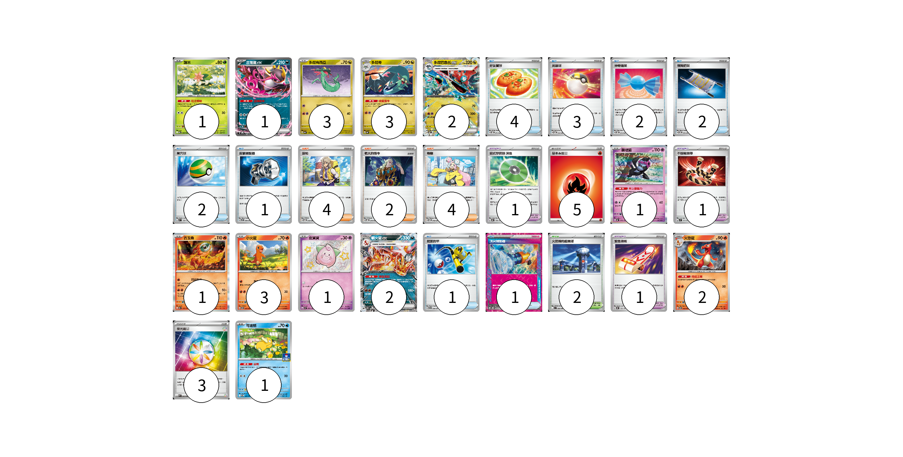 牌組構築方案 以此牌組為基礎新構築牌組 顯示卡面 顯示列表 寶可夢卡(21) 1 1 3 3 2 1 1 3 1 2 2 1 寶可夢道具(3) 1 1 1 物品卡(16) 4 3 2 2 2 1 1 1 支援者卡(10) 4 2 4 競技場卡(2) 2 能量卡(8) 5 3 寶可夢卡(21) 卡牌名稱 張數 卡牌名稱 張數 謝米 SV9a 006/063 01 吉雉雞ex SVOD 004/020 01 多龍梅西亞 SV8a 118/187 03 多龍奇 SV8a 119/187 03 多龍巴魯托ex SV6 081/101 02 願增猿 SV8a 075/187 01 古玉魚 SV8a 025/187 01 小火龍 SVTL 001/021 03 皮寶寶 SV4a 255/190 01 噴火龍ex SVTL 006/021 02 火恐龍 SVTL 002/021 02 可達鴨 SV-P 220/SV-P 01 寶可夢道具(3) 卡牌名稱 張數 卡牌名稱 張數 招式學習器 演進 SV8a 160/187 01 不服輸頭帶 SV1S 073/078 01 緊急滑板 SV8a 153/187 01 物品卡(16) 卡牌名稱 張數 卡牌名稱 張數 好友寶芬 SVOD 011/020 04 高級球 SVOD 012/020 03 神奇糖果 SVOD 013/020 02 夜間擔架 SVOM 016/021 02 巢穴球 SVM 133/175 02 反擊捕捉器 SVTS 009/022 01 厲害釣竿 SVTL 009/021 01 頂尖捕捉器 SV5M 062/071 01 支援者卡(10) 卡牌名稱 張數 卡牌名稱 張數 派帕 SVOD 018/020 04 老大的指令 SVOD 019/020 02 奇樹 SVOM 018/021 04 競技場卡(2) 卡牌名稱 張數 卡牌名稱 張數 火箭隊的監視塔 SV10 096/098 02 能量卡(8) 卡牌名稱 張數 卡牌名稱 張數 基本【火】能量 SVTL FIR 05 夜光能量 SVK 042/042 03 以此牌組為基礎新構築牌組 牌組編碼 JQHchc-ehLNvT-FLtDsw copy 列印牌組單 牌組編碼已複製 分享至SNS