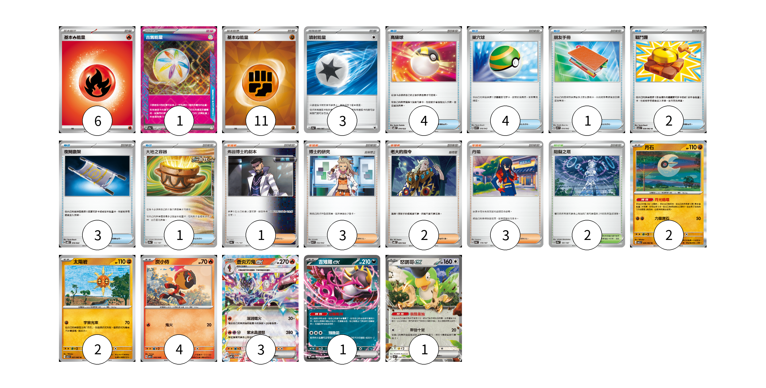 牌組構築方案 以此牌組為基礎新構築牌組 顯示卡面 顯示列表 寶可夢卡(13) 2 2 4 3 1 1 物品卡(15) 4 4 1 2 3 1 支援者卡(9) 1 3 2 3 競技場卡(2) 2 能量卡(21) 6 1 11 3 寶可夢卡(13) 卡牌名稱 張數 卡牌名稱 張數 月石 M1L 026/063 02 太陽岩 M1L 027/063 02 炭小侍 SVPS 005/008 04 蒼炎刃鬼ex SVPS 006/008 03 吉雉雞ex SVOD 004/020 01 怒鸚哥ex SVK 006/042 01 物品卡(15) 卡牌名稱 張數 卡牌名稱 張數 高級球 MBD 014/022 04 巢穴球 SVK 016/042 04 朋友手冊 SVK 014/042 01 戰鬥鑼 M1L 059/063 02 夜間擔架 MBD 016/022 03 大地之容器 SV8a 143/187 01 支援者卡(9) 卡牌名稱 張數 卡牌名稱 張數 弗圖博士的劇本 SV8a 175/187 01 博士的研究 SVK 032/042 03 老大的指令 MBD 020/022 02 丹瑜 SV8a 170/187 03 競技場卡(2) 卡牌名稱 張數 卡牌名稱 張數 阻礙之塔 SV8a 181/187 02 能量卡(21) 卡牌名稱 張數 卡牌名稱 張數 基本【火】能量 M-P FIR 06 古舊能量 SV8a 187/187 01 基本【鬥】能量 SVK FIG 11 噴射能量 SV8a 185/187 03 以此牌組為基礎新構築牌組 牌組編碼 JQoGUt-pjwyey-OegZCR copy 列印牌組單 牌組編碼已複製 分享至SNS