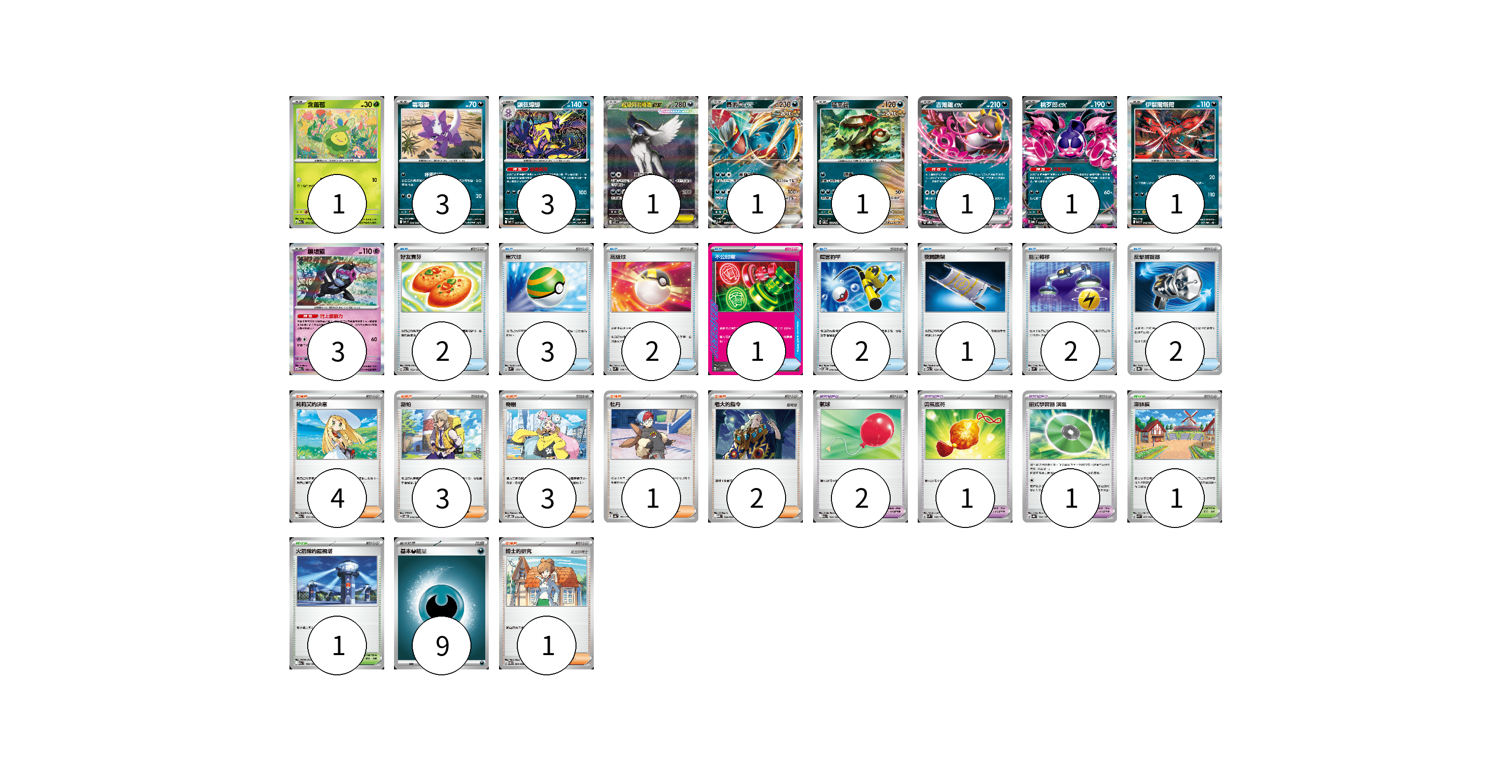 牌組構築方案 以此牌組為基礎新構築牌組 顯示卡面 顯示列表 寶可夢卡(16) 1 3 3 1 1 1 1 1 1 3 寶可夢道具(4) 2 1 1 物品卡(15) 2 3 2 1 2 1 2 2 支援者卡(14) 4 3 3 1 2 1 競技場卡(2) 1 1 能量卡(9) 9 寶可夢卡(16) 卡牌名稱 張數 卡牌名稱 張數 含羞苞 M2a 011/193 01 毒電嬰 M2 056/080 03 顫弦蠑螈 M2 057/080 03 超級阿勃梭魯ex M1L 089/063 01 轟鳴月ex SV4K 054/066 01 猛惡菇 SV6 071/101 01 吉雉雞ex SVOD 004/020 01 桃歹郎ex MBG 009/022 01 伊裴爾塔爾 M1L 040/063 01 願增猿 M2a 081/193 03 寶可夢道具(4) 卡牌名稱 張數 卡牌名稱 張數 氣球 M2a 165/193 02 勇氣護符 SVM 142/175 01 招式學習器 演進 SV8a 160/187 01 物品卡(15) 卡牌名稱 張數 卡牌名稱 張數 好友寶芬 M2a 153/193 02 巢穴球 SVM 133/175 03 高級球 SVM 134/175 02 不公印章 MBD 011/022 01 厲害釣竿 SVOD 010/020 02 夜間擔架 M2a 159/193 01 能量轉移 SVM 127/175 02 反擊捕捉器 SV8a 139/187 02 支援者卡(14) 卡牌名稱 張數 卡牌名稱 張數 莉莉艾的決意 M2a 175/193 04 派帕 SVOD 018/020 03 奇樹 SVOD 016/020 03 牡丹 SV4a 182/190 01 老大的指令 MBD 020/022 02 博士的研究 SV11B 084/086 01 競技場卡(2) 卡牌名稱 張數 卡牌名稱 張數 深缽鎮 SVK 039/042 01 火箭隊的監視塔 M2a 189/193 01 能量卡(9) 卡牌名稱 張數 卡牌名稱 張數 基本【惡】能量 MBG DAR 09 以此牌組為基礎新構築牌組 牌組編碼 JRZgEc-ciqYnR-iBgfqu copy 列印牌組單 牌組編碼已複製 分享至SNS