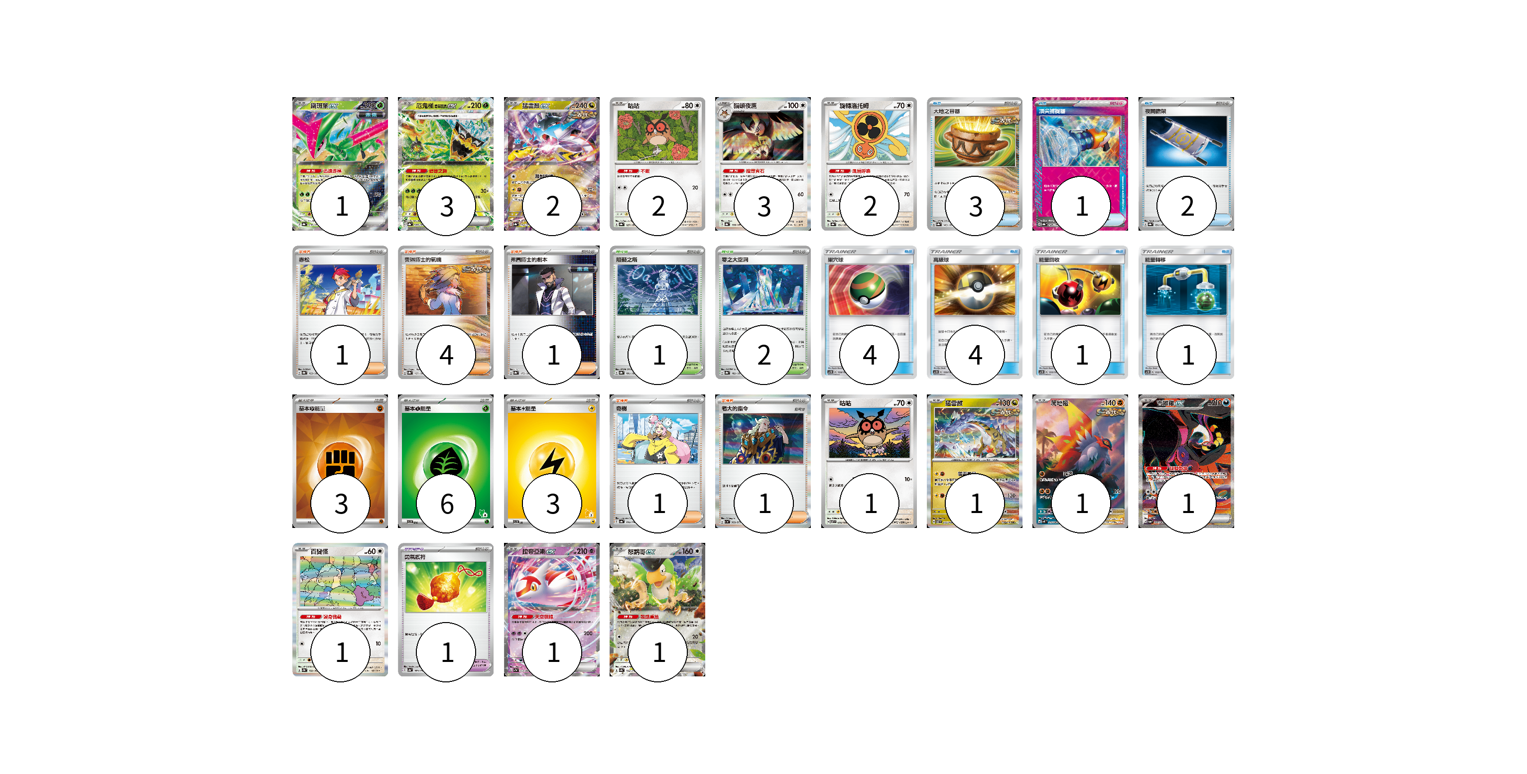 牌組構築方案 以此牌組為基礎新構築牌組 顯示卡面 顯示列表 寶可夢卡(20) 1 3 2 2 3 2 1 1 1 1 1 1 1 寶可夢道具(1) 1 物品卡(16) 3 1 2 4 4 1 1 支援者卡(8) 1 4 1 1 1 競技場卡(3) 1 2 能量卡(12) 3 6 3 寶可夢卡(20) 卡牌名稱 張數 卡牌名稱 張數 鐵斑葉ex SV8a 016/187 01 厄鬼椪 碧草面具ex SV8a 020/187 03 猛雷鼓ex SV8a 124/187 02 咕咕 SV8a 127/187 02 貓頭夜鷹 SV8a 128/187 03 旋轉洛托姆 SV8a 131/187 02 咕咕 SV7 076/102 01 猛雷鼓 SV7 075/102 01 爬地翅 SV4K 074/066 01 吉雉雞ex SV6a 089/064 01 百變怪 SV2a 132/165 01 拉帝亞斯ex SV7a 019/064 01 怒鸚哥ex SV4a 154/190 01 寶可夢道具(1) 卡牌名稱 張數 卡牌名稱 張數 勇氣護符 SV4a 169/190 01 物品卡(16) 卡牌名稱 張數 卡牌名稱 張數 大地之容器 SV8a 143/187 03 頂尖捕捉器 SV8a 148/187 01 夜間擔架 SV8a 151/187 02 巢穴球 AC1D 138/157 04 高級球 AC1D 139/157 04 能量回收 AC1D 131/157 01 能量轉移 AC1D 132/157 01 支援者卡(8) 卡牌名稱 張數 卡牌名稱 張數 赤松 SV8a 163/187 01 奧琳博士的氣魄 SV8a 167/187 04 弗圖博士的劇本 SV8a 175/187 01 奇樹 SV4a 174/190 01 老大的指令 SV1a 069/073 01 競技場卡(3) 卡牌名稱 張數 卡牌名稱 張數 阻礙之塔 SV8a 181/187 01 零之大空洞 SV8a 182/187 02 能量卡(12) 卡牌名稱 張數 卡牌名稱 張數 基本【鬥】能量 SVK FIG 03 基本【草】能量 SVI GRA 06 基本【雷】能量 SVI LIG 03 以此牌組為基礎新構築牌組 牌組編碼 JTssBc-DSfYYw-esHFBw copy 列印牌組單 牌組編碼已複製 分享至SNS