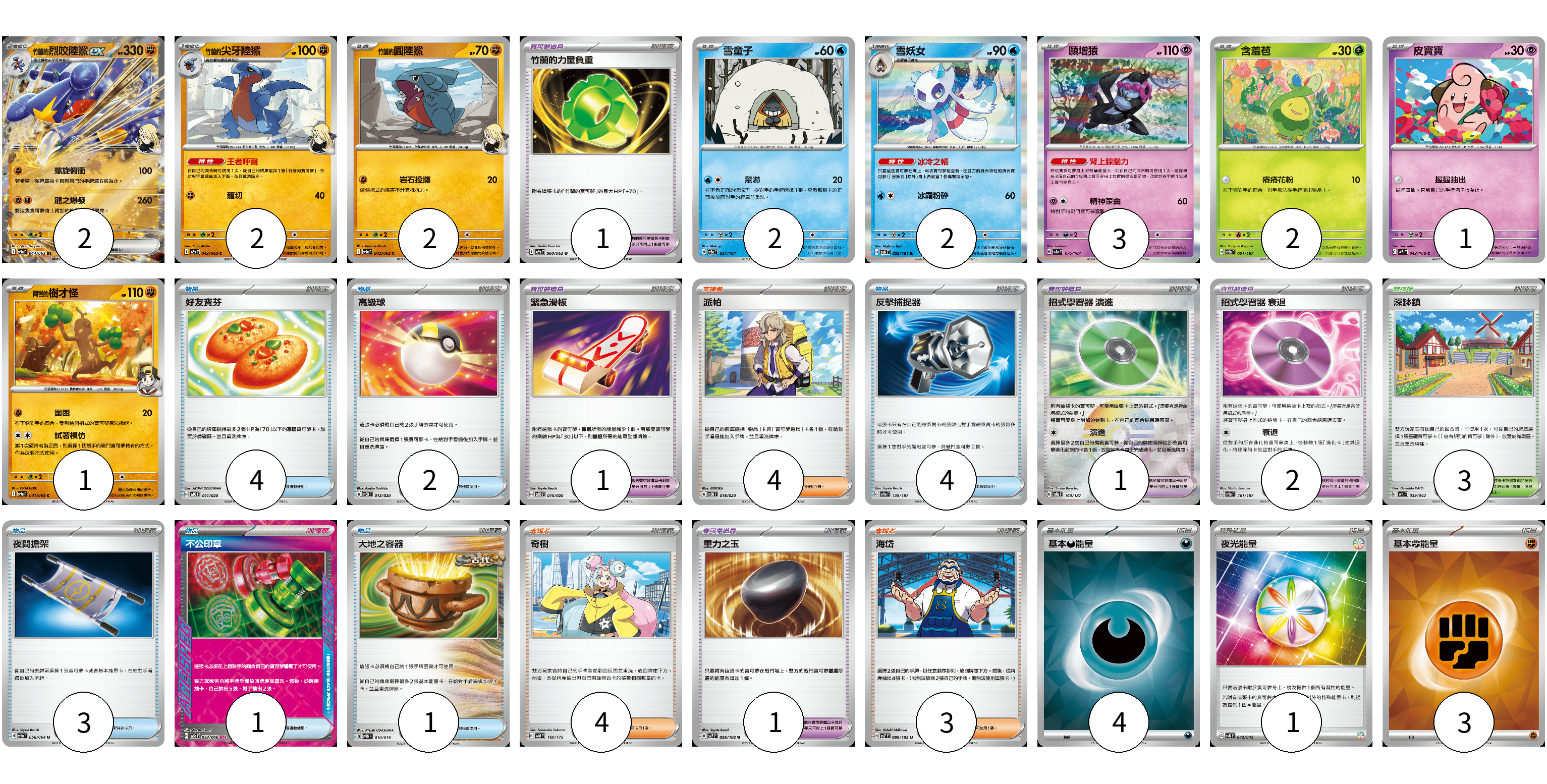 牌組構築方案 以此牌組為基礎新構築牌組 顯示卡面 顯示列表 寶可夢卡(17) 2 2 2 2 2 3 2 1 1 寶可夢道具(6) 1 1 1 2 1 物品卡(15) 4 2 4 3 1 1 支援者卡(11) 4 4 3 競技場卡(3) 3 能量卡(8) 4 1 3 寶可夢卡(17) 卡牌名稱 張數 卡牌名稱 張數 <竹蘭的>烈咬陸鯊ex SV9a 044/063 02 <竹蘭的>尖牙陸鯊 SV9a 043/063 02 <竹蘭的>圓陸鯊 SV9a 042/063 02 雪童子 SV8a 037/187 02 雪妖女 SV6 033/101 02 願增猿 SV8a 075/187 03 含羞苞 SV8a 001/187 02 皮寶寶 SV3 042/108 01 <阿響的>樹才怪 SV9a 041/063 01 寶可夢道具(6) 卡牌名稱 張數 卡牌名稱 張數 竹蘭的力量負重 SV9a 060/063 01 緊急滑板 SVOD 015/020 01 招式學習器 演進 SV8a 160/187 01 招式學習器 衰退 SV8a 161/187 02 重力之玉 SV7 095/102 01 物品卡(15) 卡牌名稱 張數 卡牌名稱 張數 好友寶芬 SVOD 011/020 04 高級球 SVOD 012/020 02 反擊捕捉器 SV8a 139/187 04 夜間擔架 SV6a 056/064 03 不公印章 SV5a 053/066 01 大地之容器 SVTG 010/019 01 支援者卡(11) 卡牌名稱 張數 卡牌名稱 張數 派帕 SVOD 018/020 04 奇樹 SVM 160/175 04 海岱 SV7 099/102 03 競技場卡(3) 卡牌名稱 張數 卡牌名稱 張數 深缽鎮 SVK 039/042 03 能量卡(8) 卡牌名稱 張數 卡牌名稱 張數 基本【惡】能量 SVOM DAR 04 夜光能量 SVK 042/042 01 基本【鬥】能量 SVK FIG 03 以此牌組為基礎新構築牌組 牌組編碼 JcjwWW-Utliex-cWFGKI copy 列印牌組單 牌組編碼已複製 分享至SNS