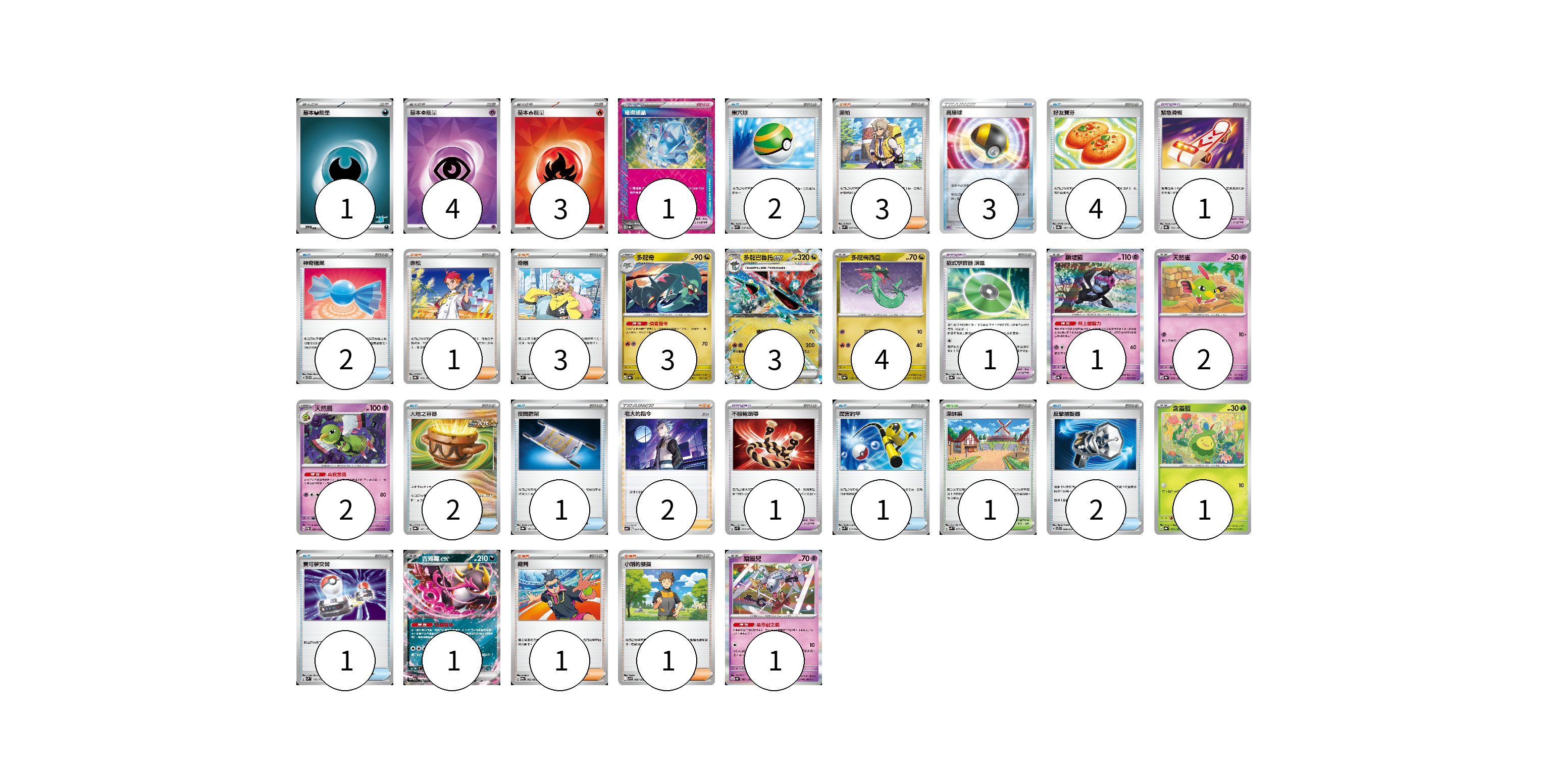 牌組構築方案 以此牌組為基礎新構築牌組 顯示卡面 顯示列表 寶可夢卡(18) 3 3 4 1 2 2 1 1 1 寶可夢道具(4) 1 1 1 1 物品卡(18) 2 3 4 2 2 1 1 2 1 支援者卡(11) 3 1 3 2 1 1 競技場卡(1) 1 能量卡(8) 1 4 3 寶可夢卡(18) 卡牌名稱 張數 卡牌名稱 張數 多龍奇 SV8a 119/187 03 多龍巴魯托ex SV8a 120/187 03 多龍梅西亞 SV8a 118/187 04 願增猿 SV8a 075/187 01 天然雀 SV8a 060/187 02 天然鳥 SVEM 005/020 02 含羞苞 SV8a 001/187 01 吉雉雞ex M2a 114/193 01 鑰圈兒 SV4a 087/190 01 寶可夢道具(4) 卡牌名稱 張數 卡牌名稱 張數 璀璨結晶 SV8a 152/187 01 緊急滑板 SV8a 153/187 01 招式學習器 演進 SV8a 160/187 01 不服輸頭帶 SV1S 073/078 01 物品卡(18) 卡牌名稱 張數 卡牌名稱 張數 巢穴球 SVK 016/042 02 高級球 SPD 010/020 03 好友寶芬 SV8a 147/187 04 神奇糖果 SVTG 014/019 02 大地之容器 SV8a 143/187 02 夜間擔架 SV8a 151/187 01 厲害釣竿 SVK 011/042 01 反擊捕捉器 SVTS 009/022 02 寶可夢交替 SVM 136/175 01 支援者卡(11) 卡牌名稱 張數 卡牌名稱 張數 派帕 SVK 035/042 03 赤松 SV8a 163/187 01 奇樹 SVM 160/175 03 老大的指令(赤日) SVB 024/028 02 裁判 SV9a 062/063 01 小剛的發掘 SV9 096/100 01 競技場卡(1) 卡牌名稱 張數 卡牌名稱 張數 深缽鎮 SVK 039/042 01 能量卡(8) 卡牌名稱 張數 卡牌名稱 張數 基本【惡】能量 SVI DAR 01 基本【超】能量 SVK PSY 04 基本【火】能量 SVK FIR 03 以此牌組為基礎新構築牌組 牌組編碼 JeiAIv-OAqgrx-XCtrFb copy 列印牌組單 牌組編碼已複製 分享至SNS