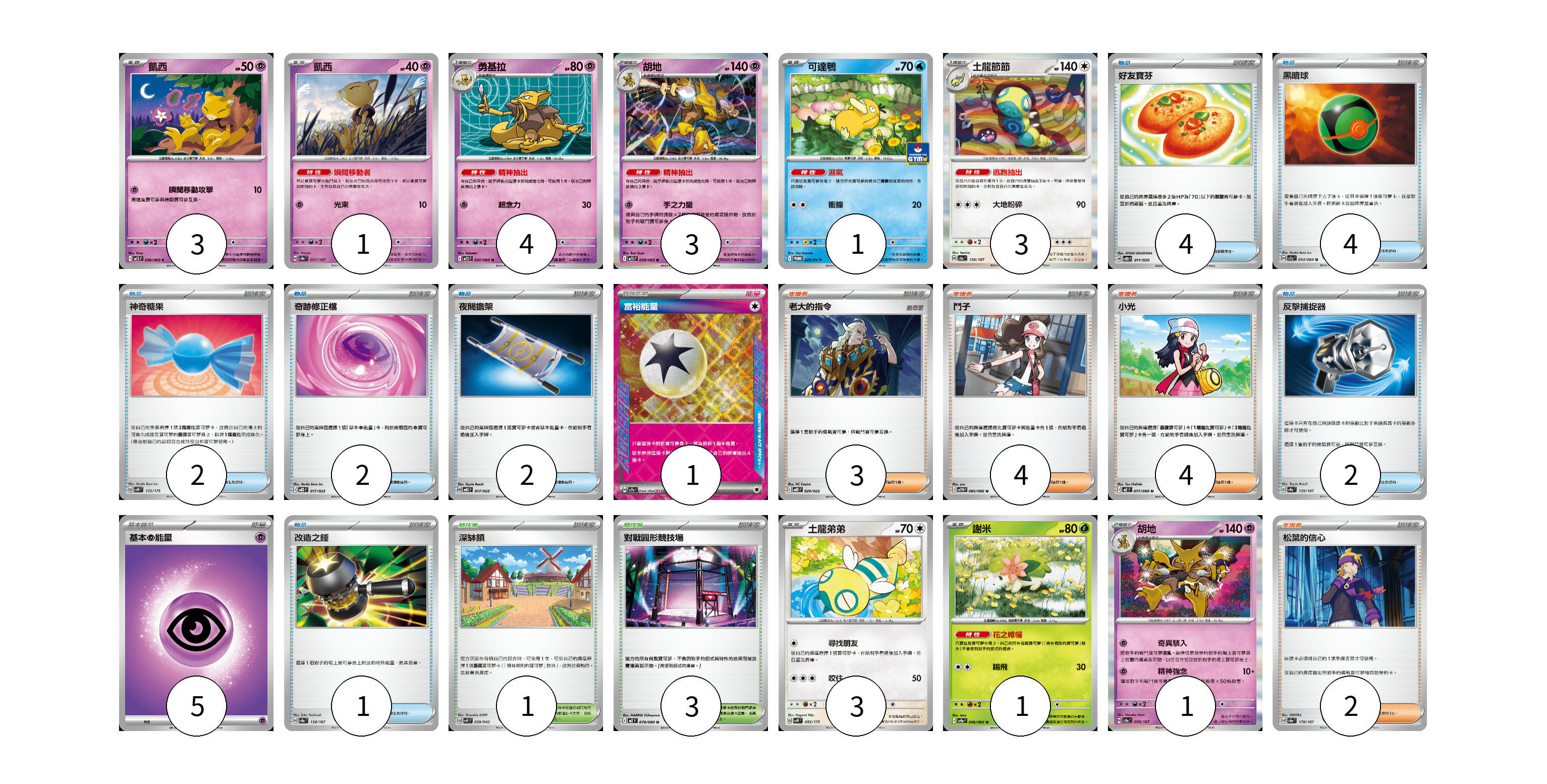 牌組構築方案 以此牌組為基礎新構築牌組 顯示卡面 顯示列表 寶可夢卡(20) 3 1 4 3 1 3 3 1 1 物品卡(17) 4 4 2 2 2 2 1 支援者卡(13) 3 4 4 2 競技場卡(4) 1 3 能量卡(6) 1 5 寶可夢卡(20) 卡牌名稱 張數 卡牌名稱 張數 凱西 M1S 036/063 03 凱西 SV8a 057/187 01 勇基拉 M1S 037/063 04 胡地 M1S 038/063 03 可達鴨 SV-P 220/SV-P 01 土龍節節 SV8a 130/187 03 土龍弟弟 SVM 095/175 03 謝米 SV9a 006/063 01 胡地 SV8a 059/187 01 物品卡(17) 卡牌名稱 張數 卡牌名稱 張數 好友寶芬 SVOD 011/020 04 黑暗球 SV7a 054/064 04 神奇糖果 SVM 135/175 02 奇跡修正檔 MBD 017/022 02 夜間擔架 MBG 017/022 02 反擊捕捉器 SV8a 139/187 02 改造之錘 SV8a 138/187 01 支援者卡(13) 卡牌名稱 張數 卡牌名稱 張數 老大的指令 MBD 020/022 03 鬥子 SV11W 085/086 04 小光 M2 077/080 04 松葉的信心 SV8a 178/187 02 競技場卡(4) 卡牌名稱 張數 卡牌名稱 張數 深缽鎮 SVK 039/042 01 對戰圓形競技場 M2 079/080 03 能量卡(6) 卡牌名稱 張數 卡牌名稱 張數 富裕能量 SV7a 064/064 01 基本【超】能量 MBD PSY 05 以此牌組為基礎新構築牌組 牌組編碼 JesmwJ-QteHhx-iXwheu copy 列印牌組單 牌組編碼已複製 分享至SNS