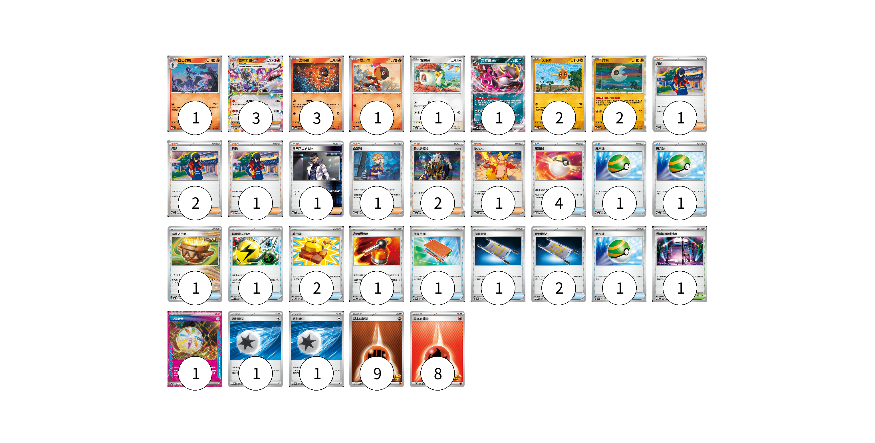 牌組構築方案 以此牌組為基礎新構築牌組 顯示卡面 顯示列表 寶可夢卡(14) 1 3 3 1 1 1 2 2 物品卡(16) 4 1 1 1 1 2 1 1 1 2 1 支援者卡(9) 1 2 1 1 1 2 1 競技場卡(1) 1 能量卡(20) 1 1 1 9 8 寶可夢卡(14) 卡牌名稱 張數 卡牌名稱 張數 蒼炎刃鬼 M2 020/080 01 蒼炎刃鬼ex SVPS 006/008 03 炭小侍 M2 019/080 03 炭小侍 SVPS 005/008 01 怒鸚哥 SVM 123/175 01 吉雉雞ex SV6a 038/064 01 太陽岩 M1L 027/063 02 月石 M1L 026/063 02 物品卡(16) 卡牌名稱 張數 卡牌名稱 張數 高級球 SVOM 013/021 04 巢穴球 SVHK 012/022 01 巢穴球 SV1S 070/078 01 大地之容器 SV4K 060/066 01 超級能量回收 SV1a 064/073 01 戰鬥鑼 M1L 059/063 02 高溫燃燒器 M2 074/080 01 朋友手冊 SVK 014/042 01 夜間擔架 SV8a 151/187 01 夜間擔架 SV6a 056/064 02 巢穴球 SVK 016/042 01 支援者卡(9) 卡牌名稱 張數 卡牌名稱 張數 丹瑜 SV8a 170/187 01 丹瑜 SVK 030/042 02 丹瑜 SV6 097/101 01 弗圖博士的劇本 SV4M 065/066 01 白蕾雅 SV8a 176/187 01 老大的指令 SV4a 181/190 02 吹火人 M2 078/080 01 競技場卡(1) 卡牌名稱 張數 卡牌名稱 張數 對戰圓形競技場 M2 079/080 01 能量卡(20) 卡牌名稱 張數 卡牌名稱 張數 古舊能量 SV6 101/101 01 噴射能量 SV8a 185/187 01 噴射能量 SVK 040/042 01 基本【鬥】能量 SV-P 262/SV-P 09 基本【火】能量 SV-P 258/SV-P 08 以此牌組為基礎新構築牌組 牌組編碼 Jgjwin-IGZSTF-vXUTCJ copy 列印牌組單 牌組編碼已複製 分享至SNS