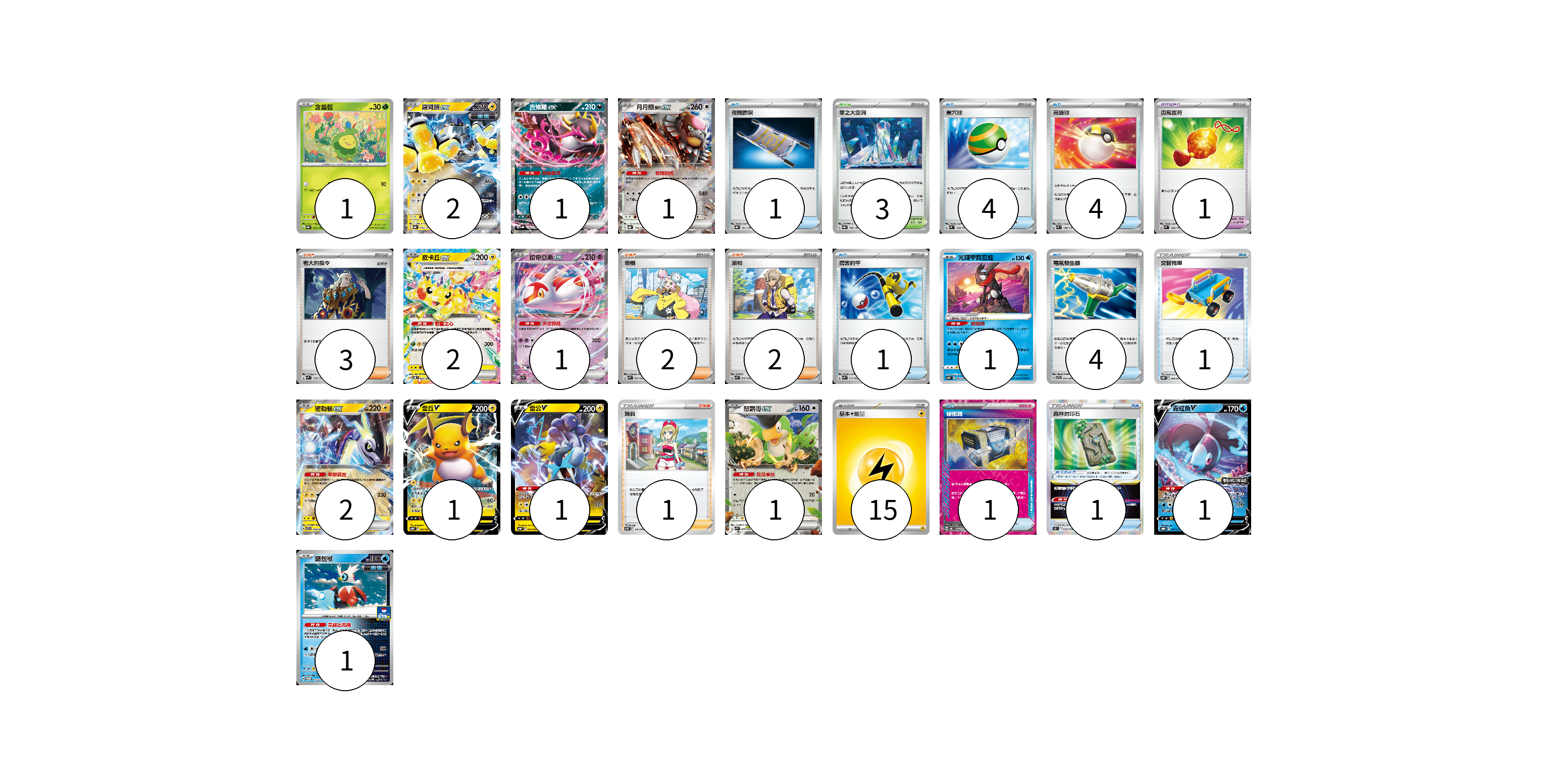 牌組構築方案 以此牌組為基礎新構築牌組 顯示卡面 顯示列表 寶可夢卡(16) 1 2 1 1 2 1 1 2 1 1 1 1 1 寶可夢道具(2) 1 1 物品卡(16) 1 4 4 1 4 1 1 支援者卡(8) 3 2 2 1 競技場卡(3) 3 能量卡(15) 15 寶可夢卡(16) 卡牌名稱 張數 卡牌名稱 張數 含羞苞 SV8a 001/187 01 鐵臂膀ex SV8a 054/187 02 吉雉雞ex SV8a 104/187 01 月月熊 赫月ex SV8a 134/187 01 皮卡丘ex SV8 033/106 02 拉帝亞斯ex SV7a 019/064 01 光輝甲賀忍蛙 SVTG 002/019 01 密勒頓ex SVTR 008/021 02 雷丘V SVTR 003/021 01 雷公V SVTR 005/021 01 怒鸚哥ex SVK 006/042 01 霓虹魚V SV-P 134/SV-P 01 鐵包袱 SV-P 175/SV-P 01 寶可夢道具(2) 卡牌名稱 張數 卡牌名稱 張數 勇氣護符 SVM 142/175 01 森林封印石 S12 092/098 01 物品卡(16) 卡牌名稱 張數 卡牌名稱 張數 夜間擔架 SV8a 151/187 01 巢穴球 SVM 133/175 04 高級球 SVM 134/175 04 厲害釣竿 SVK 011/042 01 電氣發生器 SVTR 011/021 04 交替推車 SVTR 009/021 01 秘密箱 SV6 092/101 01 支援者卡(8) 卡牌名稱 張數 卡牌名稱 張數 老大的指令 SVM 172/175 03 奇樹 SVK 031/042 02 派帕 SVK 035/042 02 珠貝 SVTG 016/019 01 競技場卡(3) 卡牌名稱 張數 卡牌名稱 張數 零之大空洞 SV8a 182/187 03 能量卡(15) 卡牌名稱 張數 卡牌名稱 張數 基本【雷】能量 SVTR LIG 15 以此牌組為基礎新構築牌組 牌組編碼 JhHqiv-UcaAvQ-NfZBSF copy 列印牌組單 牌組編碼已複製 分享至SNS