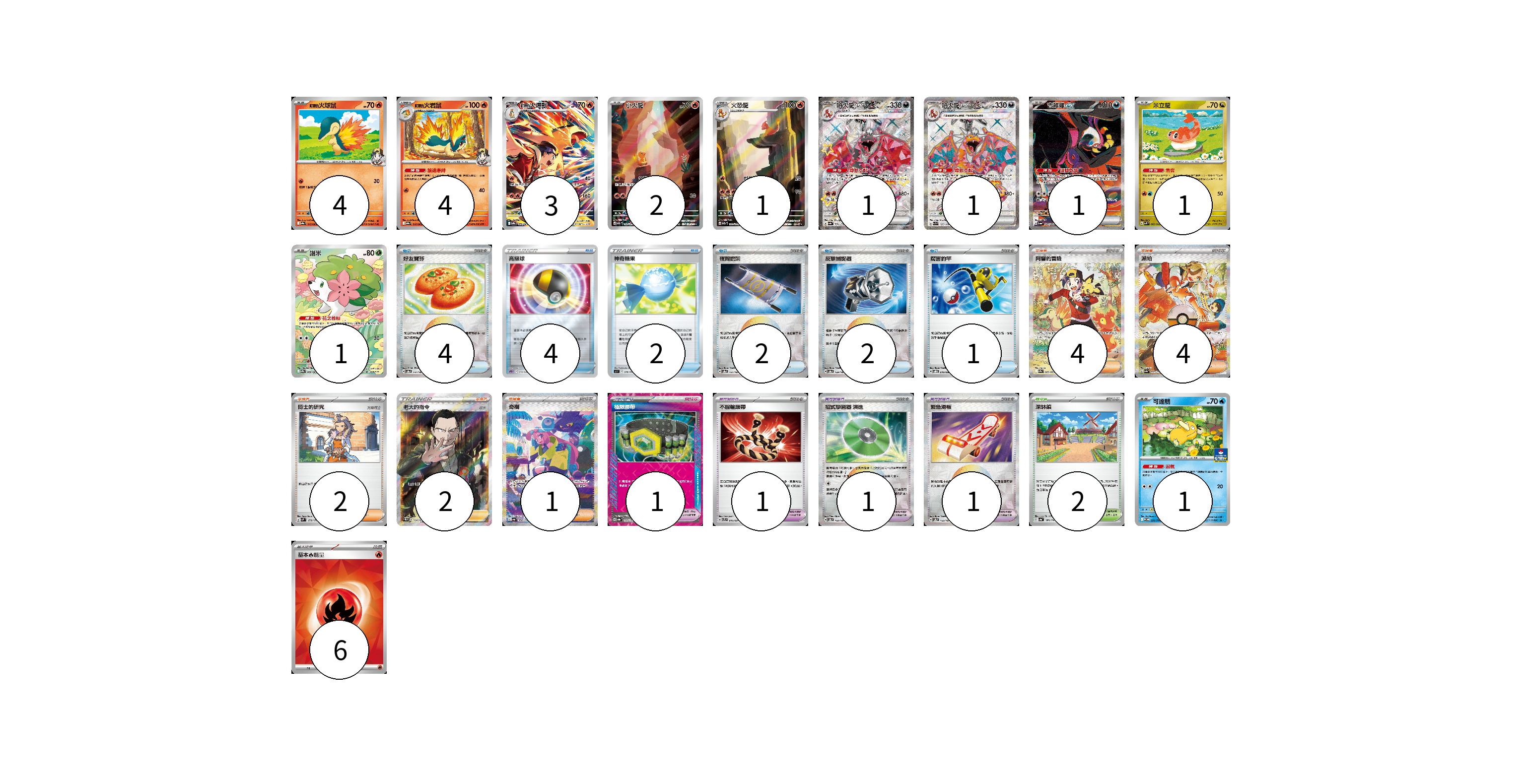 牌組構築方案 以此牌組為基礎新構築牌組 顯示卡面 顯示列表 寶可夢卡(20) 4 4 3 2 1 1 1 1 1 1 1 寶可夢道具(4) 1 1 1 1 物品卡(15) 4 4 2 2 2 1 支援者卡(13) 4 4 2 2 1 競技場卡(2) 2 能量卡(6) 6 寶可夢卡(20) 卡牌名稱 張數 卡牌名稱 張數 <阿響的>火球鼠 SV9a 015/063 04 <阿響的>火岩鼠 SV9a 016/063 04 <阿響的>火爆獸 SV9a 070/063 03 小火龍 SV2a 168/165 02 火恐龍 SV2a 169/165 01 噴火龍ex SV4a 331/190 01 噴火龍ex SV3 125/108 01 吉雉雞ex SV6a 089/064 01 米立龍 SVK 002/042 01 謝米 SV9a 066/063 01 可達鴨 SV-P 220/SV-P 01 寶可夢道具(4) 卡牌名稱 張數 卡牌名稱 張數 極限腰帶 SV8a 159/187 01 不服輸頭帶 SVTL 016/021 01 招式學習器 演進 SV8a 160/187 01 緊急滑板 SV8a 153/187 01 物品卡(15) 卡牌名稱 張數 卡牌名稱 張數 好友寶芬 SV8a 147/187 04 高級球 SPD 010/020 04 神奇糖果 SI 376/414 02 夜間擔架 SV8a 151/187 02 反擊捕捉器 SV8a 139/187 02 厲害釣竿 SVOD 010/020 01 支援者卡(13) 卡牌名稱 張數 卡牌名稱 張數 阿響的冒險 SV9a 089/063 04 派帕 SV4a 353/190 04 博士的研究 SVM 170/175 02 老大的指令(坂木) SC1b 170/153 02 奇樹 SV4a 350/190 01 競技場卡(2) 卡牌名稱 張數 卡牌名稱 張數 深缽鎮 SV4a 185/190 02 能量卡(6) 卡牌名稱 張數 卡牌名稱 張數 基本【火】能量 SVK FIR 06 以此牌組為基礎新構築牌組 牌組編碼 JjxLgP-xzwqyB-nZMjiw copy 列印牌組單 牌組編碼已複製 分享至SNS