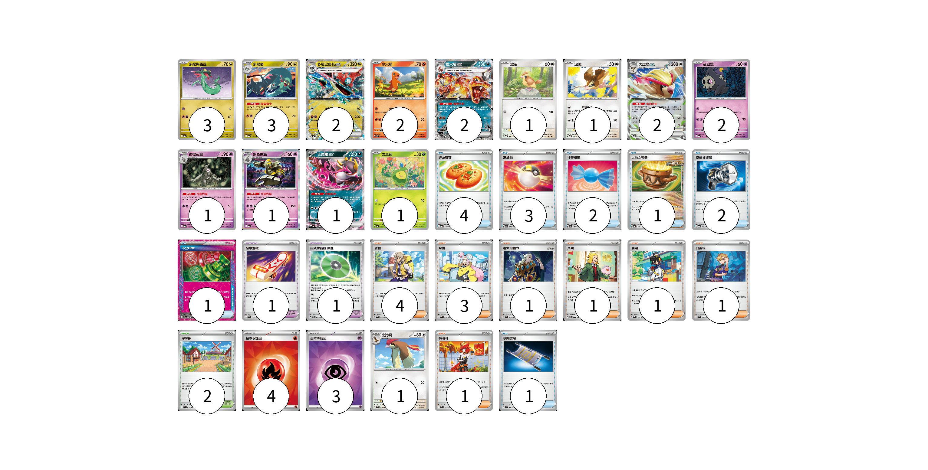 牌組構築方案 以此牌組為基礎新構築牌組 顯示卡面 顯示列表 寶可夢卡(23) 3 3 2 2 2 1 1 2 2 1 1 1 1 1 寶可夢道具(2) 1 1 物品卡(14) 4 3 2 1 2 1 1 支援者卡(12) 4 3 1 1 1 1 1 競技場卡(2) 2 能量卡(7) 4 3 寶可夢卡(23) 卡牌名稱 張數 卡牌名稱 張數 多龍梅西亞 SV8a 118/187 03 多龍奇 SV8a 119/187 03 多龍巴魯托ex SV8a 120/187 02 小火龍 SVTL 001/021 02 噴火龍ex SV4a 115/190 02 波波 SV3 087/108 01 波波 SVK 003/042 01 大比鳥ex SVK 005/042 02 夜巡靈 SV8a 064/187 02 彷徨夜靈 SV8a 065/187 01 黑夜魔靈 SV8a 066/187 01 吉雉雞ex SV8a 104/187 01 含羞苞 SV8a 001/187 01 比比鳥 SVK 004/042 01 寶可夢道具(2) 卡牌名稱 張數 卡牌名稱 張數 緊急滑板 SV8a 153/187 01 招式學習器 演進 SVTL 017/021 01 物品卡(14) 卡牌名稱 張數 卡牌名稱 張數 好友寶芬 SV8a 147/187 04 高級球 SVM 134/175 03 神奇糖果 SVM 135/175 02 大地之容器 SV8a 143/187 01 反擊捕捉器 SV8a 139/187 02 不公印章 SV5a 053/066 01 夜間擔架 SV8a 151/187 01 支援者卡(12) 卡牌名稱 張數 卡牌名稱 張數 派帕 SVK 035/042 04 奇樹 SVK 031/042 03 老大的指令 SVK 036/042 01 八朔 SV6 098/101 01 烏栗 SV8a 169/187 01 白蕾雅 SV8a 176/187 01 梅洛可 SV8a 179/187 01 競技場卡(2) 卡牌名稱 張數 卡牌名稱 張數 深缽鎮 SVK 039/042 02 能量卡(7) 卡牌名稱 張數 卡牌名稱 張數 基本【火】能量 SVK FIR 04 基本【超】能量 SVK PSY 03 以此牌組為基礎新構築牌組 牌組編碼 JovBBi-lkYrvp-qKinhk copy 列印牌組單 牌組編碼已複製 分享至SNS