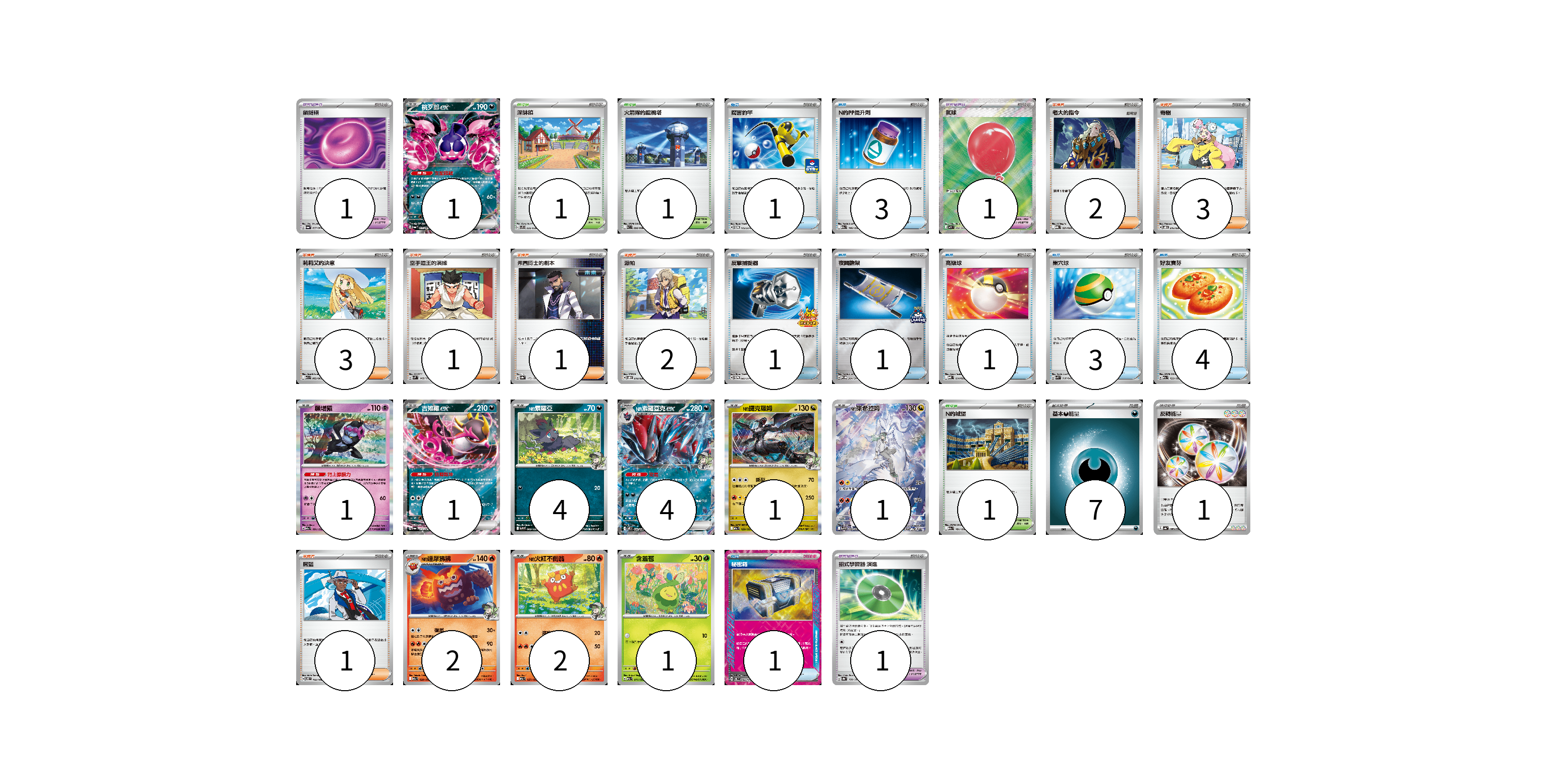 牌組構築方案 以此牌組為基礎新構築牌組 顯示卡面 顯示列表 寶可夢卡(18) 1 1 1 4 4 1 1 2 2 1 寶可夢道具(3) 1 1 1 物品卡(15) 1 3 1 1 1 3 4 1 支援者卡(13) 2 3 3 1 1 2 1 競技場卡(3) 1 1 1 能量卡(8) 7 1 寶可夢卡(18) 卡牌名稱 張數 卡牌名稱 張數 桃歹郎ex SV6a 039/064 01 願增猿 M2a 081/193 01 吉雉雞ex SV6a 038/064 01 N的索羅亞 SV9 060/100 04 N的索羅亞克ex SV9 061/100 04 N的捷克羅姆 M2a 129/193 01 N的萊希拉姆 SV9 109/100 01 N的達摩狒狒 M2a 028/193 02 N的火紅不倒翁 M2a 027/193 02 含羞苞 M2a 011/193 01 寶可夢道具(3) 卡牌名稱 張數 卡牌名稱 張數 鎖鏈糬 SV6a 057/064 01 氣球 M1L 084/063 01 招式學習器 演進 SV8a 160/187 01 物品卡(15) 卡牌名稱 張數 卡牌名稱 張數 厲害釣竿 SV-P 112/SV-P 01 N的PP提升劑 M2a 146/193 03 反擊捕捉器 SV-P 083/SV-P 01 夜間擔架 SV-P 204/SV-P 01 高級球 MBD 014/022 01 巢穴球 SVK 016/042 03 好友寶芬 M2a 153/193 04 秘密箱 SV6 092/101 01 支援者卡(13) 卡牌名稱 張數 卡牌名稱 張數 老大的指令 MBG 021/022 02 奇樹 SVOD 016/020 03 莉莉艾的決意 M1L 062/063 03 空手道王的演練 SVM 143/175 01 弗圖博士的劇本 SV8a 175/187 01 派帕 SVOD 018/020 02 席藍 SV8 102/106 01 競技場卡(3) 卡牌名稱 張數 卡牌名稱 張數 深缽鎮 SVF 036/038 01 火箭隊的監視塔 SV10 096/098 01 N的城堡 M2a 181/193 01 能量卡(8) 卡牌名稱 張數 卡牌名稱 張數 基本【惡】能量 MBG DAR 07 反轉能量 SV4a 189/190 01 以此牌組為基礎新構築牌組 牌組編碼 JqQssw-ODTHmy-SVhJlL copy 列印牌組單 牌組編碼已複製 分享至SNS