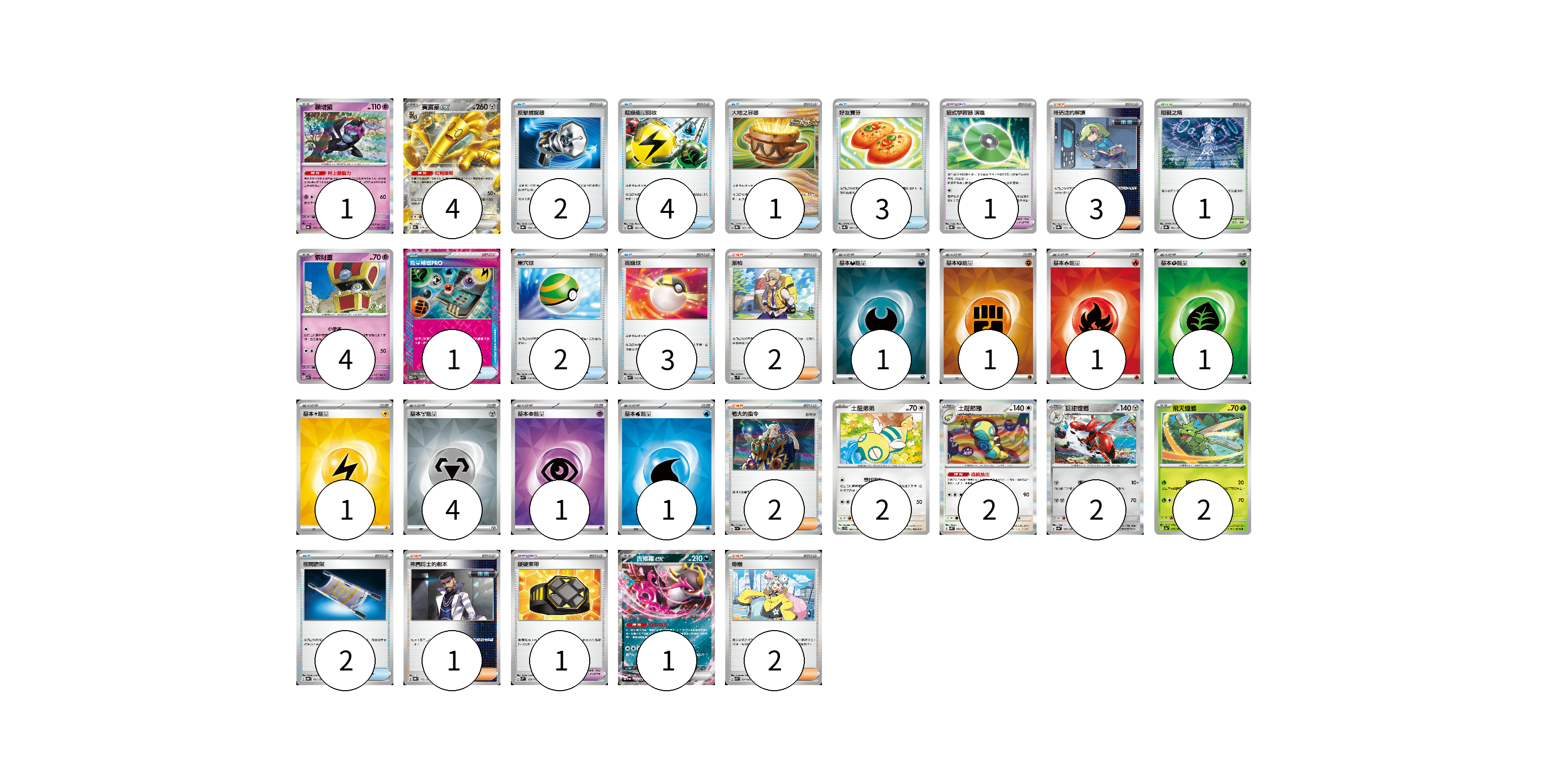 牌組構築方案 以此牌組為基礎新構築牌組 顯示卡面 顯示列表 寶可夢卡(18) 1 4 4 2 2 2 2 1 寶可夢道具(2) 1 1 物品卡(18) 2 4 1 3 1 2 3 2 支援者卡(10) 3 2 2 1 2 競技場卡(1) 1 能量卡(11) 1 1 1 1 1 4 1 1 寶可夢卡(18) 卡牌名稱 張數 卡牌名稱 張數 願增猿 SV8a 075/187 01 賽富豪ex SV8a 117/187 04 索財靈 SV7a 024/064 04 土龍弟弟 SVD 092/139 02 土龍節節 SV5K 057/071 02 巨鉗螳螂 SV4a 129/190 02 飛天螳螂 SV2a 123/165 02 吉雉雞ex SV6a 038/064 01 寶可夢道具(2) 卡牌名稱 張數 卡牌名稱 張數 招式學習器 演進 SV8a 160/187 01 硬硬束帶 SVM 139/175 01 物品卡(18) 卡牌名稱 張數 卡牌名稱 張數 反擊捕捉器 SV8a 139/187 02 超級能量回收 SV8a 141/187 04 大地之容器 SV8a 143/187 01 好友寶芬 SV8a 147/187 03 能量輸送PRO SV7a 052/064 01 巢穴球 SVK 016/042 02 高級球 SVK 018/042 03 夜間擔架 SV8a 151/187 02 支援者卡(10) 卡牌名稱 張數 卡牌名稱 張數 暗碼迷的解讀 SV8a 165/187 03 派帕 SV1V 076/078 02 老大的指令 SV1a 069/073 02 弗圖博士的劇本 SV8a 175/187 01 奇樹 SVK 031/042 02 競技場卡(1) 卡牌名稱 張數 卡牌名稱 張數 阻礙之塔 SV8a 181/187 01 能量卡(11) 卡牌名稱 張數 卡牌名稱 張數 基本【惡】能量 SVK DAR 01 基本【鬥】能量 SVK FIG 01 基本【火】能量 SVK FIR 01 基本【草】能量 SVK GRA 01 基本【雷】能量 SVK LIG 01 基本【鋼】能量 SVK MET 04 基本【超】能量 SVK PSY 01 基本【水】能量 SVK WAT 01 以此牌組為基礎新構築牌組 牌組編碼 JsWGii-JfqQWQ-roZwkb copy 列印牌組單 牌組編碼已複製 分享至SNS