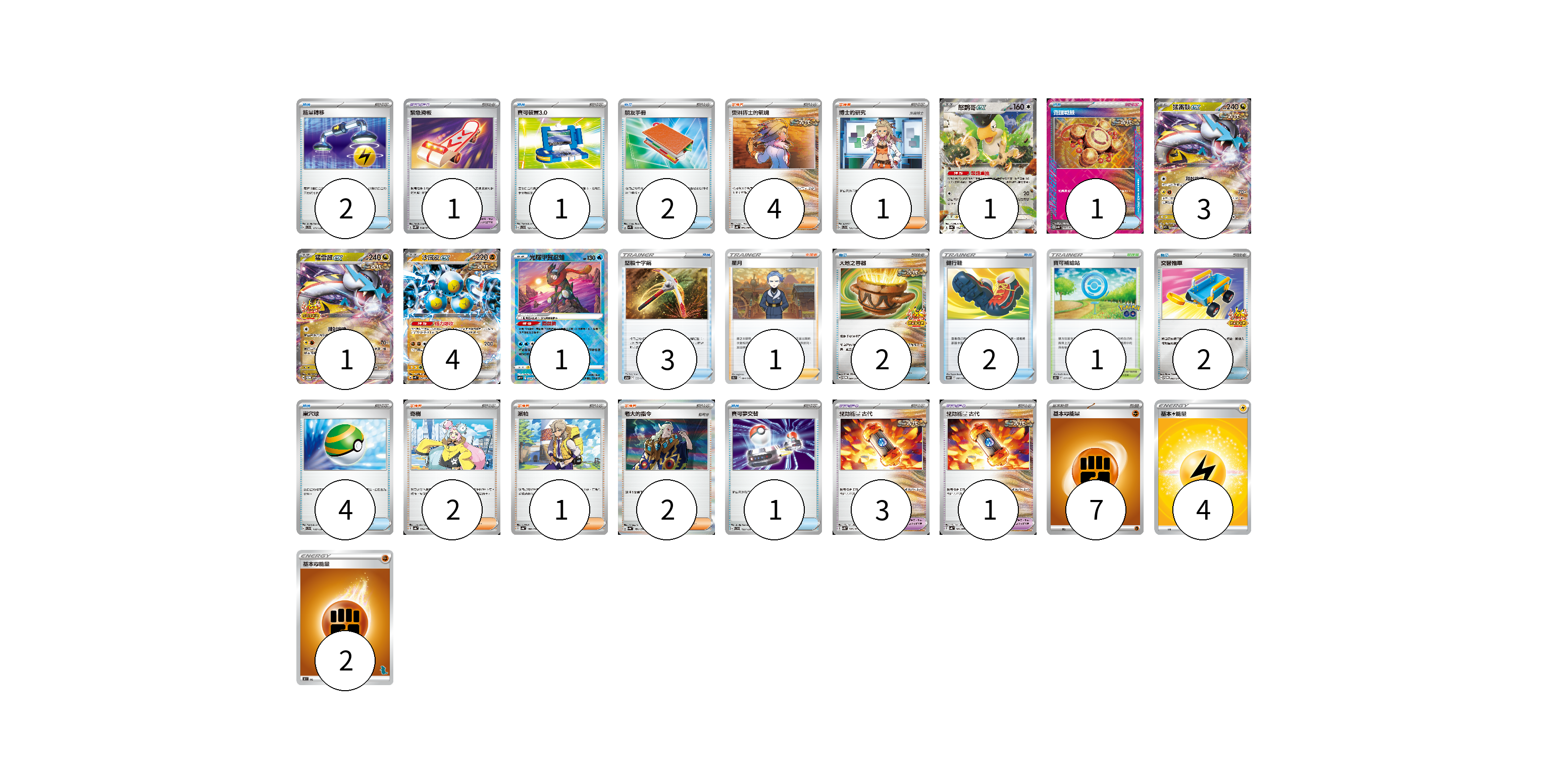 牌組構築方案 以此牌組為基礎新構築牌組 顯示卡面 顯示列表 寶可夢卡(10) 1 3 1 4 1 寶可夢道具(5) 1 3 1 物品卡(20) 2 1 2 1 3 2 2 2 4 1 支援者卡(11) 4 1 1 2 1 2 競技場卡(1) 1 能量卡(13) 7 4 2 寶可夢卡(10) 卡牌名稱 張數 卡牌名稱 張數 怒鸚哥ex SV4a 154/190 01 猛雷鼓ex SV5K 053/071 03 猛雷鼓ex SV-P 081/SV-P 01 沙鐵皮ex SV4K 042/066 04 光輝甲賀忍蛙 SVF 004/038 01 寶可夢道具(5) 卡牌名稱 張數 卡牌名稱 張數 緊急滑板 SV5K 064/071 01 驅勁能量 古代 SV5K 065/071 03 驅勁能量 古代 SV4K 061/066 01 物品卡(20) 卡牌名稱 張數 卡牌名稱 張數 能量轉移 SVD 111/139 02 寶可裝置3.0 SVD 121/139 01 朋友手冊 SV1S 069/078 02 覺醒戰鼓 SV5K 062/071 01 堅毅十字鎬 S12a 133/172 03 大地之容器 SV-P 084/SV-P 02 健行鞋 S10D 061/067 02 交替推車 SV-P 082/SV-P 02 巢穴球 SVD 118/139 04 寶可夢交替 SVD 122/139 01 支援者卡(11) 卡牌名稱 張數 卡牌名稱 張數 奧琳博士的氣魄 SV4K 064/066 04 博士的研究(奧琳博士) SVD 135/139 01 星月 S9a 064/067 01 奇樹 SV4a 174/190 02 派帕 SV4a 180/190 01 老大的指令 SV4a 181/190 02 競技場卡(1) 卡牌名稱 張數 卡牌名稱 張數 寶可補給站 S10b 071/071 01 能量卡(13) 卡牌名稱 張數 卡牌名稱 張數 基本【鬥】能量 SVF FIG 07 基本【雷】能量 SI LIG 04 基本鬥能量 SH FIG 02 以此牌組為基礎新構築牌組 牌組編碼 JtMDoD-dySWQL-ySoNhR copy 列印牌組單 牌組編碼已複製 分享至SNS