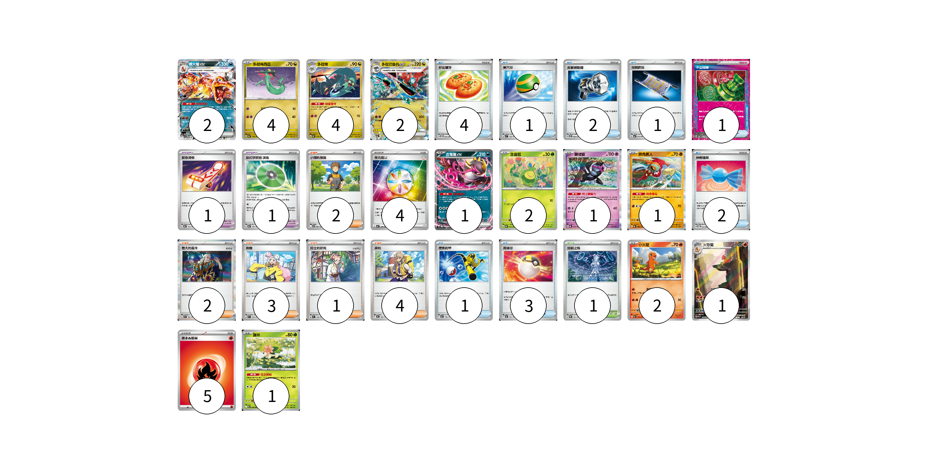 牌組構築方案 以此牌組為基礎新構築牌組 顯示卡面 顯示列表 寶可夢卡(21) 2 4 4 2 1 2 1 1 2 1 1 寶可夢道具(2) 1 1 物品卡(15) 4 1 2 1 1 2 1 3 支援者卡(12) 2 2 3 1 4 競技場卡(1) 1 能量卡(9) 4 5 寶可夢卡(21) 卡牌名稱 張數 卡牌名稱 張數 噴火龍ex SV3 066/108 02 多龍梅西亞 SV8a 118/187 04 多龍奇 SV8a 119/187 04 多龍巴魯托ex SV8a 120/187 02 吉雉雞ex SVOD 004/020 01 含羞苞 SV8a 001/187 02 願增猿 SV8a 075/187 01 摔角鷹人 SV8a 084/187 01 小火龍 SV4a 025/190 02 火恐龍 SV2a 169/165 01 謝米 SV9a 006/063 01 寶可夢道具(2) 卡牌名稱 張數 卡牌名稱 張數 緊急滑板 SV8a 153/187 01 招式學習器 演進 SV8a 160/187 01 物品卡(15) 卡牌名稱 張數 卡牌名稱 張數 好友寶芬 SVOM 012/021 04 巢穴球 SVM 133/175 01 反擊捕捉器 SVTS 009/022 02 夜間擔架 SV6a 056/064 01 不公印章 SV5a 053/066 01 神奇糖果 SVOD 013/020 02 厲害釣竿 SV4a 158/190 01 高級球 SV4a 161/190 03 支援者卡(12) 卡牌名稱 張數 卡牌名稱 張數 小剛的發掘 SV9 096/100 02 老大的指令 SV4a 181/190 02 奇樹 SVM 160/175 03 博士的研究 SVM 169/175 01 派帕 SV4a 180/190 04 競技場卡(1) 卡牌名稱 張數 卡牌名稱 張數 阻礙之塔 SV8a 181/187 01 能量卡(9) 卡牌名稱 張數 卡牌名稱 張數 夜光能量 SV4a 190/190 04 基本【火】能量 SVAL FIR 05 以此牌組為基礎新構築牌組 牌組編碼 JvFtHU-myQRzM-MSjYNa copy 列印牌組單 牌組編碼已複製 分享至SNS