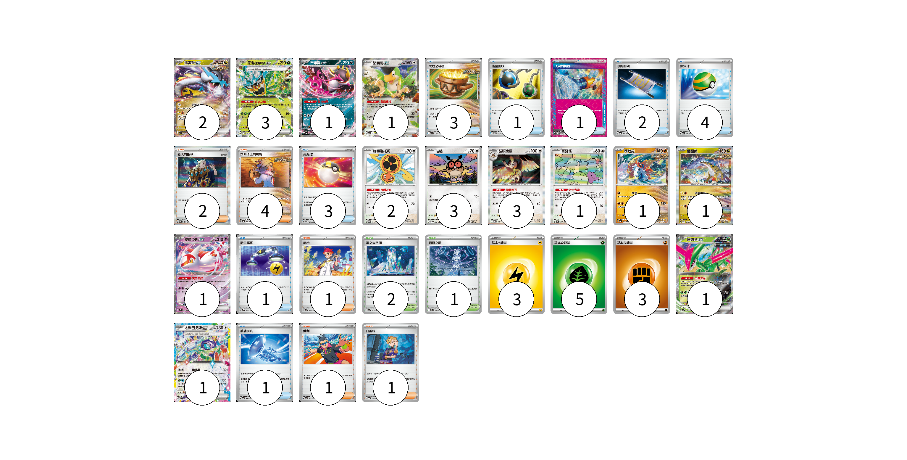 牌組構築方案 以此牌組為基礎新構築牌組 顯示卡面 顯示列表 寶可夢卡(21) 2 3 1 1 2 3 3 1 1 1 1 1 1 物品卡(16) 3 1 1 2 4 3 1 1 支援者卡(9) 2 4 1 1 1 競技場卡(3) 2 1 能量卡(11) 3 5 3 寶可夢卡(21) 卡牌名稱 張數 卡牌名稱 張數 猛雷鼓ex SV5K 053/071 02 厄鬼椪 碧草面具ex SV6 016/101 03 吉雉雞ex SV6a 038/064 01 怒鸚哥ex SV2P 065/071 01 旋轉洛托姆 SV8a 131/187 02 咕咕 SV7 076/102 03 貓頭夜鷹 SV8a 128/187 03 百變怪 SV4a 144/190 01 爬地翅 SV4K 041/066 01 猛雷鼓 SV7 075/102 01 拉帝亞斯ex SV7a 019/064 01 鐵斑葉ex SV8a 016/187 01 太樂巴戈斯ex M2a 145/193 01 物品卡(16) 卡牌名稱 張數 卡牌名稱 張數 大地之容器 SVK 012/042 03 能量回收 SVTM 009/022 01 頂尖捕捉器 SV5M 062/071 01 夜間擔架 SV6a 056/064 02 巢穴球 SV1S 070/078 04 高級球 SVTG 013/019 03 能量轉移 SVM 127/175 01 玻璃喇叭 M2a 149/193 01 支援者卡(9) 卡牌名稱 張數 卡牌名稱 張數 老大的指令 SV4a 181/190 02 奧琳博士的氣魄 SV4K 064/066 04 赤松 SV8a 163/187 01 裁判 SV9a 062/063 01 白蕾雅 SV8a 176/187 01 競技場卡(3) 卡牌名稱 張數 卡牌名稱 張數 零之大空洞 SV8a 182/187 02 阻礙之塔 SV8a 181/187 01 能量卡(11) 卡牌名稱 張數 卡牌名稱 張數 基本【雷】能量 SVF LIG 03 基本【草】能量 SVF GRA 05 基本【鬥】能量 SVF FIG 03 以此牌組為基礎新構築牌組 牌組編碼 JwAgWc-zzpSrx-MlMmtX copy 列印牌組單 牌組編碼已複製 分享至SNS