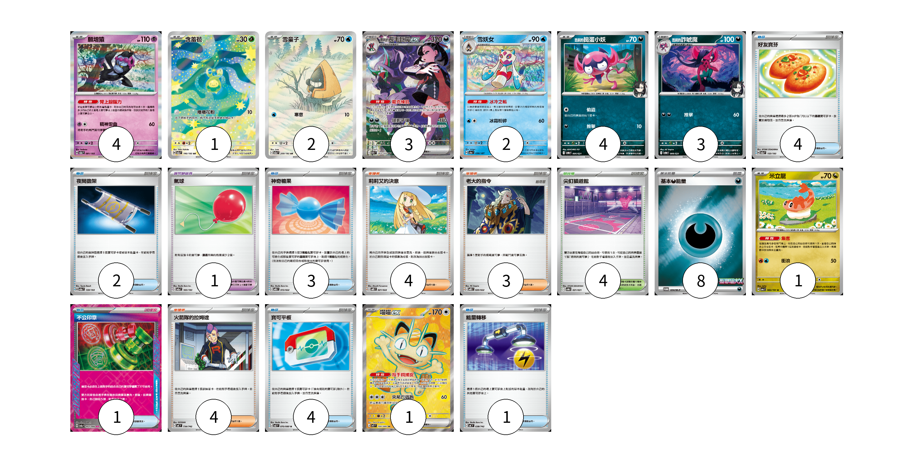 牌組構築方案 以此牌組為基礎新構築牌組 顯示卡面 顯示列表 寶可夢卡(21) 4 1 2 3 2 4 3 1 1 寶可夢道具(1) 1 物品卡(15) 4 2 3 1 4 1 支援者卡(11) 4 3 4 競技場卡(4) 4 能量卡(8) 8 寶可夢卡(21) 卡牌名稱 張數 卡牌名稱 張數 願增猿 M2a 081/193 04 含羞苞 M2a 196/193 01 雪童子 M2a 200/193 02 <瑪俐的>長毛巨魔ex M2a 243/193 03 雪妖女 SV8a 038/187 02 <瑪俐的>搗蛋小妖 SVOM 005/021 04 <瑪俐的>詐唬魔 SVOM 006/021 03 米立龍 SV6 082/101 01 喵喵ex M3 100/080 01 寶可夢道具(1) 卡牌名稱 張數 卡牌名稱 張數 氣球 M2a 165/193 01 物品卡(15) 卡牌名稱 張數 卡牌名稱 張數 好友寶芬 M2a 153/193 04 夜間擔架 M2a 159/193 02 神奇糖果 MBG 013/022 03 不公印章 SV5a 053/066 01 寶可平板 M3 070/080 04 能量轉移 MC 638/742 01 支援者卡(11) 卡牌名稱 張數 卡牌名稱 張數 莉莉艾的決意 MBD 021/022 04 老大的指令 MBD 020/022 03 火箭隊的拉姆達 MC 734/742 04 競技場卡(4) 卡牌名稱 張數 卡牌名稱 張數 尖釘鎮道館 SVOM 021/021 04 能量卡(8) 卡牌名稱 張數 卡牌名稱 張數 基本【惡】能量 M-P 034/M-P 08 以此牌組為基礎新構築牌組 牌組編碼 JzMSyh-oYPKYf-NlVbQC copy 列印牌組單 牌組編碼已複製 分享至SNS