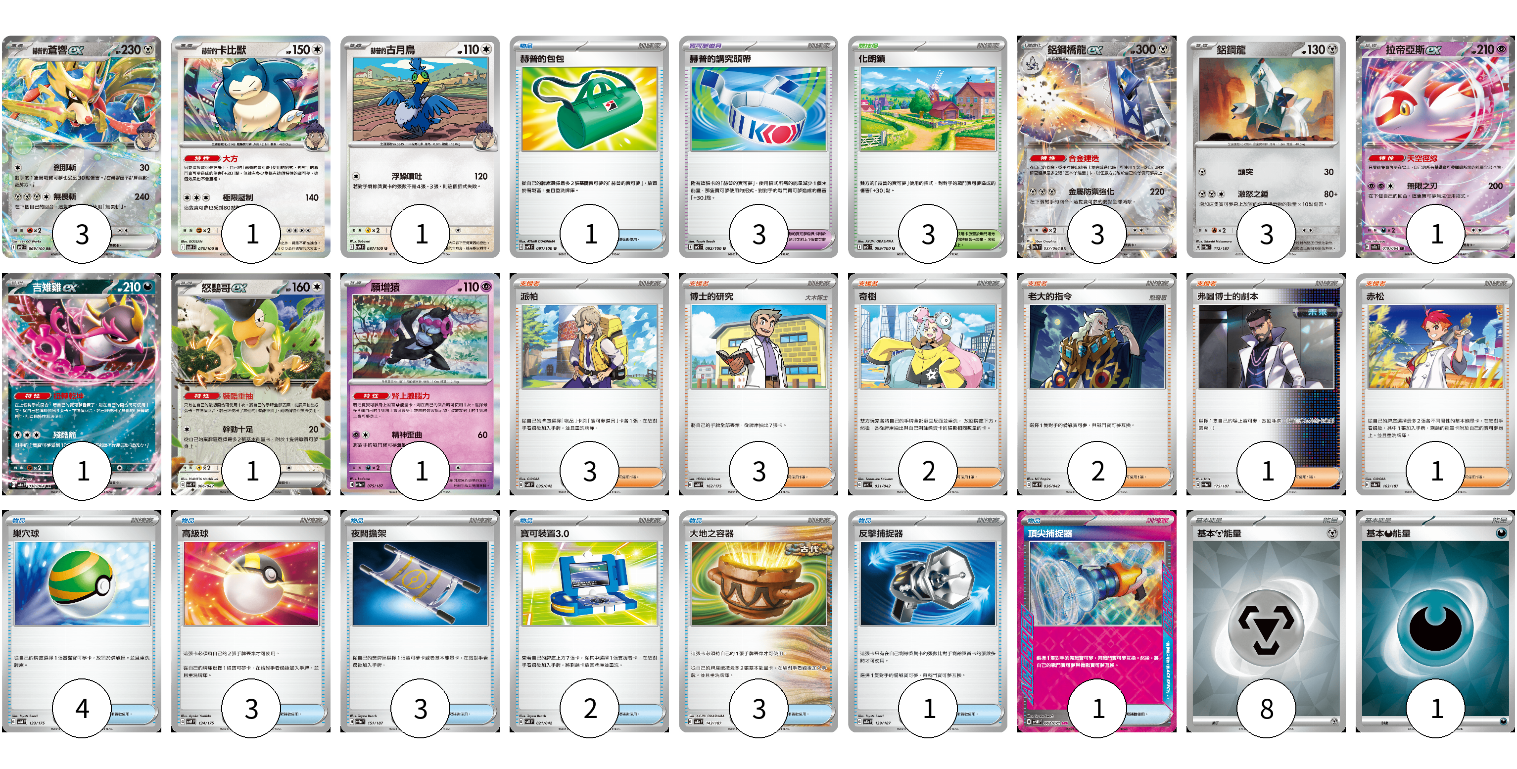 牌組構築方案 以此牌組為基礎新構築牌組 顯示卡面 顯示列表 寶可夢卡(15) 3 1 1 3 3 1 1 1 1 寶可夢道具(3) 3 物品卡(18) 1 4 3 3 2 3 1 1 支援者卡(12) 3 3 2 2 1 1 競技場卡(3) 3 能量卡(9) 8 1 寶可夢卡(15) 卡牌名稱 張數 卡牌名稱 張數 赫普的蒼響ex SV9 069/100 03 赫普的卡比獸 SV9 075/100 01 赫普的古月鳥 SV9 087/100 01 鋁鋼橋龍ex SV7a 037/064 03 鋁鋼龍 SV8a 112/187 03 拉帝亞斯ex SV7a 019/064 01 吉雉雞ex SV6a 038/064 01 怒鸚哥ex SVK 006/042 01 願增猿 SV8a 075/187 01 寶可夢道具(3) 卡牌名稱 張數 卡牌名稱 張數 赫普的講究頭帶 SV9 092/100 03 物品卡(18) 卡牌名稱 張數 卡牌名稱 張數 赫普的包包 SV9 091/100 01 巢穴球 SVM 133/175 04 高級球 SVM 134/175 03 夜間擔架 SV8a 151/187 03 寶可裝置3.0 SVK 021/042 02 大地之容器 SV8a 143/187 03 反擊捕捉器 SV8a 139/187 01 頂尖捕捉器 SV5M 062/071 01 支援者卡(12) 卡牌名稱 張數 卡牌名稱 張數 派帕 SVK 035/042 03 博士的研究 SVM 162/175 03 奇樹 SVK 031/042 02 老大的指令 SVK 036/042 02 弗圖博士的劇本 SV8a 175/187 01 赤松 SV8a 163/187 01 競技場卡(3) 卡牌名稱 張數 卡牌名稱 張數 化朗鎮 SV9 099/100 03 能量卡(9) 卡牌名稱 張數 卡牌名稱 張數 基本【鋼】能量 SVK MET 08 基本【惡】能量 SVK DAR 01 以此牌組為基礎新構築牌組 牌組編碼 KBCpRN-aHsfsz-OMUYfK copy 列印牌組單 牌組編碼已複製 分享至SNS