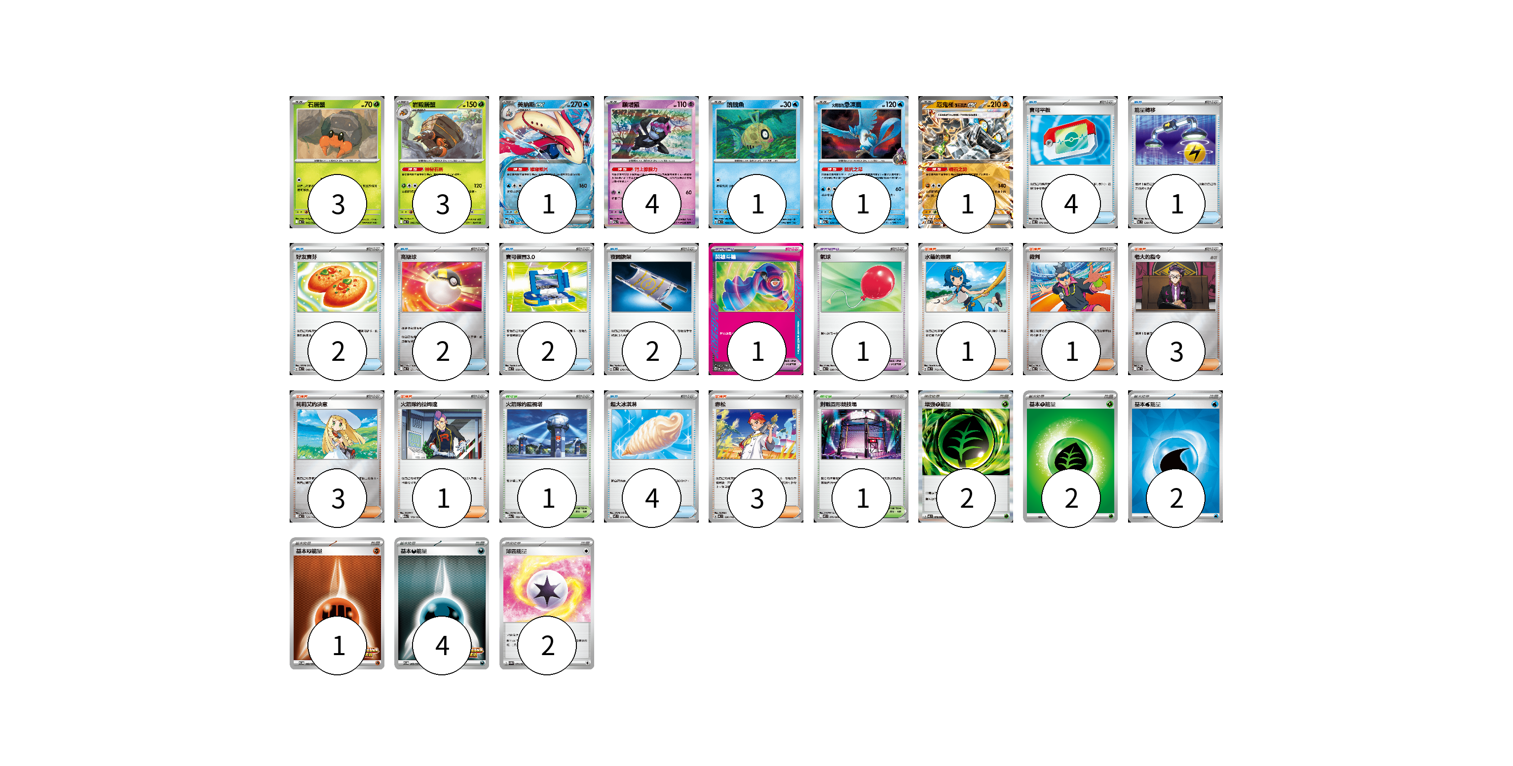 牌組構築方案 以此牌組為基礎新構築牌組 顯示卡面 顯示列表 寶可夢卡(14) 3 3 1 4 1 1 1 寶可夢道具(2) 1 1 物品卡(17) 4 1 2 2 2 2 4 支援者卡(12) 1 1 3 3 1 3 競技場卡(2) 1 1 能量卡(13) 2 2 2 1 4 2 寶可夢卡(14) 卡牌名稱 張數 卡牌名稱 張數 石居蟹 MC 045/742 03 岩殿居蟹 MC 046/742 03 美納斯ex MC 185/742 01 願增猿 M2a 081/193 04 醜醜魚 MC 184/742 01 <火箭隊的>急凍鳥 M2a 034/193 01 厄鬼椪 礎石面具ex MC 428/742 01 寶可夢道具(2) 卡牌名稱 張數 卡牌名稱 張數 英雄斗篷 MC 687/742 01 氣球 MC 688/742 01 物品卡(17) 卡牌名稱 張數 卡牌名稱 張數 寶可平板 M3 070/080 04 能量轉移 MC 638/742 01 好友寶芬 MC 648/742 02 高級球 MC 651/742 02 寶可裝置3.0 MC 660/742 02 夜間擔架 MC 670/742 02 超大冰淇淋 M2 073/080 04 支援者卡(12) 卡牌名稱 張數 卡牌名稱 張數 水蓮的照顧 MC 712/742 01 裁判 MC 711/742 01 老大的指令 MC 724/742 03 莉莉艾的決意 MC 729/742 03 火箭隊的拉姆達 M2a 179/193 01 赤松 MC 696/742 03 競技場卡(2) 卡牌名稱 張數 卡牌名稱 張數 火箭隊的監視塔 M2a 189/193 01 對戰圓形競技場 M2 079/080 01 能量卡(13) 卡牌名稱 張數 卡牌名稱 張數 增強【草】能量 M3 078/080 02 基本【草】能量 MJ GRA 02 基本【水】能量 SVM WAT 02 基本【鬥】能量 SV-P 262/SV-P 01 基本【惡】能量 SV-P 263/SV-P 04 薄霧能量 SV5M 071/071 02 以此牌組為基礎新構築牌組 牌組編碼 KHjlFc-kvobcW-VeiGJG copy 列印牌組單 牌組編碼已複製 分享至SNS