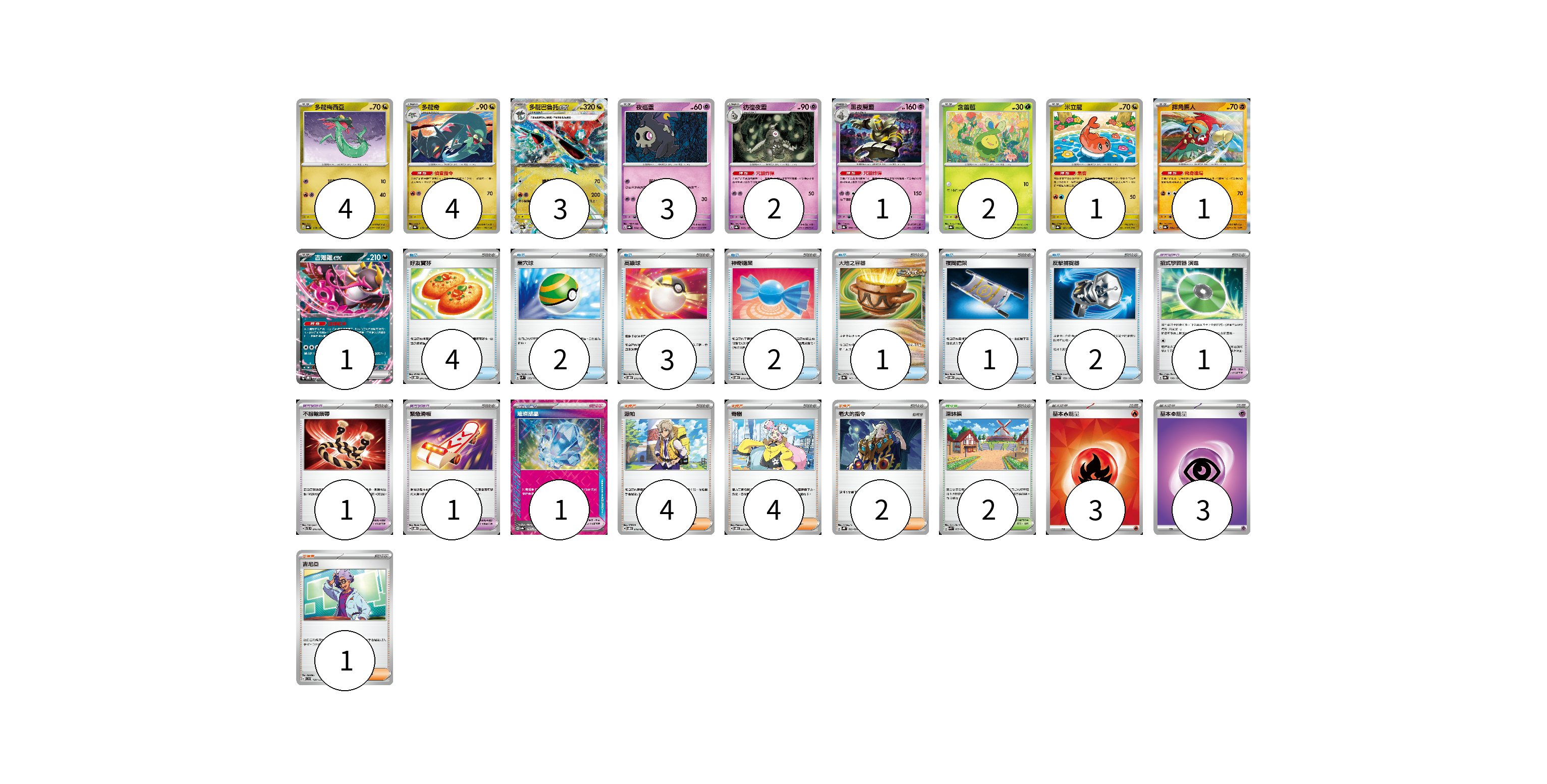 牌組構築方案 以此牌組為基礎新構築牌組 顯示卡面 顯示列表 寶可夢卡(22) 4 4 3 3 2 1 2 1 1 1 寶可夢道具(4) 1 1 1 1 物品卡(15) 4 2 3 2 1 1 2 支援者卡(11) 4 4 2 1 競技場卡(2) 2 能量卡(6) 3 3 寶可夢卡(22) 卡牌名稱 張數 卡牌名稱 張數 多龍梅西亞 SV8a 118/187 04 多龍奇 SV8a 119/187 04 多龍巴魯托ex SV8a 120/187 03 夜巡靈 SV8a 064/187 03 彷徨夜靈 SV8a 065/187 02 黑夜魔靈 SV8a 066/187 01 含羞苞 SV8a 001/187 02 米立龍 SV8a 121/187 01 摔角鷹人 SV8a 084/187 01 吉雉雞ex SVOD 004/020 01 寶可夢道具(4) 卡牌名稱 張數 卡牌名稱 張數 招式學習器 演進 SV8a 160/187 01 不服輸頭帶 SVTL 016/021 01 緊急滑板 SVOD 015/020 01 璀璨結晶 SV8a 152/187 01 物品卡(15) 卡牌名稱 張數 卡牌名稱 張數 好友寶芬 SVOD 011/020 04 巢穴球 SVM 133/175 02 高級球 SVOD 012/020 03 神奇糖果 SVOD 013/020 02 大地之容器 SV8a 143/187 01 夜間擔架 SVOM 016/021 01 反擊捕捉器 SV8a 139/187 02 支援者卡(11) 卡牌名稱 張數 卡牌名稱 張數 派帕 SVOD 018/020 04 奇樹 SVOD 016/020 04 老大的指令 SVHK 022/022 02 吉尼亞 SVD 129/139 01 競技場卡(2) 卡牌名稱 張數 卡牌名稱 張數 深缽鎮 SVK 039/042 02 能量卡(6) 卡牌名稱 張數 卡牌名稱 張數 基本【火】能量 SVK FIR 03 基本【超】能量 SVTS PSY 03 以此牌組為基礎新構築牌組 牌組編碼 KLYWUb-yqiduN-QOGJNY copy 列印牌組單 牌組編碼已複製 分享至SNS