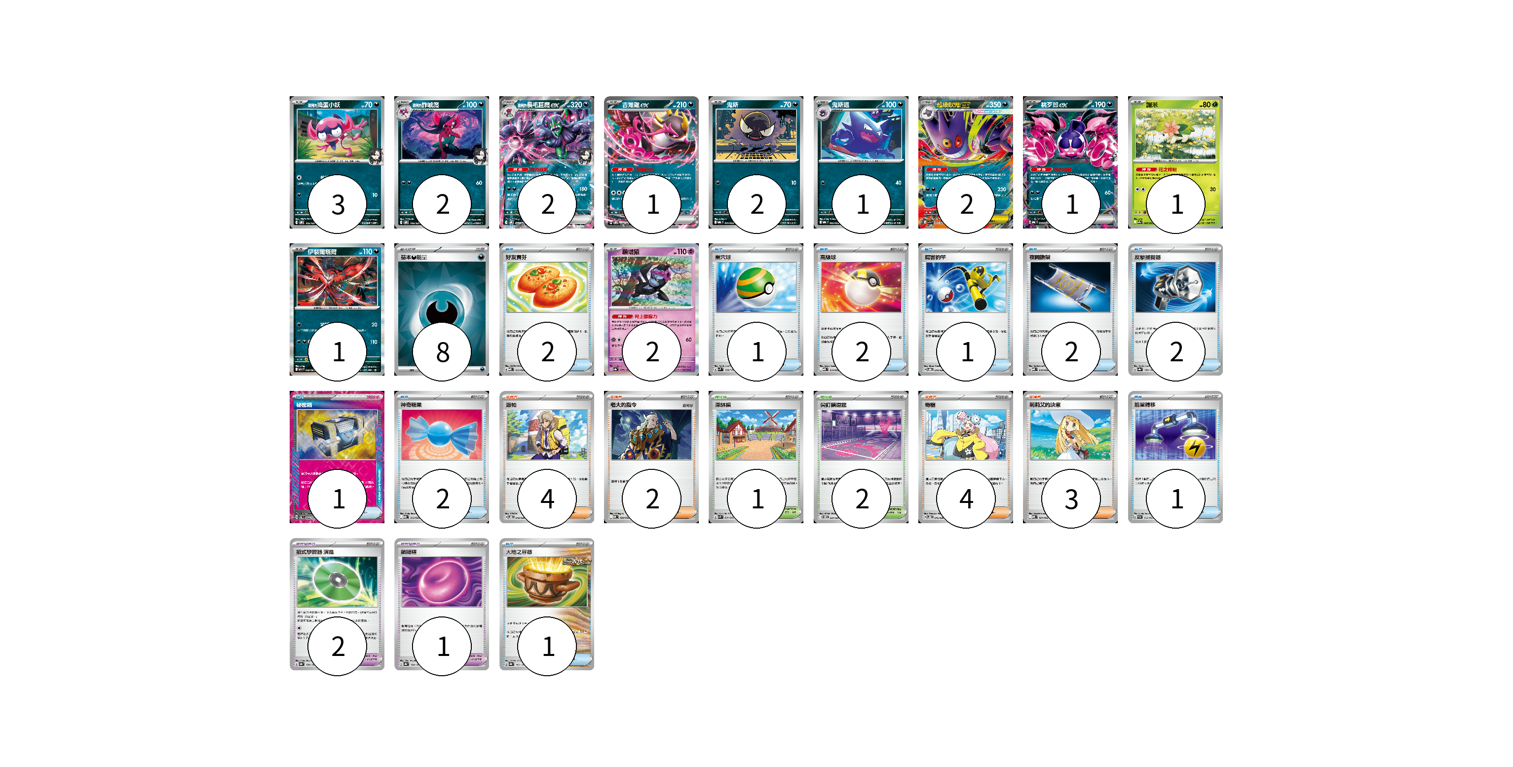 牌組構築方案 以此牌組為基礎新構築牌組 顯示卡面 顯示列表 寶可夢卡(18) 3 2 2 1 2 1 2 1 1 1 2 寶可夢道具(3) 2 1 物品卡(15) 2 1 2 1 2 2 1 2 1 1 支援者卡(13) 4 2 4 3 競技場卡(3) 1 2 能量卡(8) 8 寶可夢卡(18) 卡牌名稱 張數 卡牌名稱 張數 <瑪俐的>搗蛋小妖 SVOM 005/021 03 <瑪俐的>詐唬魔 SVOM 006/021 02 <瑪俐的>長毛巨魔ex SVOM 007/021 02 吉雉雞ex SVOM 009/021 01 鬼斯 MBG 001/022 02 鬼斯通 MBG 002/022 01 超級耿鬼ex MBG 003/022 02 桃歹郎ex MBG 009/022 01 謝米 SV9a 006/063 01 伊裴爾塔爾 M1L 040/063 01 願增猿 SV8a 075/187 02 寶可夢道具(3) 卡牌名稱 張數 卡牌名稱 張數 招式學習器 演進 SV8a 160/187 02 鎖鏈糬 SV8a 154/187 01 物品卡(15) 卡牌名稱 張數 卡牌名稱 張數 好友寶芬 MBD 013/022 02 巢穴球 SVM 133/175 01 高級球 MBD 014/022 02 厲害釣竿 SVOD 010/020 01 夜間擔架 MBD 016/022 02 反擊捕捉器 SV8a 139/187 02 秘密箱 SV6 092/101 01 神奇糖果 MBG 013/022 02 能量轉移 SVAM 012/023 01 大地之容器 SV8a 143/187 01 支援者卡(13) 卡牌名稱 張數 卡牌名稱 張數 派帕 SVOD 018/020 04 老大的指令 MBD 020/022 02 奇樹 SVOD 016/020 04 莉莉艾的決意 MBD 021/022 03 競技場卡(3) 卡牌名稱 張數 卡牌名稱 張數 深缽鎮 SVK 039/042 01 尖釘鎮道館 SVOM 021/021 02 能量卡(8) 卡牌名稱 張數 卡牌名稱 張數 基本【惡】能量 SVOM DAR 08 以此牌組為基礎新構築牌組 牌組編碼 KLkeNA-ymOxQU-QYPaJJ copy 列印牌組單 牌組編碼已複製 分享至SNS