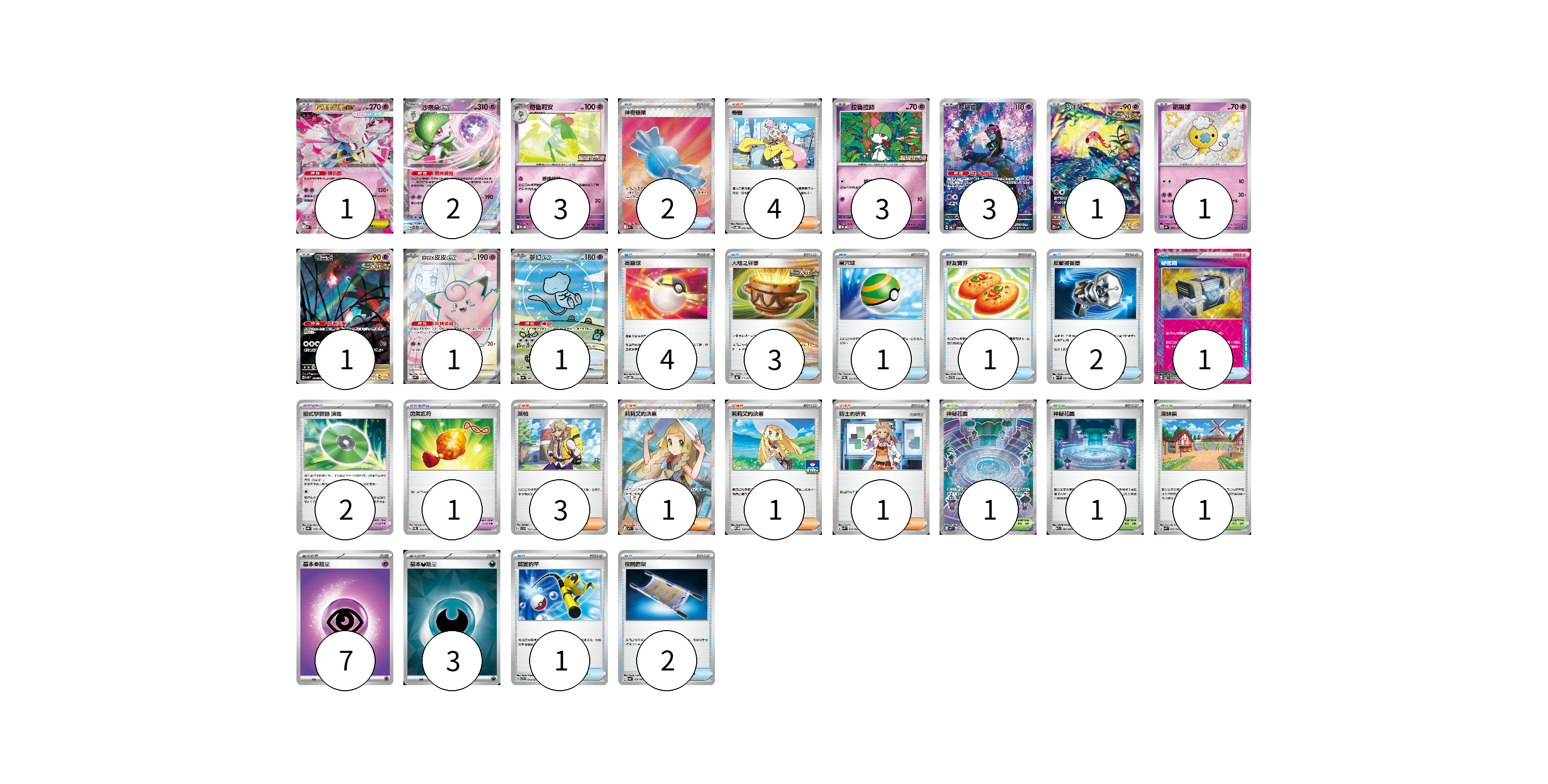 牌組構築方案 以此牌組為基礎新構築牌組 顯示卡面 顯示列表 寶可夢卡(17) 1 2 3 3 3 1 1 1 1 1 寶可夢道具(3) 2 1 物品卡(17) 2 4 3 1 1 2 1 1 2 支援者卡(10) 4 3 1 1 1 競技場卡(3) 1 1 1 能量卡(10) 7 3 寶可夢卡(17) 卡牌名稱 張數 卡牌名稱 張數 超級蒂安希ex MBD 006/022 01 沙奈朵ex SVTS 004/022 02 奇魯莉安 M-P 006/M-P 03 拉魯拉絲 M-P 005/M-P 03 願增猿 SV6 107/101 03 吼叫尾 SV4K 071/066 01 飄飄球 SV4a 260/190 01 振翼髮 SV5K 076/071 01 莉莉艾的皮皮ex SV9 115/100 01 夢幻ex SV4a 347/190 01 寶可夢道具(3) 卡牌名稱 張數 卡牌名稱 張數 招式學習器 演進 SV8a 160/187 02 勇氣護符 SVEM 016/020 01 物品卡(17) 卡牌名稱 張數 卡牌名稱 張數 神奇糖果 M1S 082/063 02 高級球 SVOD 012/020 04 大地之容器 SVHK 011/022 03 巢穴球 SVEM 012/020 01 好友寶芬 SVTH 009/018 01 反擊捕捉器 SV4M 059/066 02 秘密箱 SV6 092/101 01 厲害釣竿 SVTR 012/021 01 夜間擔架 SV6a 056/064 02 支援者卡(10) 卡牌名稱 張數 卡牌名稱 張數 奇樹 SVOD 016/020 04 派帕 SVD 137/139 03 莉莉艾的決意 M1L 086/063 01 莉莉艾的決意 M-P 018/M-P 01 博士的研究 SVK 032/042 01 競技場卡(3) 卡牌名稱 張數 卡牌名稱 張數 神秘花園 M1S 086/063 01 神秘花園 M1S 063/063 01 深缽鎮 SVK 039/042 01 能量卡(10) 卡牌名稱 張數 卡牌名稱 張數 基本【超】能量 M-P PSY 07 基本【惡】能量 SVOM DAR 03 以此牌組為基礎新構築牌組 牌組編碼 KMWhOd-iAkCdv-TBcBzA copy 列印牌組單 牌組編碼已複製 分享至SNS