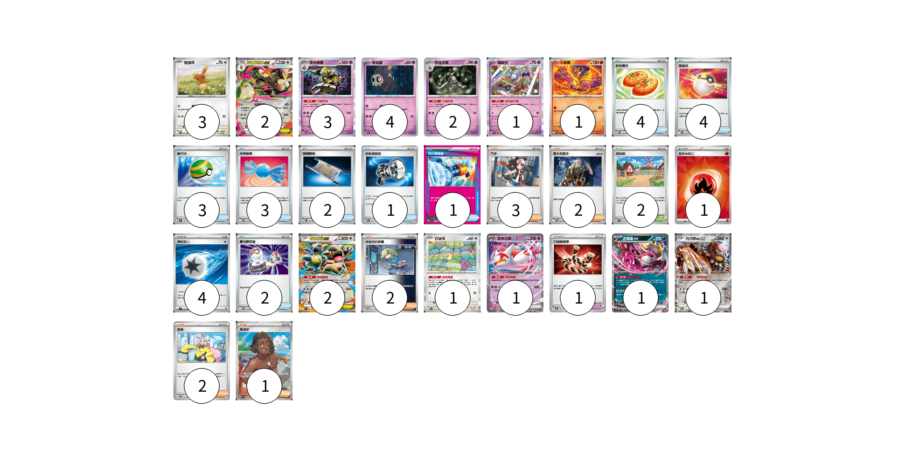 牌組構築方案 以此牌組為基礎新構築牌組 顯示卡面 顯示列表 寶可夢卡(22) 3 2 3 4 2 1 1 2 1 1 1 1 寶可夢道具(1) 1 物品卡(20) 4 4 3 3 2 1 1 2 支援者卡(10) 3 2 2 2 1 競技場卡(2) 2 能量卡(5) 1 4 寶可夢卡(22) 卡牌名稱 張數 卡牌名稱 張數 捲捲耳 M2 071/080 03 超級長耳兔ex M2 072/080 02 黑夜魔靈 SV8a 066/187 03 夜巡靈 SV8a 064/187 04 彷徨夜靈 SV8a 065/187 02 鑰圈兒 SV4a 087/190 01 火焰鳥 M2 014/080 01 超級袋獸ex M1S 051/063 02 百變怪 SV4a 144/190 01 拉帝亞斯ex MBD 003/022 01 吉雉雞ex SVOD 004/020 01 月月熊 赫月ex SV8a 134/187 01 寶可夢道具(1) 卡牌名稱 張數 卡牌名稱 張數 不服輸頭帶 SV4a 168/190 01 物品卡(20) 卡牌名稱 張數 卡牌名稱 張數 好友寶芬 MBD 013/022 04 高級球 MBD 014/022 04 巢穴球 SVM 133/175 03 神奇糖果 MBG 013/022 03 夜間擔架 MBD 016/022 02 反擊捕捉器 SV8a 139/187 01 頂尖捕捉器 MBG 014/022 01 寶可夢交替 MBG 015/022 02 支援者卡(10) 卡牌名稱 張數 卡牌名稱 張數 鬥子 SV11W 085/086 03 老大的指令 MBD 020/022 02 暗碼迷的解讀 SV5M 067/071 02 奇樹 SVEL 016/020 02 衝浪手 SV7a 084/064 01 競技場卡(2) 卡牌名稱 張數 卡牌名稱 張數 深缽鎮 SVK 039/042 02 能量卡(5) 卡牌名稱 張數 卡牌名稱 張數 基本【火】能量 SVQL FIR 01 噴射能量 SV1a 072/073 04 以此牌組為基礎新構築牌組 牌組編碼 KNsroF-KFJLpA-QiiUKP copy 列印牌組單 牌組編碼已複製 分享至SNS