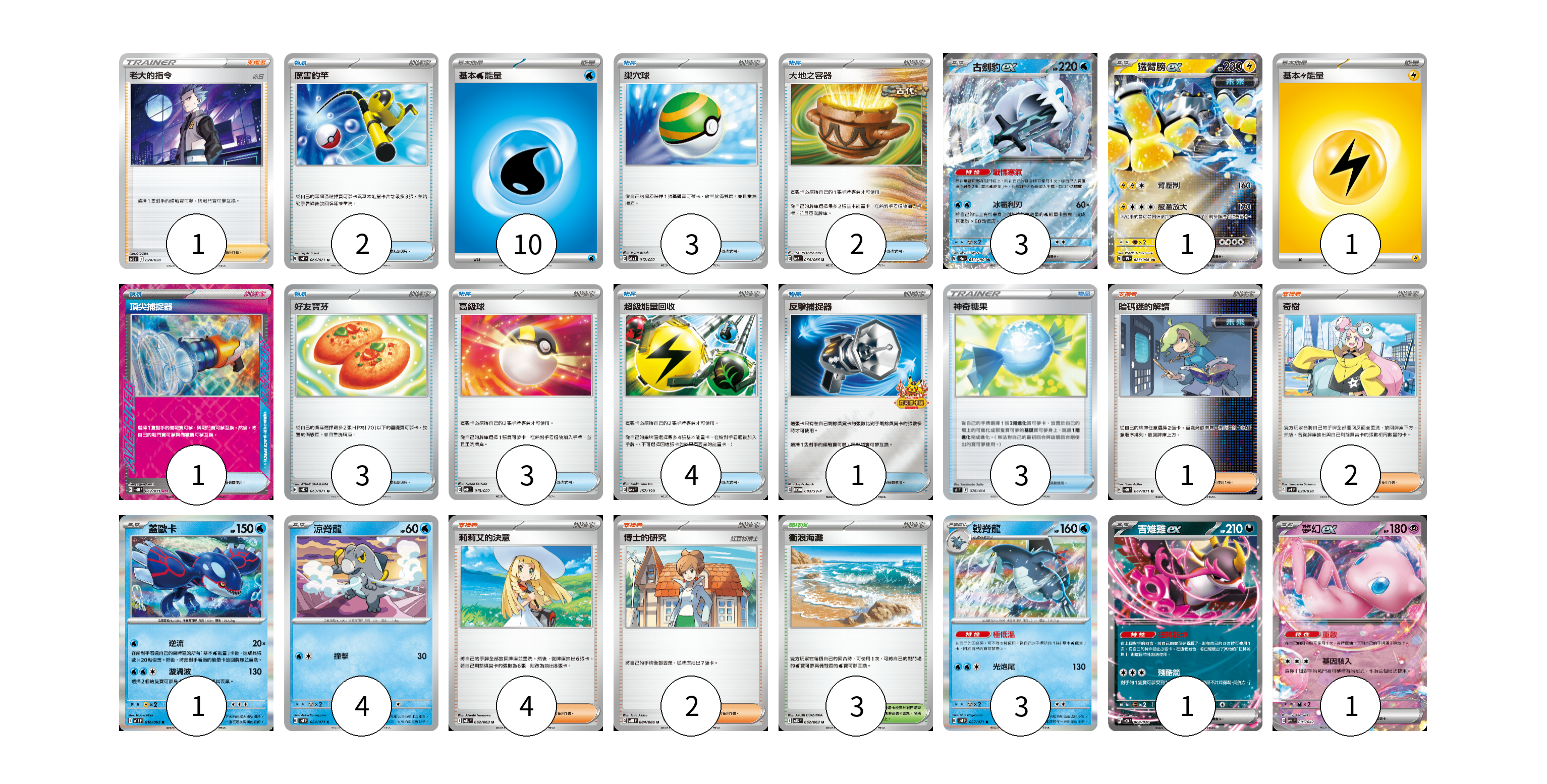 牌組構築方案 以此牌組為基礎新構築牌組 顯示卡面 顯示列表 寶可夢卡(14) 3 1 1 4 3 1 1 物品卡(22) 2 3 2 1 3 3 4 1 3 支援者卡(10) 1 1 2 4 2 競技場卡(3) 3 能量卡(11) 10 1 寶可夢卡(14) 卡牌名稱 張數 卡牌名稱 張數 古劍豹ex SV4a 054/190 03 鐵臂膀ex SV4M 027/066 01 蓋歐卡 M1S 016/063 01 涼脊龍 SV2P 024/071 04 戟脊龍 SV2P 027/071 03 吉雉雞ex SVOD 004/020 01 夢幻ex SVK 001/042 01 物品卡(22) 卡牌名稱 張數 卡牌名稱 張數 厲害釣竿 SV2P 066/071 02 巢穴球 SVHM 012/022 03 大地之容器 SV4K 060/066 02 頂尖捕捉器 SV5M 062/071 01 好友寶芬 SV5K 063/071 03 高級球 SVHK 013/022 03 超級能量回收 SV4a 157/190 04 反擊捕捉器 SV-P 083/SV-P 01 神奇糖果 SI 376/414 03 支援者卡(10) 卡牌名稱 張數 卡牌名稱 張數 老大的指令(赤日) SVB 024/028 01 暗碼迷的解讀 SV5M 067/071 01 奇樹 SVF 029/038 02 莉莉艾的決意 M1L 062/063 04 博士的研究 SV11B 084/086 02 競技場卡(3) 卡牌名稱 張數 卡牌名稱 張數 衝浪海灘 M1S 062/063 03 能量卡(11) 卡牌名稱 張數 卡牌名稱 張數 基本水能量 sv-p WAT 10 基本【雷】能量 SVHM LIG 01 以此牌組為基礎新構築牌組 牌組編碼 KPIXjr-gwVwzy-SsZiQT copy 列印牌組單 牌組編碼已複製 分享至SNS