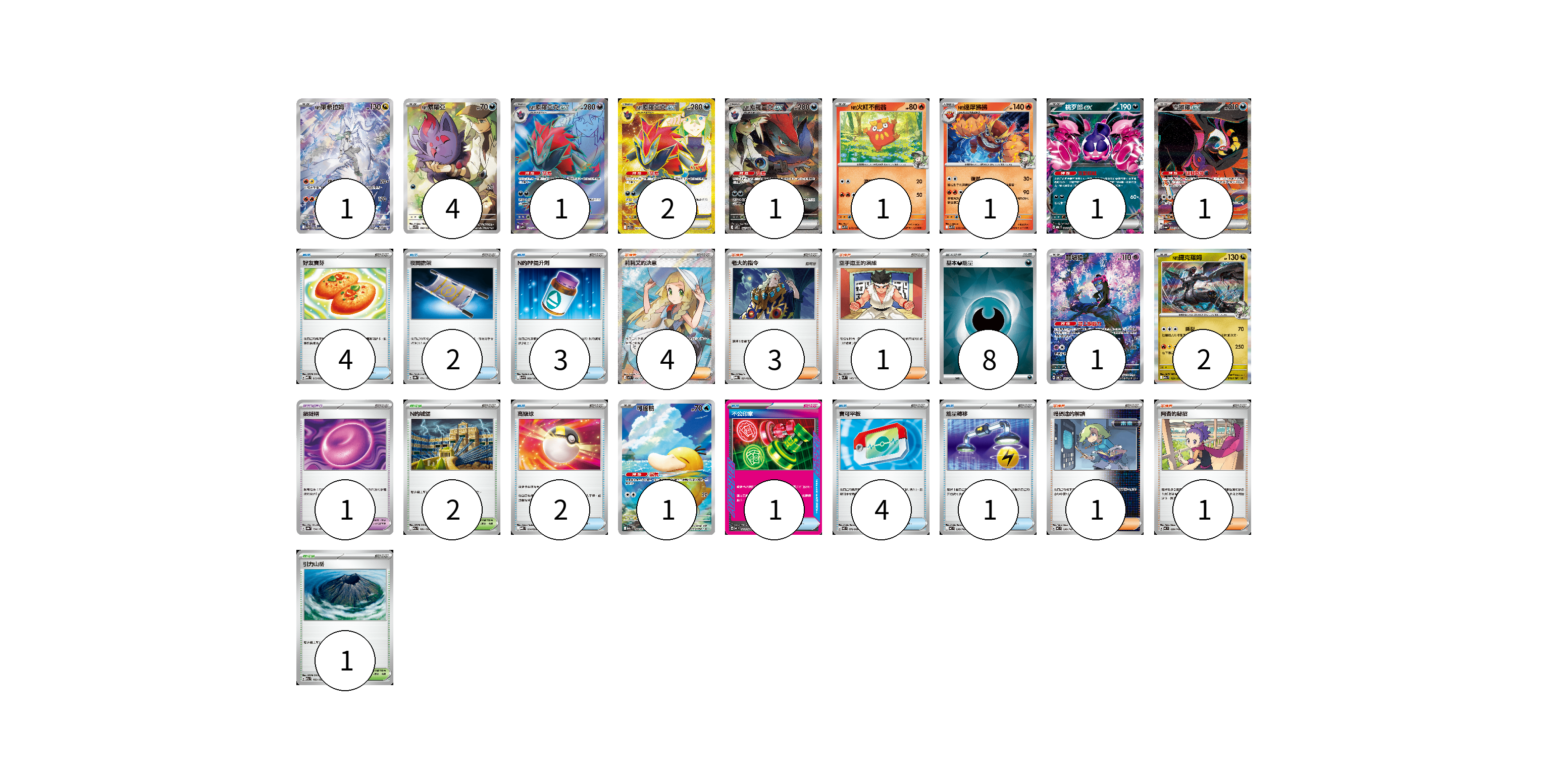 牌組構築方案 以此牌組為基礎新構築牌組 顯示卡面 顯示列表 寶可夢卡(17) 1 4 1 2 1 1 1 1 1 1 2 1 寶可夢道具(1) 1 物品卡(17) 4 2 3 2 1 4 1 支援者卡(10) 4 3 1 1 1 競技場卡(3) 2 1 能量卡(8) 8 寶可夢卡(17) 卡牌名稱 張數 卡牌名稱 張數 N的萊希拉姆 SV9 109/100 01 N的索羅亞 SV9 108/100 04 N的索羅亞克ex SV9 117/100 01 N的索羅亞克ex SV9 131/100 02 N的索羅亞克ex SV9 127/100 01 N的火紅不倒翁 SV9 015/100 01 N的達摩狒狒 SV9 016/100 01 桃歹郎ex MBG 009/022 01 吉雉雞ex SV6a 089/064 01 願增猿 SV6 107/101 01 N的捷克羅姆 M2a 129/193 02 可達鴨 M2a 199/193 01 寶可夢道具(1) 卡牌名稱 張數 卡牌名稱 張數 鎖鏈糬 SV8a 154/187 01 物品卡(17) 卡牌名稱 張數 卡牌名稱 張數 好友寶芬 MBD 013/022 04 夜間擔架 SV8a 151/187 02 N的PP提升劑 SV9 089/100 03 高級球 MBD 014/022 02 不公印章 MC 633/742 01 寶可平板 M3 070/080 04 能量轉移 MC 638/742 01 支援者卡(10) 卡牌名稱 張數 卡牌名稱 張數 莉莉艾的決意 M1L 086/063 04 老大的指令 MBG 021/022 03 空手道王的演練 SVM 143/175 01 暗碼迷的解讀 MC 698/742 01 阿杏的秘招 MC 699/742 01 競技場卡(3) 卡牌名稱 張數 卡牌名稱 張數 N的城堡 M2a 181/193 02 引力山岳 M2a 183/193 01 能量卡(8) 卡牌名稱 張數 卡牌名稱 張數 基本【惡】能量 SVOM DAR 08 以此牌組為基礎新構築牌組 牌組編碼 KPPgtK-igJaxX-tcxgnk copy 列印牌組單 牌組編碼已複製 分享至SNS