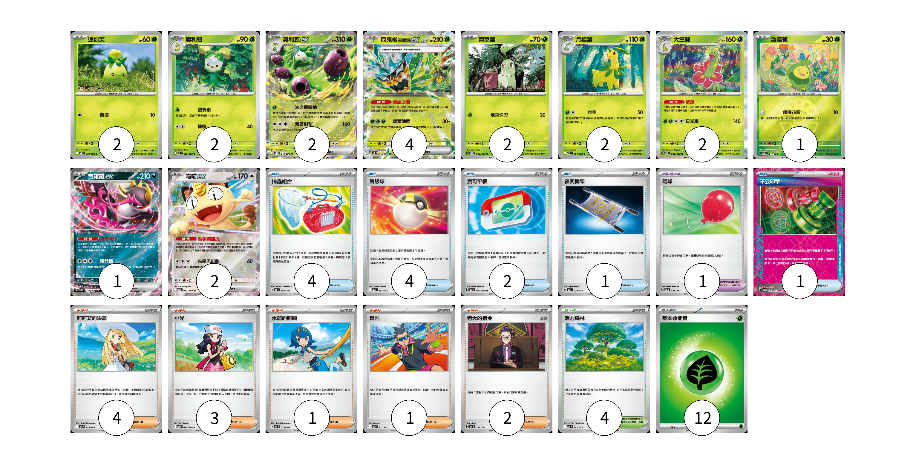 牌組構築方案 以此牌組為基礎新構築牌組 顯示卡面 顯示列表 寶可夢卡(20) 2 2 2 4 2 2 2 1 1 2 寶可夢道具(1) 1 物品卡(12) 4 4 2 1 1 支援者卡(11) 4 3 1 1 2 競技場卡(4) 4 能量卡(12) 12 寶可夢卡(20) 卡牌名稱 張數 卡牌名稱 張數 迷你芙 SV10 010/098 02 奧利紐 SV10 011/098 02 奧利瓦ex SV10 012/098 02 厄鬼椪 碧草面具ex SV6 016/101 04 菊草葉 M1S 003/063 02 月桂葉 M1S 004/063 02 大竺葵 M1S 005/063 02 含羞苞 M2a 011/193 01 吉雉雞ex SV6a 038/064 01 喵喵ex M3 061/080 02 寶可夢道具(1) 卡牌名稱 張數 卡牌名稱 張數 氣球 MC 688/742 01 物品卡(12) 卡牌名稱 張數 卡牌名稱 張數 捕蟲組合 MC 667/742 04 高級球 MC 651/742 04 寶可平板 M3 070/080 02 夜間擔架 MC 670/742 01 不公印章 SV5a 053/066 01 支援者卡(11) 卡牌名稱 張數 卡牌名稱 張數 莉莉艾的決意 MC 729/742 04 小光 M2 077/080 03 水蓮的照顧 MC 712/742 01 裁判 MC 711/742 01 老大的指令 MC 724/742 02 競技場卡(4) 卡牌名稱 張數 卡牌名稱 張數 活力森林 M2a 182/193 04 能量卡(12) 卡牌名稱 張數 卡牌名稱 張數 基本【草】能量 MC GRA 12 以此牌組為基礎新構築牌組 牌組編碼 KRIerE-AeySYt-IQbUpC copy 列印牌組單 牌組編碼已複製 分享至SNS