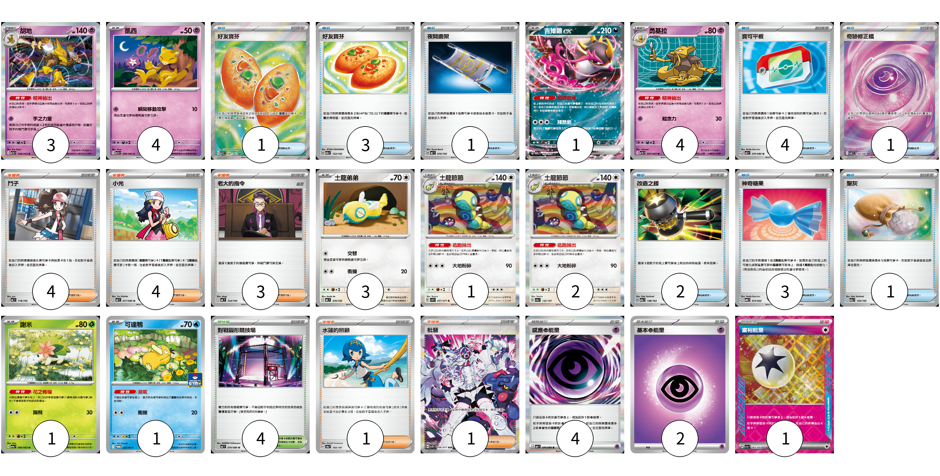 牌組構築方案 以此牌組為基礎新構築牌組 顯示卡面 顯示列表 寶可夢卡(20) 3 4 1 4 3 1 2 1 1 物品卡(16) 1 3 1 4 1 2 3 1 支援者卡(13) 4 4 3 1 1 競技場卡(4) 4 能量卡(7) 4 2 1 寶可夢卡(20) 卡牌名稱 張數 卡牌名稱 張數 胡地 M1S 038/063 03 凱西 M1S 036/063 04 吉雉雞ex M2a 114/193 01 勇基拉 M1S 037/063 04 土龍弟弟 MC 574/742 03 土龍節節 SV5K 057/071 01 土龍節節 SV8a 130/187 02 謝米 SV9a 006/063 01 可達鴨 SV-P 220/SV-P 01 物品卡(16) 卡牌名稱 張數 卡牌名稱 張數 好友寶芬 M1S 081/063 01 好友寶芬 M2a 153/193 03 夜間擔架 MC 670/742 01 寶可平板 M3 070/080 04 奇跡修正檔 M3 104/080 01 改造之錘 M2a 148/193 02 神奇糖果 MBG 013/022 03 聖灰 M2a 150/193 01 支援者卡(13) 卡牌名稱 張數 卡牌名稱 張數 鬥子 MC 718/742 04 小光 M2 077/080 04 老大的指令 MC 724/742 03 水蓮的照顧 SV8a 168/187 01 枇琶 SV5K 096/071 01 競技場卡(4) 卡牌名稱 張數 卡牌名稱 張數 對戰圓形競技場 M2 079/080 04 能量卡(7) 卡牌名稱 張數 卡牌名稱 張數 感應【超】能量 M3 079/080 04 基本【超】能量 M-P PSY 02 富裕能量 SV7a 064/064 01 以此牌組為基礎新構築牌組 牌組編碼 KUTYnQ-CpYRZj-evyeeS copy 列印牌組單 牌組編碼已複製 分享至SNS