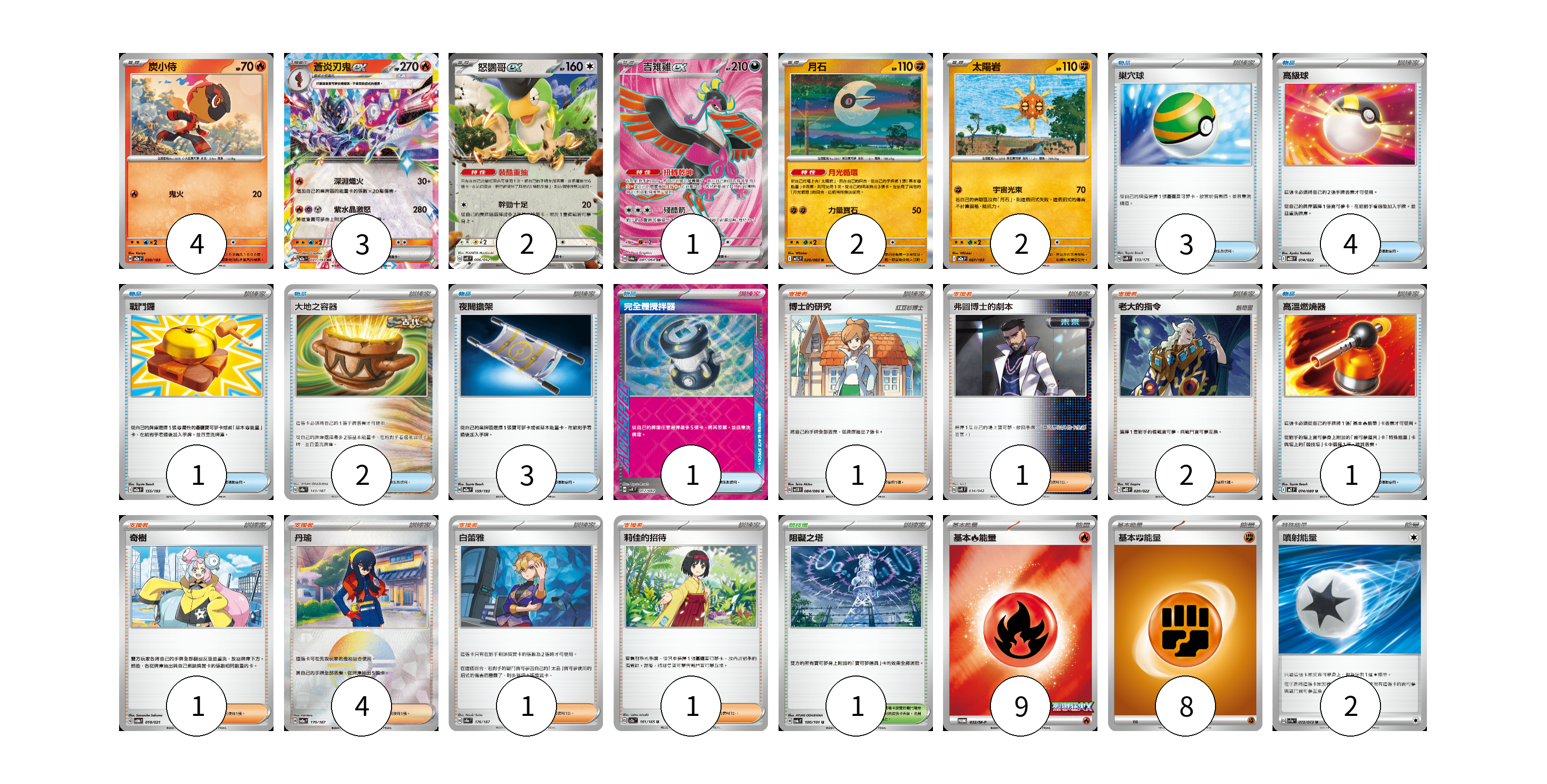牌組構築方案 以此牌組為基礎新構築牌組 顯示卡面 顯示列表 寶可夢卡(14) 4 3 2 1 2 2 物品卡(15) 3 4 1 2 3 1 1 支援者卡(11) 1 1 2 1 4 1 1 競技場卡(1) 1 能量卡(19) 9 8 2 寶可夢卡(14) 卡牌名稱 張數 卡牌名稱 張數 炭小侍 M2a 030/193 04 蒼炎刃鬼ex M2a 031/193 03 怒鸚哥ex SVK 006/042 02 吉雉雞ex SV6a 081/064 01 月石 M1L 026/063 02 太陽岩 M2a 087/193 02 物品卡(15) 卡牌名稱 張數 卡牌名稱 張數 巢穴球 SVM 133/175 03 高級球 MBD 014/022 04 戰鬥鑼 M2a 155/193 01 大地之容器 SV8a 143/187 02 夜間擔架 M2a 159/193 03 完全體攪拌器 SVK 017/042 01 高溫燃燒器 M2 074/080 01 支援者卡(11) 卡牌名稱 張數 卡牌名稱 張數 博士的研究 SV11B 084/086 01 弗圖博士的劇本 SVK 034/042 01 老大的指令 MBD 020/022 02 奇樹 SVOM 018/021 01 丹瑜 SV8a 170/187 04 白蕾雅 SV8a 176/187 01 莉佳的招待 SV2a 161/165 01 競技場卡(1) 卡牌名稱 張數 卡牌名稱 張數 阻礙之塔 SV6 100/101 01 能量卡(19) 卡牌名稱 張數 卡牌名稱 張數 基本【火】能量 M-P 032/M-P 09 基本【鬥】能量 SVHK FIG 08 噴射能量 SV1a 072/073 02 以此牌組為基礎新構築牌組 牌組編碼 KXjPZW-hBsGAK-yRsqBn copy 列印牌組單 牌組編碼已複製 分享至SNS