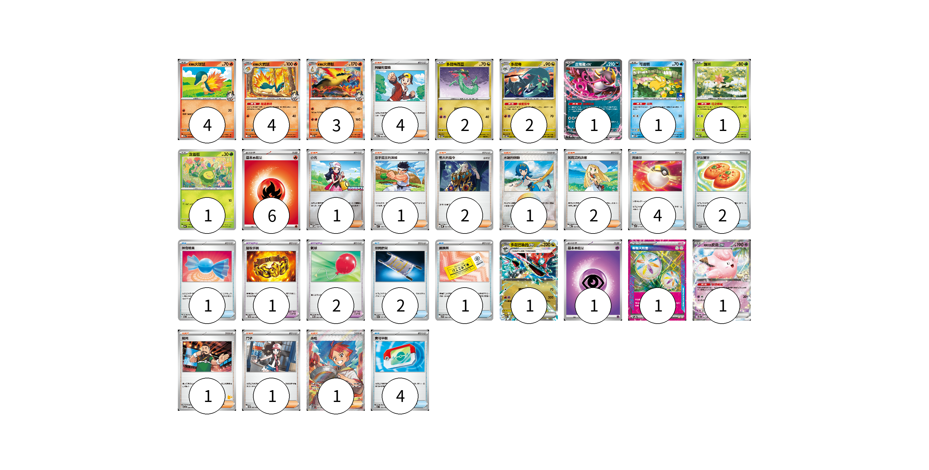 牌組構築方案 以此牌組為基礎新構築牌組 顯示卡面 顯示列表 寶可夢卡(21) 4 4 3 2 2 1 1 1 1 1 1 寶可夢道具(3) 1 2 物品卡(14) 4 2 1 2 1 4 支援者卡(14) 4 1 1 2 1 2 1 1 1 能量卡(8) 6 1 1 寶可夢卡(21) 卡牌名稱 張數 卡牌名稱 張數 <阿響的>火球鼠 SV9a 015/063 04 <阿響的>火岩鼠 SV9a 016/063 04 <阿響的>火爆獸 SV9a 017/063 03 多龍梅西亞 SV6 079/101 02 多龍奇 SV6 080/101 02 吉雉雞ex SVOD 004/020 01 可達鴨 SV-P 220/SV-P 01 謝米 SV9a 006/063 01 含羞苞 SV8a 001/187 01 多龍巴魯托ex MC 548/742 01 莉莉艾的皮皮ex SV9 033/100 01 寶可夢道具(3) 卡牌名稱 張數 卡牌名稱 張數 猛攻手鐲 SV11W 082/086 01 氣球 SV11B 082/086 02 物品卡(14) 卡牌名稱 張數 卡牌名稱 張數 高級球 SVHM 013/022 04 好友寶芬 SV5K 063/071 02 神奇糖果 SVEL 013/020 01 夜間擔架 SV6a 056/064 02 調換票 SV9 090/100 01 寶可平板 MC 662/742 04 支援者卡(14) 卡牌名稱 張數 卡牌名稱 張數 阿響的冒險 SV9a 063/063 04 小光 M-P 028/M-P 01 空手道王的演練 SVM 144/175 01 老大的指令 SVHK 022/022 02 水蓮的照顧 SV8a 168/187 01 莉莉艾的決意 MBG 022/022 02 裁判 SVI 059/066 01 鬥子 SV11W 085/086 01 赤松 SV7 123/102 01 能量卡(8) 卡牌名稱 張數 卡牌名稱 張數 基本【火】能量 M-P FIR 06 基本【超】能量 MC PSY 01 新衝天能量 SV5K 071/071 01 以此牌組為基礎新構築牌組 牌組編碼 KaFpgM-BBacvW-jOaYfn copy 列印牌組單 牌組編碼已複製 分享至SNS