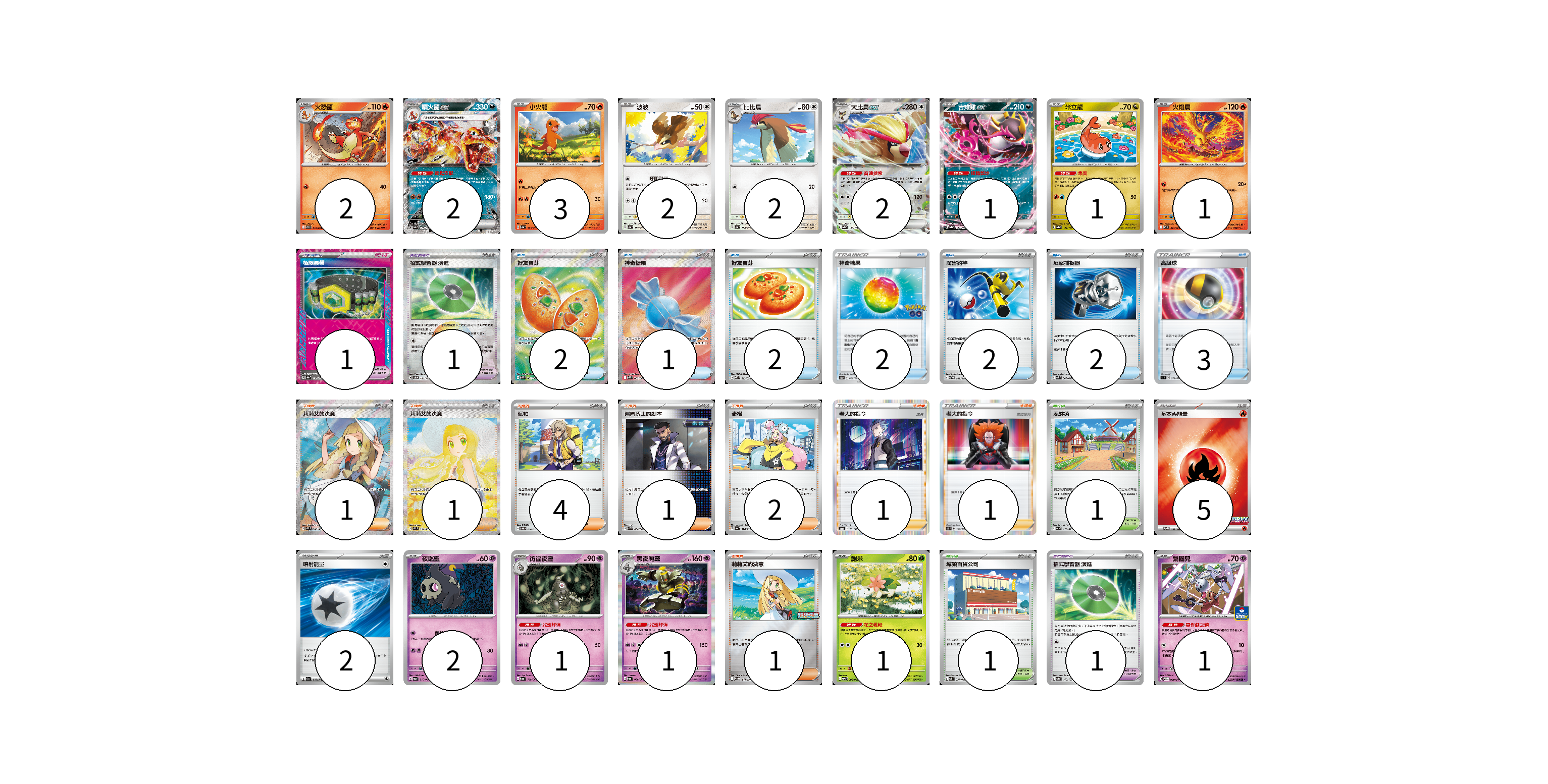 牌組構築方案 以此牌組為基礎新構築牌組 顯示卡面 顯示列表 寶可夢卡(22) 2 2 3 2 2 2 1 1 1 2 1 1 1 1 寶可夢道具(3) 1 1 1 物品卡(14) 2 1 2 2 2 2 3 支援者卡(12) 1 1 4 1 2 1 1 1 競技場卡(2) 1 1 能量卡(7) 5 2 寶可夢卡(22) 卡牌名稱 張數 卡牌名稱 張數 火恐龍 M2 012/080 02 噴火龍ex SV4a 115/190 02 小火龍 SV4a 025/190 03 波波 SV4a 137/190 02 比比鳥 SV4a 138/190 02 大比鳥ex SV4a 139/190 02 吉雉雞ex SV8a 104/187 01 米立龍 SV8a 121/187 01 火焰鳥 M2 014/080 01 夜巡靈 SV6a 018/064 02 彷徨夜靈 SV6a 019/064 01 黑夜魔靈 SV6a 020/064 01 謝米 SV9a 006/063 01 鑰圈兒 SV-P 089/SV-P 01 寶可夢道具(3) 卡牌名稱 張數 卡牌名稱 張數 極限腰帶 SV8a 159/187 01 招式學習器 演進 SV8a 160/187 01 招式學習器 演進 SV8a 160/187 01 物品卡(14) 卡牌名稱 張數 卡牌名稱 張數 好友寶芬 M1S 081/063 02 神奇糖果 M1S 082/063 01 好友寶芬 MBD 013/022 02 神奇糖果 S10b 066/071 02 厲害釣竿 SVTG 009/019 02 反擊捕捉器 SVK 009/042 02 高級球 SI 375/414 03 支援者卡(12) 卡牌名稱 張數 卡牌名稱 張數 莉莉艾的決意 M1L 086/063 01 莉莉艾的決意 M1L 091/063 01 派帕 SVOD 018/020 04 弗圖博士的劇本 SVK 034/042 01 奇樹 SV4a 174/190 02 老大的指令(赤日) S12a 161/172 01 老大的指令(弗拉達利) S8b 158/184 01 莉莉艾的決意 M-P 011/M-P 01 競技場卡(2) 卡牌名稱 張數 卡牌名稱 張數 深缽鎮 SV1a 070/073 01 城鎮百貨公司 SVK 037/042 01 能量卡(7) 卡牌名稱 張數 卡牌名稱 張數 基本【火】能量 M-P 032/M-P 05 噴射能量 SV1a 072/073 02 以此牌組為基礎新構築牌組 牌組編碼 KaIlEq-cMufsY-zAnzIm copy 列印牌組單 牌組編碼已複製 分享至SNS
