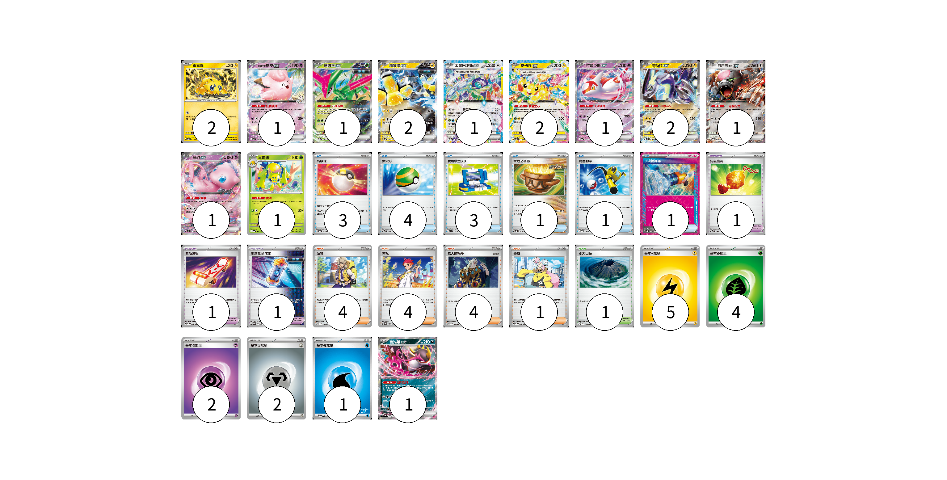 牌組構築方案 以此牌組為基礎新構築牌組 顯示卡面 顯示列表 寶可夢卡(16) 2 1 1 2 1 2 1 2 1 1 1 1 寶可夢道具(3) 1 1 1 物品卡(13) 3 4 3 1 1 1 支援者卡(13) 4 4 4 1 競技場卡(1) 1 能量卡(14) 5 4 2 2 1 寶可夢卡(16) 卡牌名稱 張數 卡牌名稱 張數 電電蟲 SV7 032/102 02 莉莉艾的皮皮ex SV9 033/100 01 鐵斑葉ex SV8a 016/187 01 鐵臂膀ex SV8a 054/187 02 太樂巴戈斯ex SV8a 136/187 01 皮卡丘ex SV8 033/106 02 拉帝亞斯ex SV7a 019/064 01 密勒頓ex SV4a 071/190 02 月月熊 赫月 ex SV5a 052/066 01 夢幻ex SV4a 076/190 01 電蜘蛛 SV6a 002/064 01 吉雉雞ex SV8a 104/187 01 寶可夢道具(3) 卡牌名稱 張數 卡牌名稱 張數 勇氣護符 SVM 142/175 01 緊急滑板 SVOD 015/020 01 驅勁能量 未來 SV8a 158/187 01 物品卡(13) 卡牌名稱 張數 卡牌名稱 張數 高級球 SVOD 012/020 03 巢穴球 SVM 133/175 04 寶可裝置3.0 SVK 021/042 03 大地之容器 SV8a 143/187 01 厲害釣竿 SVOD 010/020 01 頂尖捕捉器 SV8a 148/187 01 支援者卡(13) 卡牌名稱 張數 卡牌名稱 張數 派帕 SVOD 018/020 04 赤松 SV8a 163/187 04 老大的指令 SVOM 020/021 04 奇樹 SVOD 016/020 01 競技場卡(1) 卡牌名稱 張數 卡牌名稱 張數 引力山岳 SV8 106/106 01 能量卡(14) 卡牌名稱 張數 卡牌名稱 張數 基本【雷】能量 SVTR LIG 05 基本【草】能量 SVTM GRA 04 基本【超】能量 SVTS PSY 02 基本【鋼】能量 SVTH MET 02 基本【水】能量 SVI WAT 01 以此牌組為基礎新構築牌組 牌組編碼 KapFHi-beHJDa-TLlvZd copy 列印牌組單 牌組編碼已複製 分享至SNS