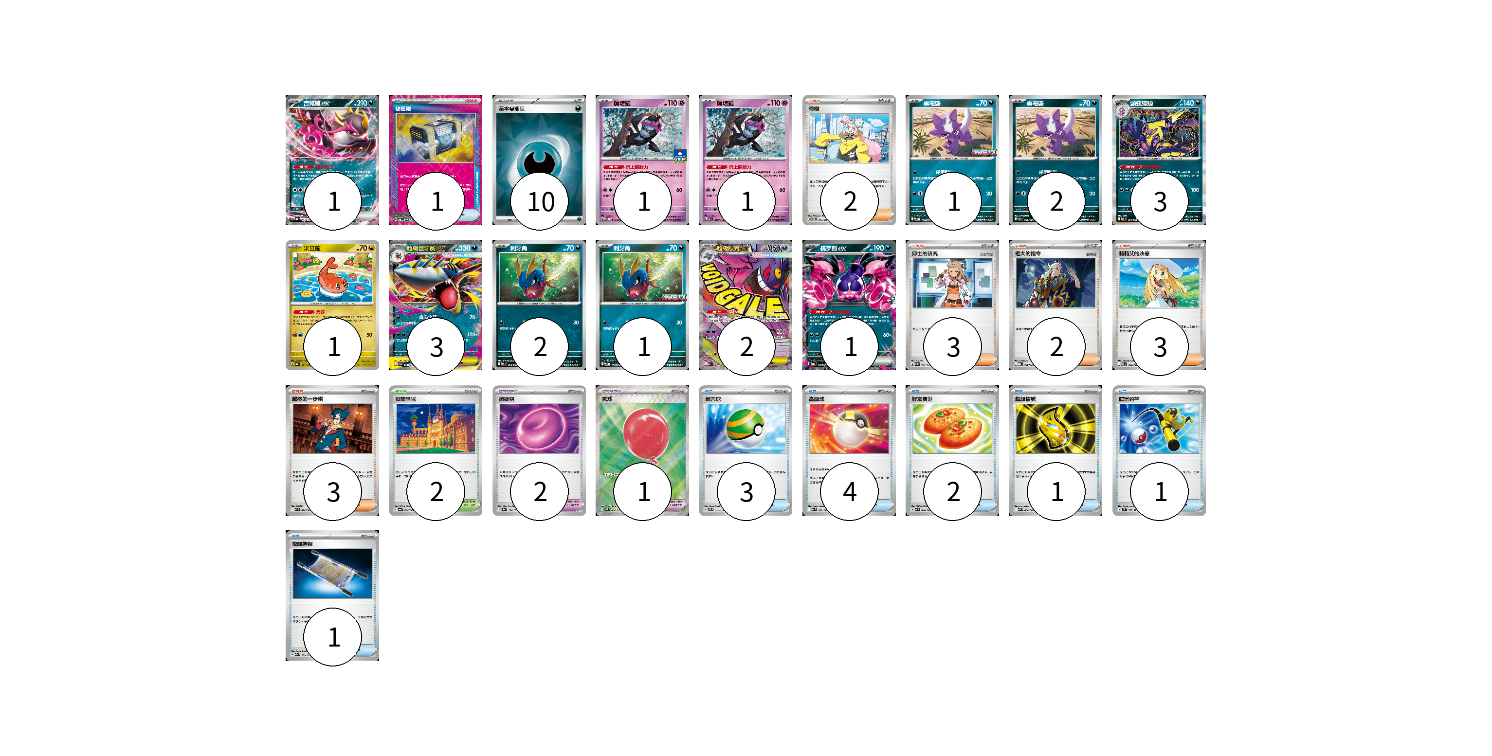 牌組構築方案 以此牌組為基礎新構築牌組 顯示卡面 顯示列表 寶可夢卡(19) 1 1 1 1 2 3 1 3 2 1 2 1 寶可夢道具(3) 2 1 物品卡(13) 1 3 4 2 1 1 1 支援者卡(13) 2 3 2 3 3 競技場卡(2) 2 能量卡(10) 10 寶可夢卡(19) 卡牌名稱 張數 卡牌名稱 張數 吉雉雞ex SV8a 104/187 01 願增猿 M-P 014/M-P 01 願增猿 MC 358/742 01 毒電嬰 M-P 027/M-P 01 毒電嬰 M2 056/080 02 顫弦蠑螈 M2 057/080 03 米立龍 SV8a 121/187 01 超級巨牙鯊ex M2 051/080 03 利牙魚 M2 050/080 02 利牙魚 M-P 026/M-P 01 超級耿鬼ex M2a 230/193 02 桃歹郎ex MBG 009/022 01 寶可夢道具(3) 卡牌名稱 張數 卡牌名稱 張數 鎖鏈糬 SV8a 154/187 02 氣球 M1L 084/063 01 物品卡(13) 卡牌名稱 張數 卡牌名稱 張數 秘密箱 SV6 092/101 01 巢穴球 SVTR 013/021 03 高級球 MC 651/742 04 好友寶芬 MC 648/742 02 超級信號 M1S 058/063 01 厲害釣竿 SV2P 066/071 01 夜間擔架 M2a 159/193 01 支援者卡(13) 卡牌名稱 張數 卡牌名稱 張數 奇樹 SVTG 017/019 02 博士的研究 SVK 032/042 03 老大的指令 MBD 020/022 02 莉莉艾的決意 MC 729/742 03 越橘的一步棋 M2 076/080 03 競技場卡(2) 卡牌名稱 張數 卡牌名稱 張數 夜間學院 SV6a 064/064 02 能量卡(10) 卡牌名稱 張數 卡牌名稱 張數 基本【惡】能量 SVM DAR 10 以此牌組為基礎新構築牌組 牌組編碼 KcnRGH-IvepRs-vyFPnq copy 列印牌組單 牌組編碼已複製 分享至SNS