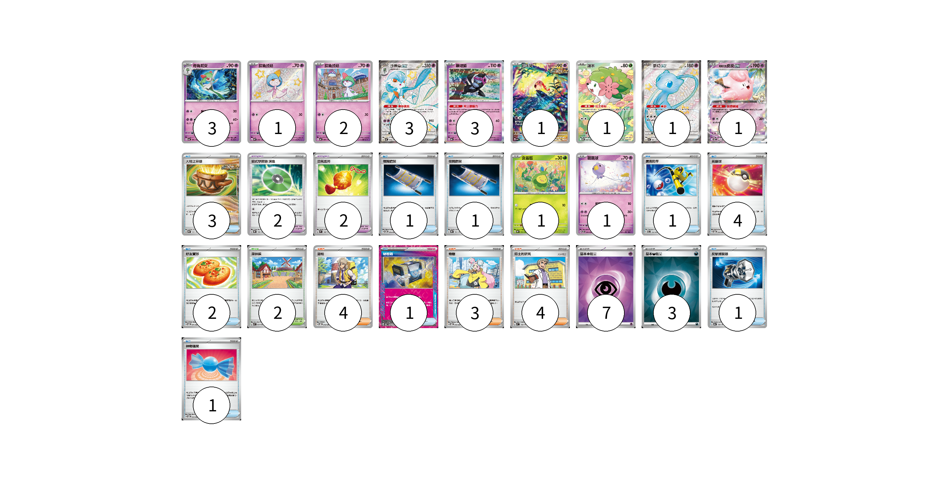 牌組構築方案 以此牌組為基礎新構築牌組 顯示卡面 顯示列表 寶可夢卡(19) 3 1 2 3 3 1 1 1 1 1 1 1 寶可夢道具(4) 2 2 物品卡(14) 3 1 1 4 2 1 1 1 支援者卡(11) 4 3 4 競技場卡(2) 2 能量卡(10) 7 3 寶可夢卡(19) 卡牌名稱 張數 卡牌名稱 張數 奇魯莉安 SV4a 081/190 03 拉魯拉絲 SV4a 258/190 01 拉魯拉絲 SV4a 080/190 02 沙奈朵ex SV4a 328/190 03 願增猿 SV8a 075/187 03 吼叫尾 SV4K 071/066 01 謝米 SV9a 066/063 01 夢幻ex SV4a 327/190 01 莉莉艾的皮皮ex SV9 033/100 01 含羞苞 SV8a 001/187 01 飄飄球 SVTS 005/022 01 厲害釣竿 SVEL 010/020 01 寶可夢道具(4) 卡牌名稱 張數 卡牌名稱 張數 招式學習器 演進 SV8a 160/187 02 勇氣護符 SVM 142/175 02 物品卡(14) 卡牌名稱 張數 卡牌名稱 張數 大地之容器 SV8a 143/187 03 夜間擔架 SVOM 016/021 01 夜間擔架 SV8a 151/187 01 高級球 SVOD 012/020 04 好友寶芬 SVOD 011/020 02 秘密箱 SV6 092/101 01 反擊捕捉器 SV8a 139/187 01 神奇糖果 SVOD 013/020 01 支援者卡(11) 卡牌名稱 張數 卡牌名稱 張數 派帕 SVOD 018/020 04 奇樹 SVOD 016/020 03 博士的研究 SVM 162/175 04 競技場卡(2) 卡牌名稱 張數 卡牌名稱 張數 深缽鎮 SVK 039/042 02 能量卡(10) 卡牌名稱 張數 卡牌名稱 張數 基本【超】能量 SVOD PSY 07 基本【惡】能量 SVOM DAR 03 以此牌組為基礎新構築牌組 牌組編碼 KgTRUo-IYVFlv-YeDrth copy 列印牌組單 牌組編碼已複製 分享至SNS