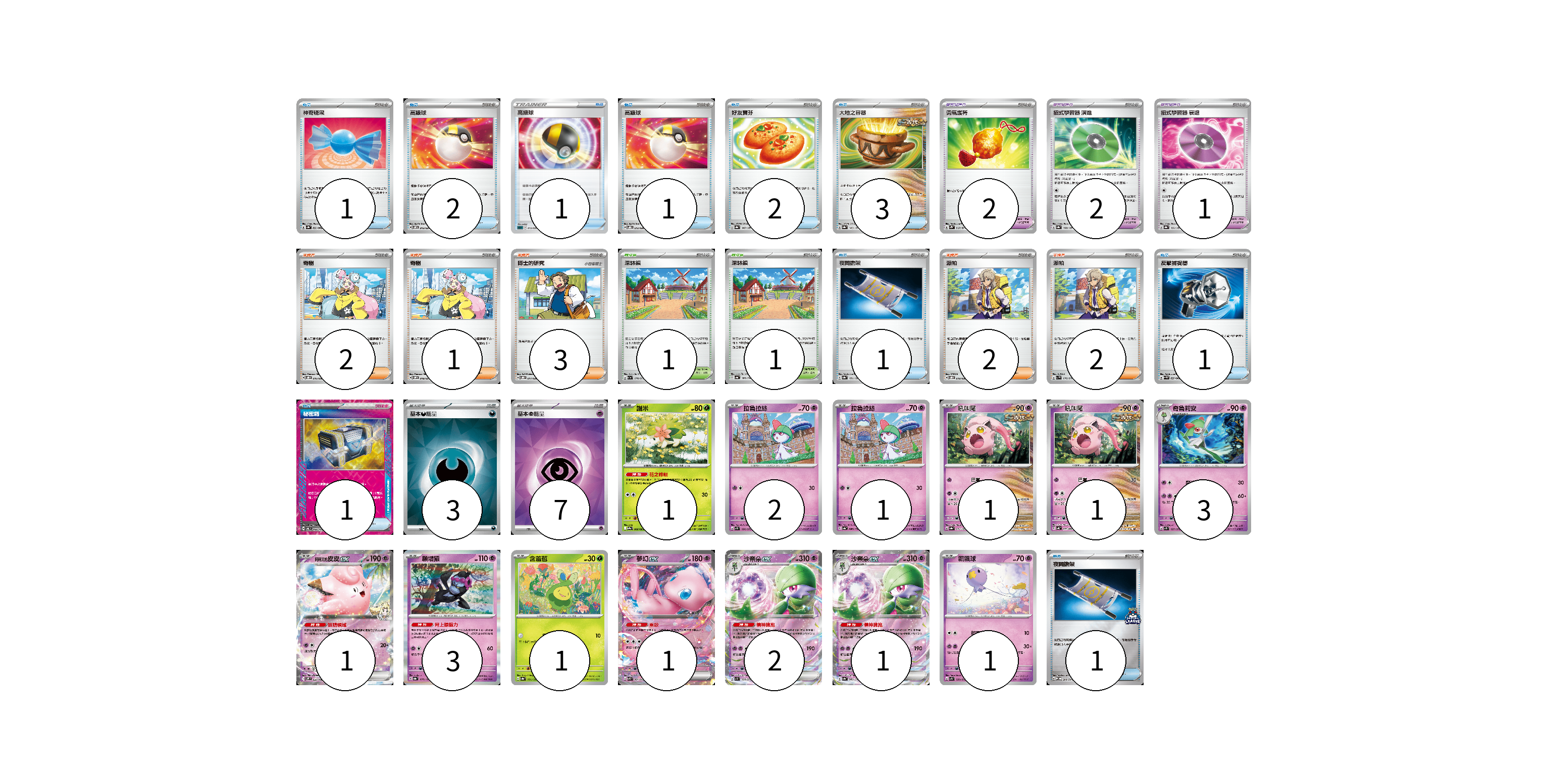 牌組構築方案 以此牌組為基礎新構築牌組 顯示卡面 顯示列表 寶可夢卡(19) 1 2 1 1 1 3 1 3 1 1 2 1 1 寶可夢道具(5) 2 2 1 物品卡(14) 1 2 1 1 2 3 1 1 1 1 支援者卡(10) 2 1 3 2 2 競技場卡(2) 1 1 能量卡(10) 3 7 寶可夢卡(19) 卡牌名稱 張數 卡牌名稱 張數 謝米 SV9a 006/063 01 拉魯拉絲 SV1S 026/078 02 拉魯拉絲 SV4a 080/190 01 吼叫尾 SV8a 071/187 01 吼叫尾 SV4K 032/066 01 奇魯莉安 SV1S 027/078 03 莉莉艾的皮皮ex SV9 033/100 01 願增猿 SV8a 075/187 03 含羞苞 SV8a 001/187 01 夢幻ex SVK 001/042 01 沙奈朵ex SV1S 028/078 02 沙奈朵ex SV4a 082/190 01 飄飄球 SV1S 029/078 01 寶可夢道具(5) 卡牌名稱 張數 卡牌名稱 張數 勇氣護符 SV2D 067/071 02 招式學習器 演進 SV8a 160/187 02 招式學習器 衰退 SV8a 161/187 01 物品卡(14) 卡牌名稱 張數 卡牌名稱 張數 神奇糖果 SV3a 053/062 01 高級球 SVOM 013/021 02 高級球 SLD 013/020 01 高級球 SVOD 012/020 01 好友寶芬 SV8a 147/187 02 大地之容器 SV8a 143/187 03 夜間擔架 SV8a 151/187 01 反擊捕捉器 SV4M 059/066 01 秘密箱 SV6 092/101 01 夜間擔架 SV-P 204/SV-P 01 支援者卡(10) 卡牌名稱 張數 卡牌名稱 張數 奇樹 SVOD 016/020 02 奇樹 SVOM 018/021 01 博士的研究 SVOD 017/020 03 派帕 SVOD 018/020 02 派帕 SV1V 076/078 02 競技場卡(2) 卡牌名稱 張數 卡牌名稱 張數 深缽鎮 SV1a 070/073 01 深缽鎮 SV4a 185/190 01 能量卡(10) 卡牌名稱 張數 卡牌名稱 張數 基本【惡】能量 SVOM DAR 03 基本【超】能量 SVOD PSY 07 以此牌組為基礎新構築牌組 牌組編碼 KghCQN-UPQAeR-AtNkxS copy 列印牌組單 牌組編碼已複製 分享至SNS