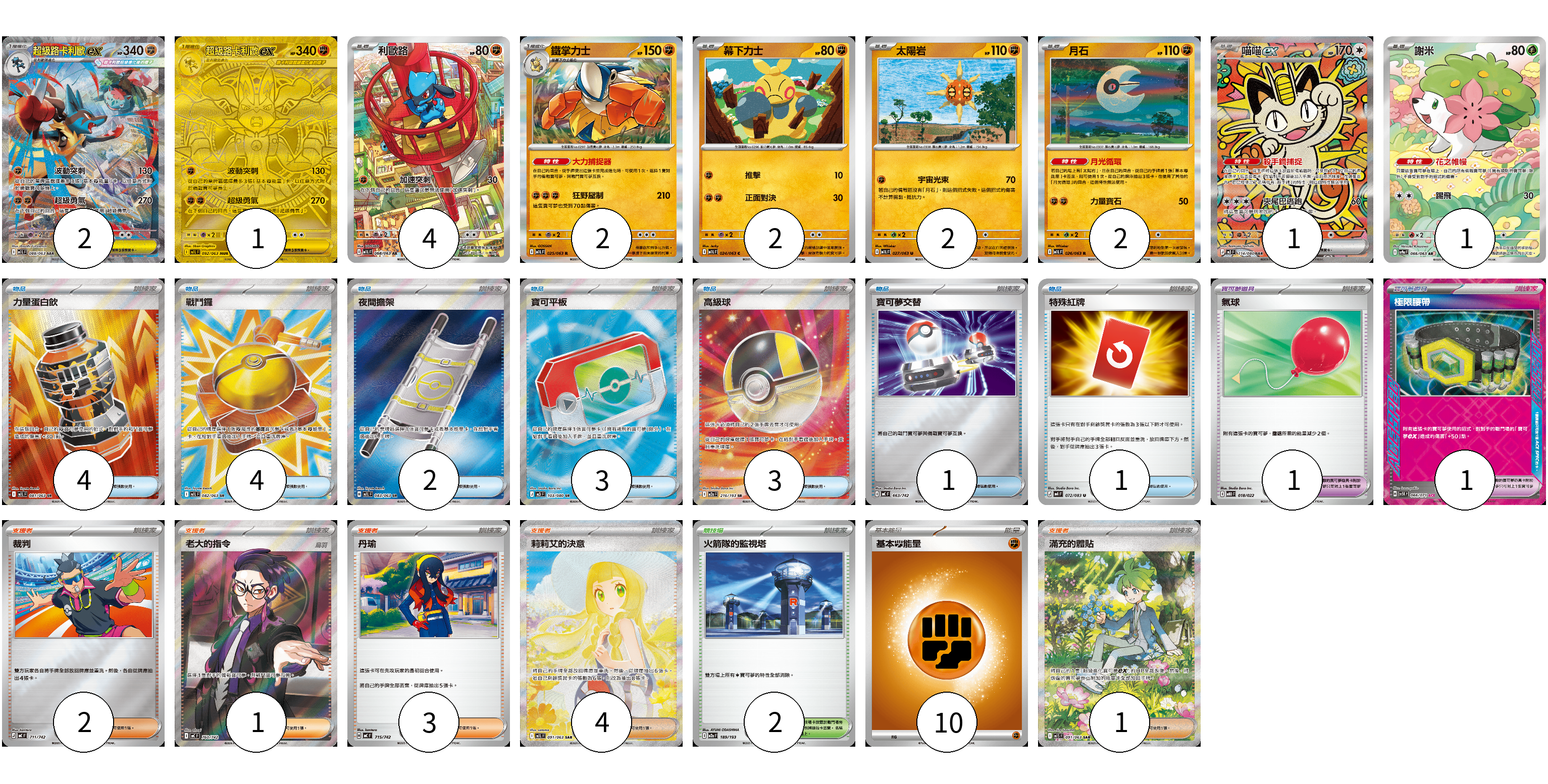 牌組構築方案 以此牌組為基礎新構築牌組 顯示卡面 顯示列表 寶可夢卡(17) 2 1 4 2 2 2 2 1 1 寶可夢道具(1) 1 物品卡(19) 4 4 2 3 3 1 1 1 支援者卡(11) 2 1 3 4 1 競技場卡(2) 2 能量卡(10) 10 寶可夢卡(17) 卡牌名稱 張數 卡牌名稱 張數 超級路卡利歐ex M1L 088/063 02 超級路卡利歐ex M1L 092/063 01 利歐路 M1L 068/063 04 鐵掌力士 M1L 025/063 02 幕下力士 M1L 024/063 02 太陽岩 M1L 027/063 02 月石 M1L 026/063 02 喵喵ex M3 114/080 01 謝米 SV9a 066/063 01 寶可夢道具(1) 卡牌名稱 張數 卡牌名稱 張數 極限腰帶 SV5K 066/071 01 物品卡(19) 卡牌名稱 張數 卡牌名稱 張數 力量蛋白飲 M1L 081/063 04 戰鬥鑼 M1L 082/063 04 夜間擔架 M1L 083/063 02 寶可平板 M3 103/080 03 高級球 M2a 216/193 03 寶可夢交替 MC 663/742 01 特殊紅牌 M4 072/083 01 氣球 MBD 018/022 01 支援者卡(11) 卡牌名稱 張數 卡牌名稱 張數 裁判 MC 711/742 02 老大的指令(烏羽) MC 760/742 01 丹瑜 MC 715/742 03 莉莉艾的決意 M1L 091/063 04 滿充的體貼 M1S 091/063 01 競技場卡(2) 卡牌名稱 張數 卡牌名稱 張數 火箭隊的監視塔 M2a 189/193 02 能量卡(10) 卡牌名稱 張數 卡牌名稱 張數 基本【鬥】能量 MC FIG 10 以此牌組為基礎新構築牌組 牌組編碼 KhEDwI-QWkQzV-vBpiPh copy 列印牌組單 牌組編碼已複製 分享至SNS
